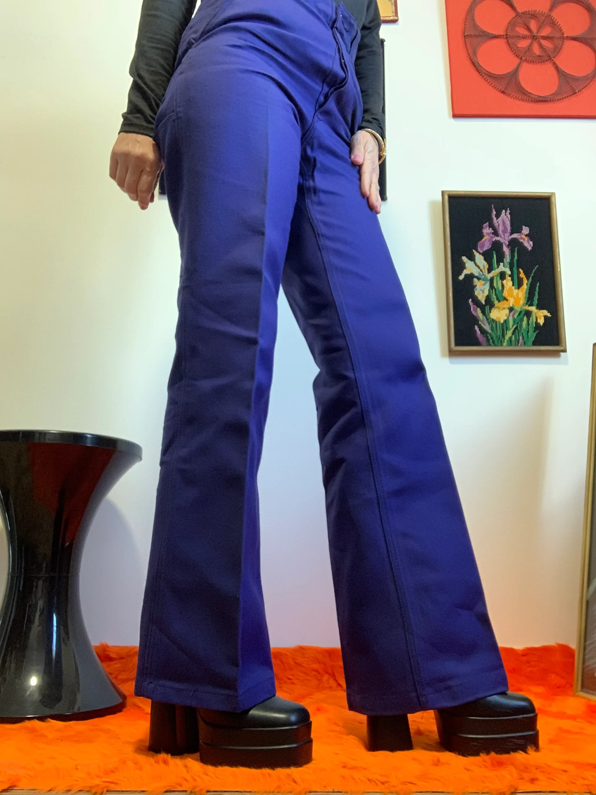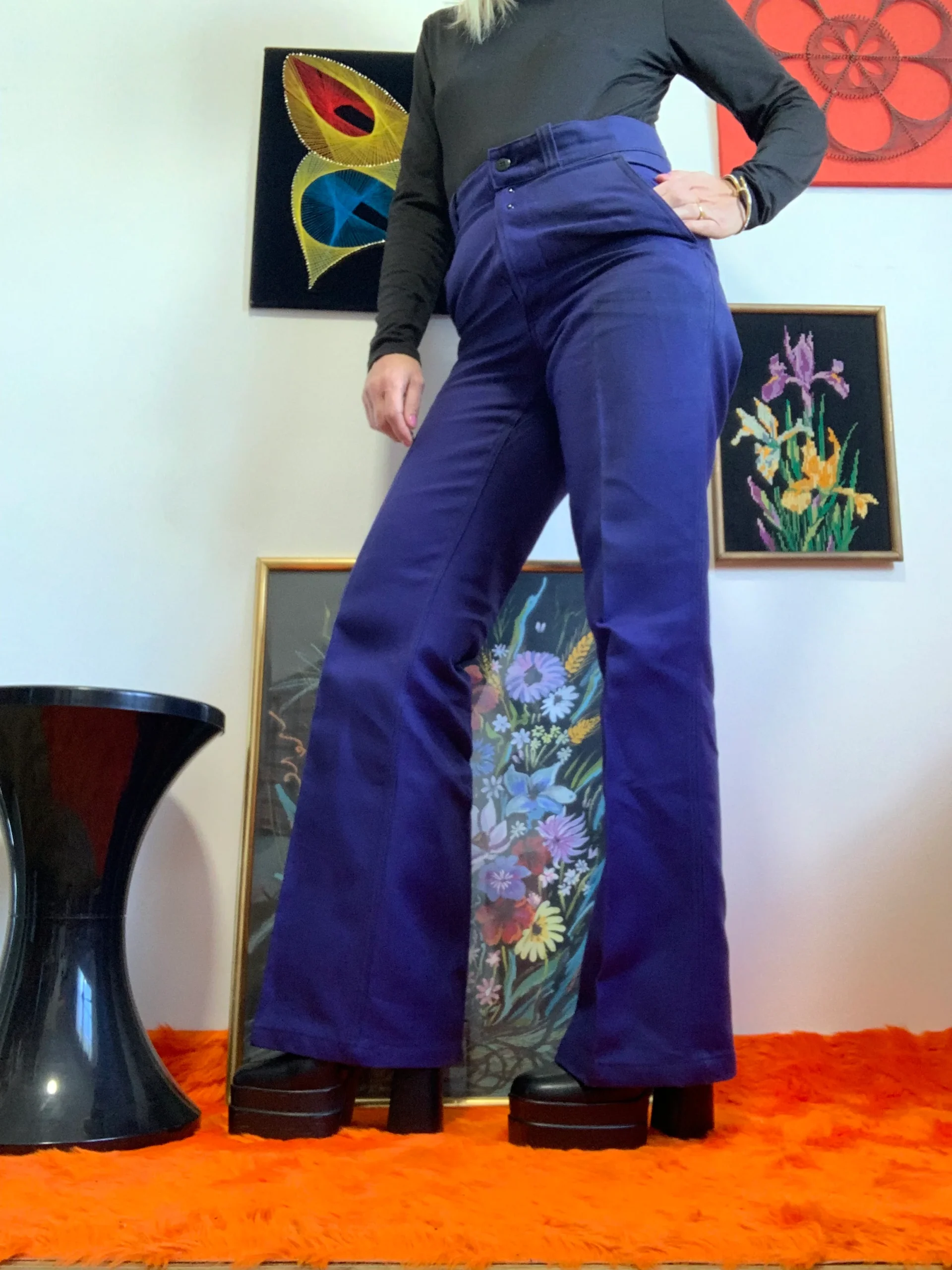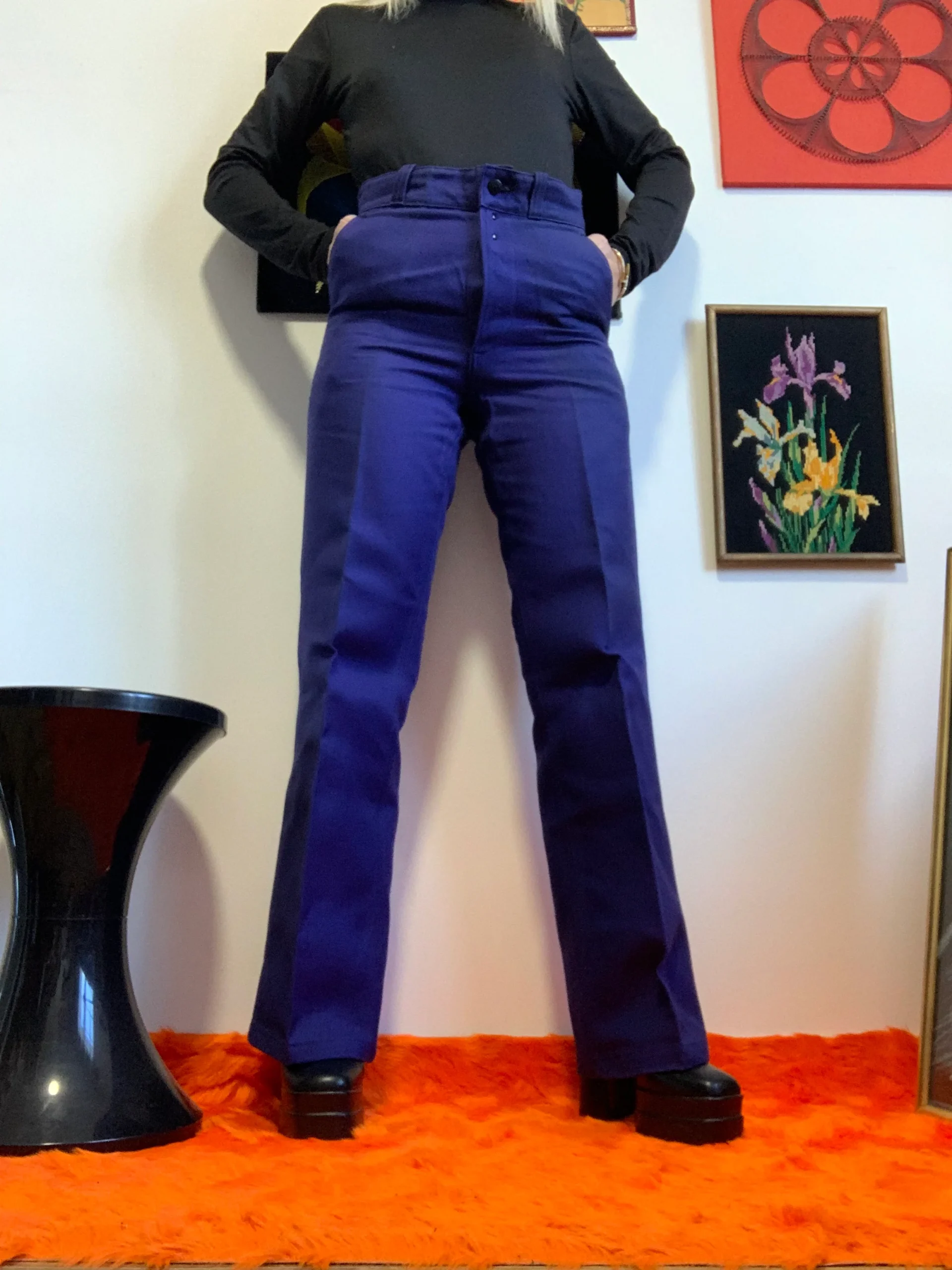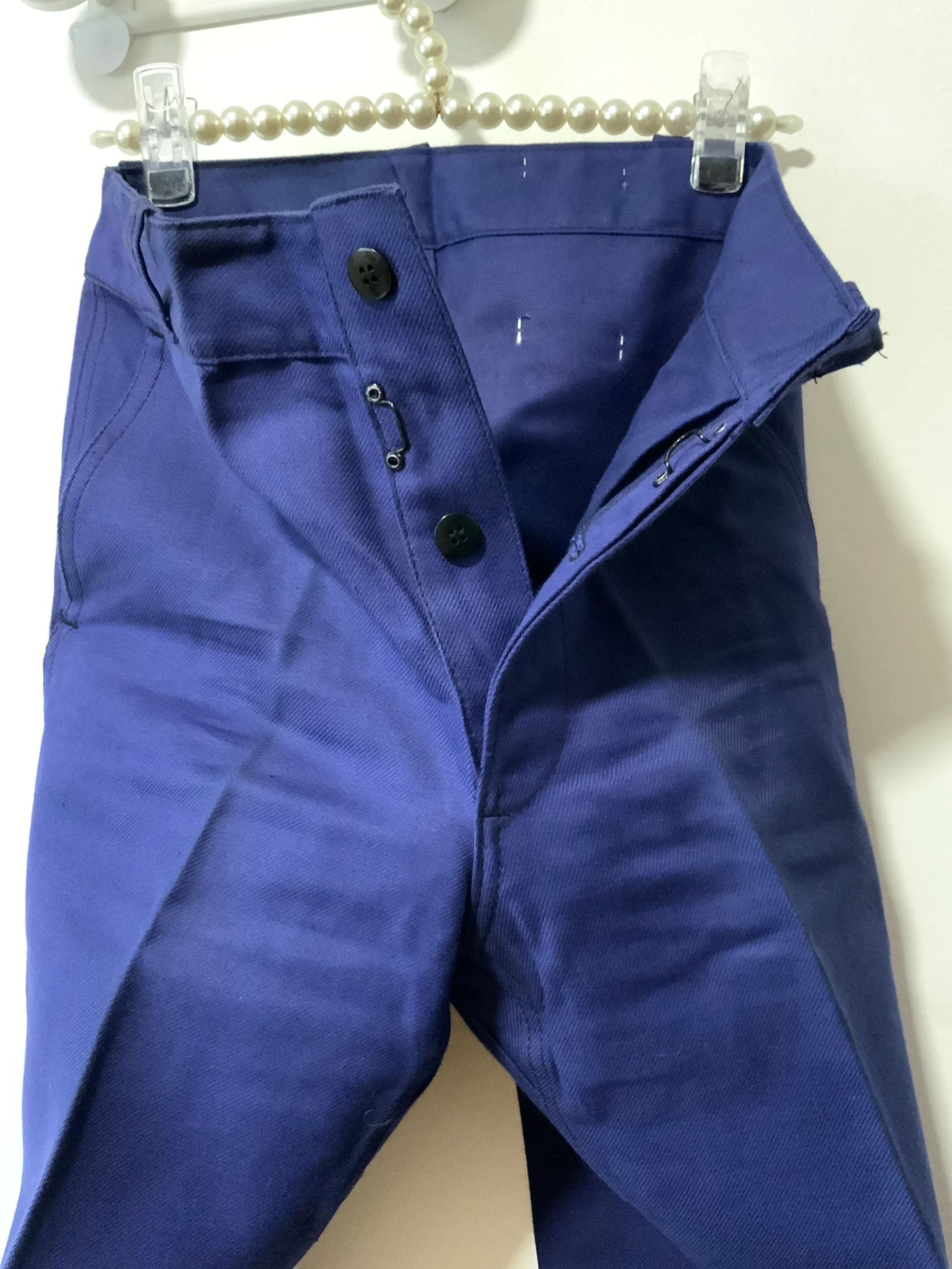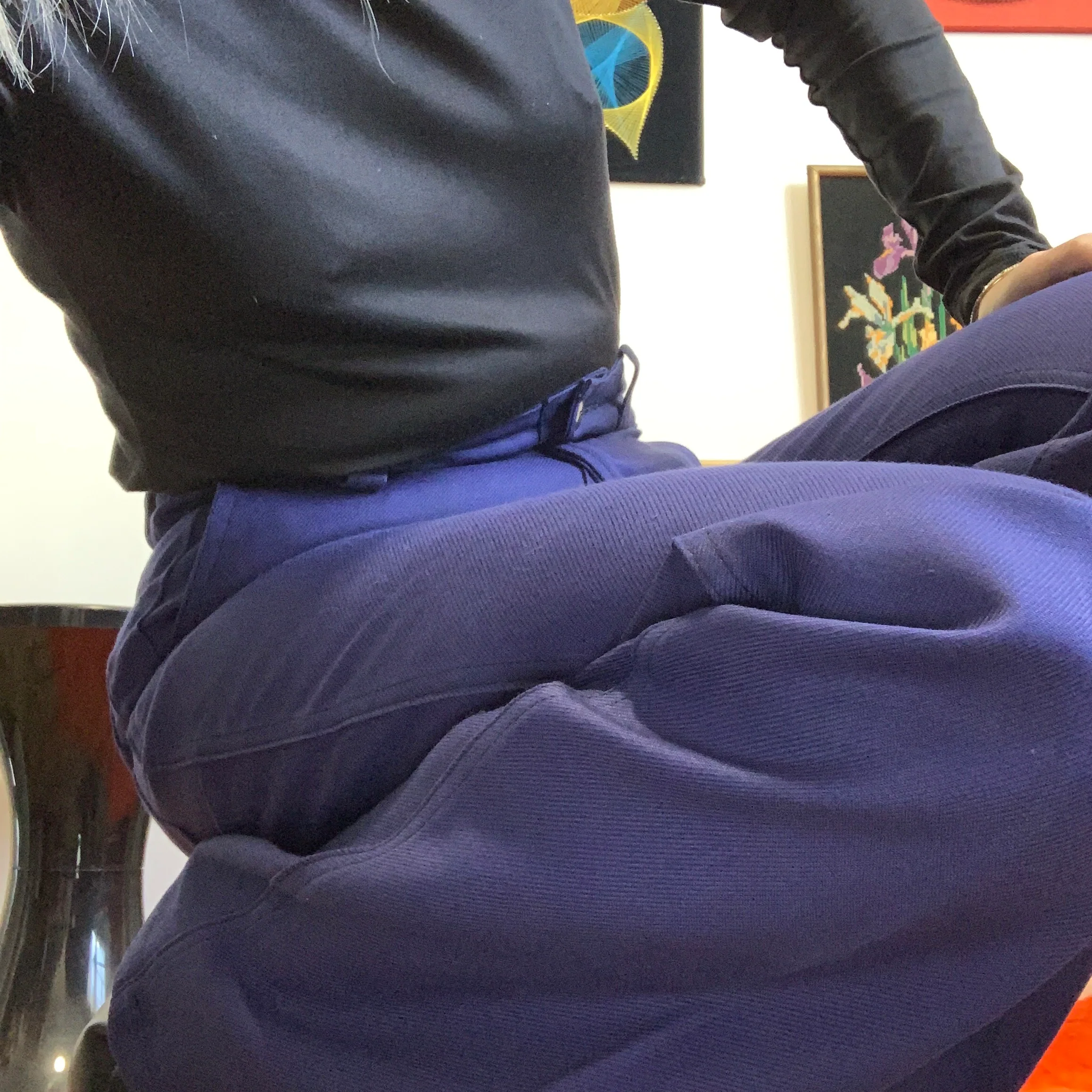 Taille haute, plis devant, Pieds revolver largeur en bas 25 centimètres , haut près du corps plaqué, 1 poche derrière et 2 poches sur les côtés, fermeture boutons et grosses agrafes métal noir.