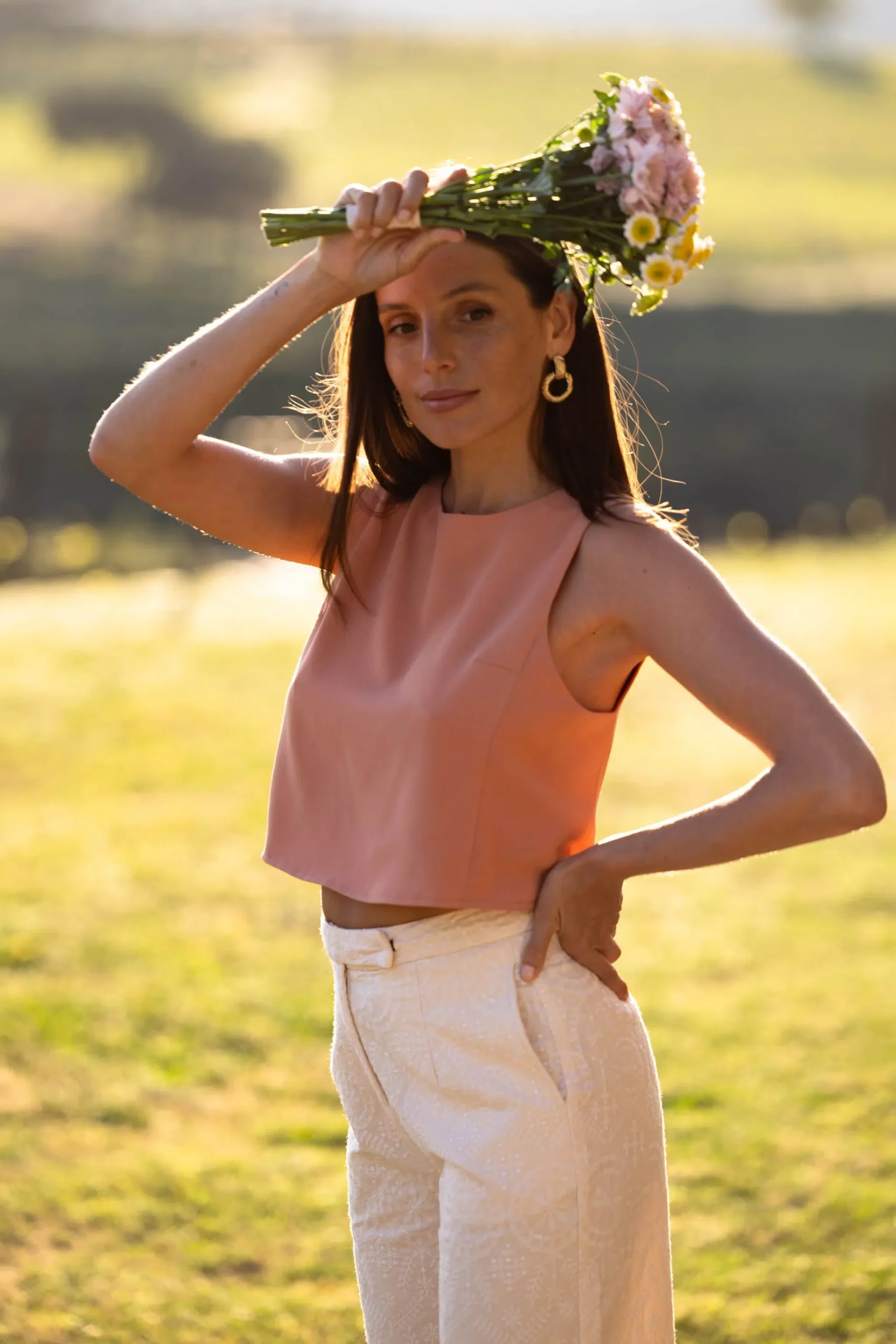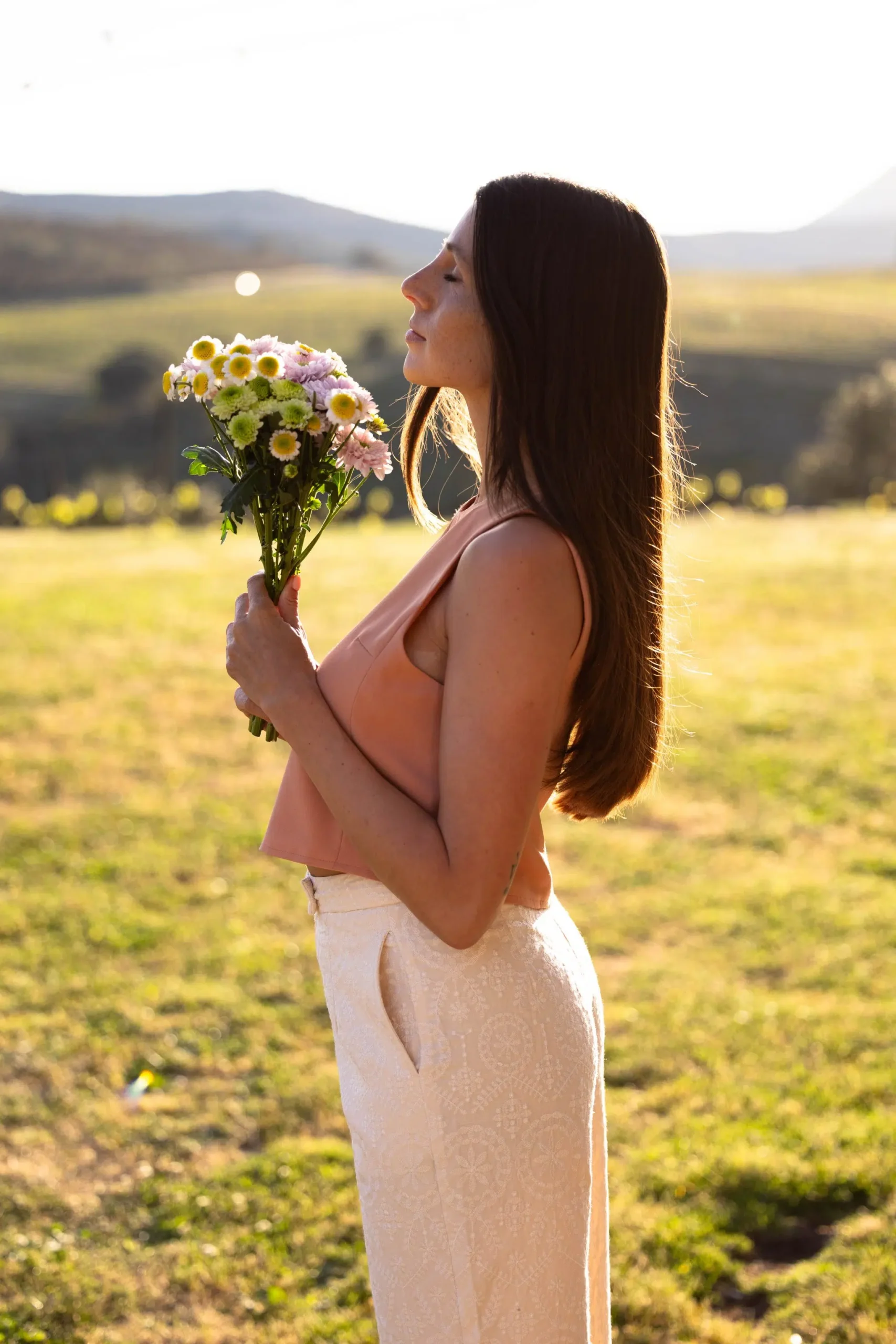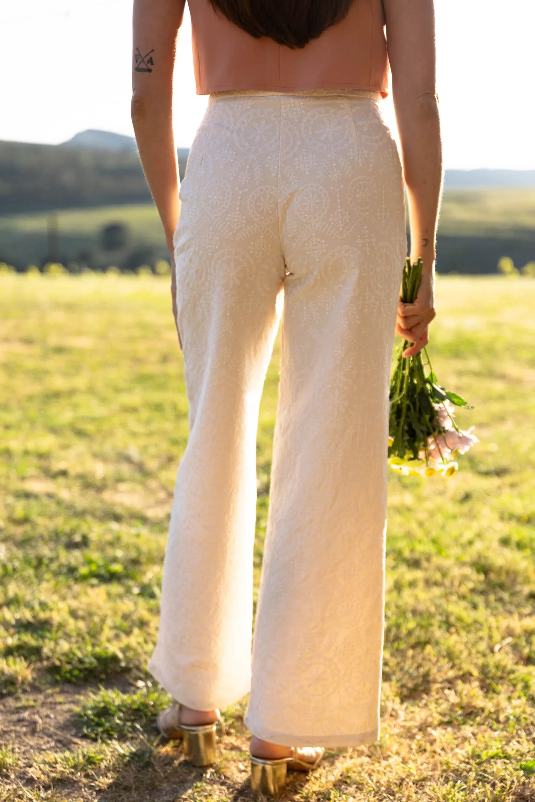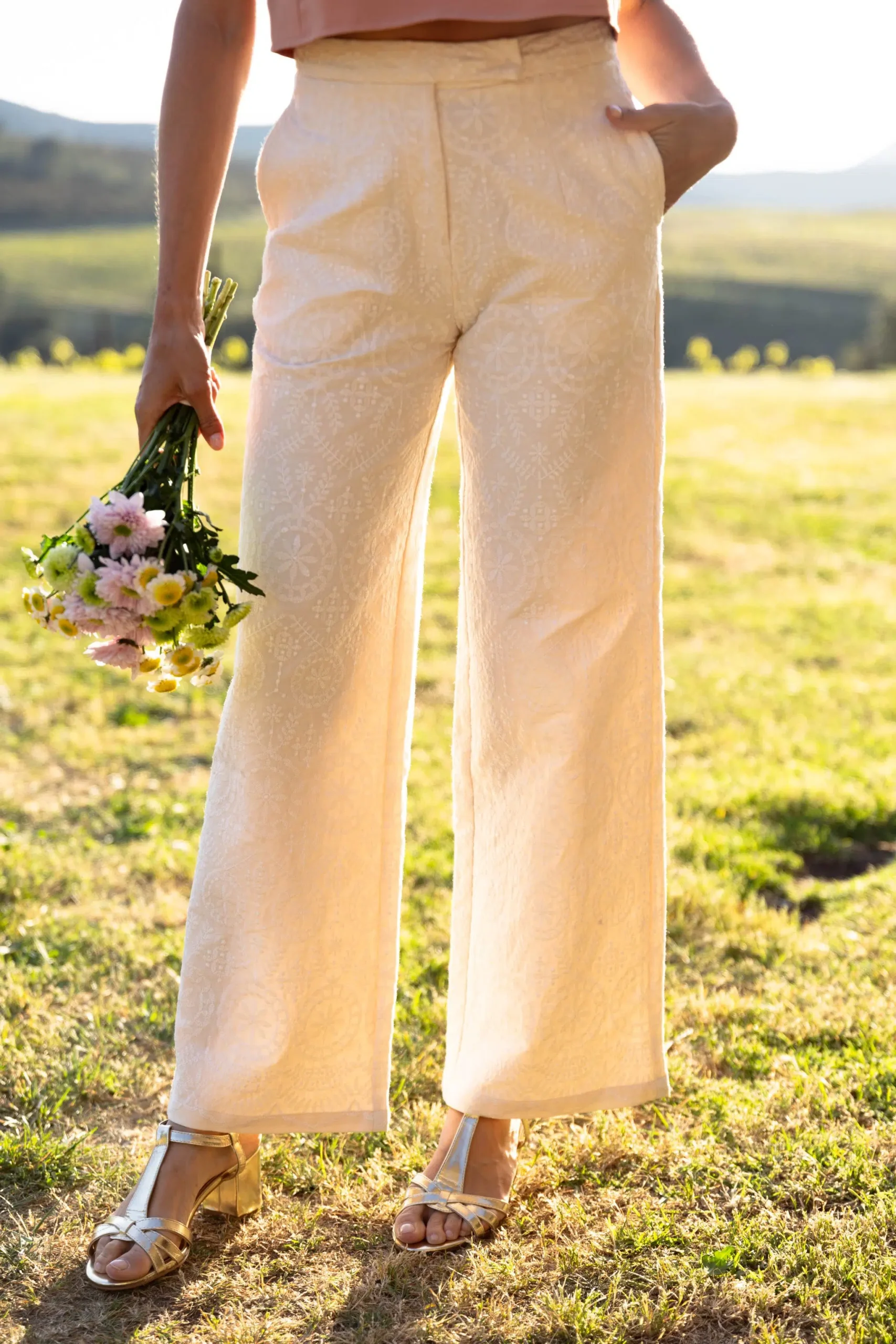 – Pantalon droit – Taille haute – Broderies florales blanches – Deux poches avant – Fermeture discrète par bouton et zip – Passants pour ceinture – Couleur : beige rosé et blanc
