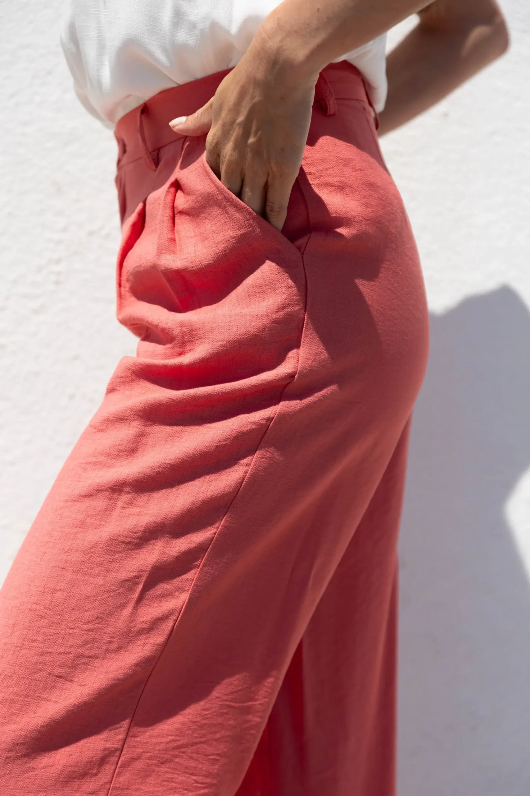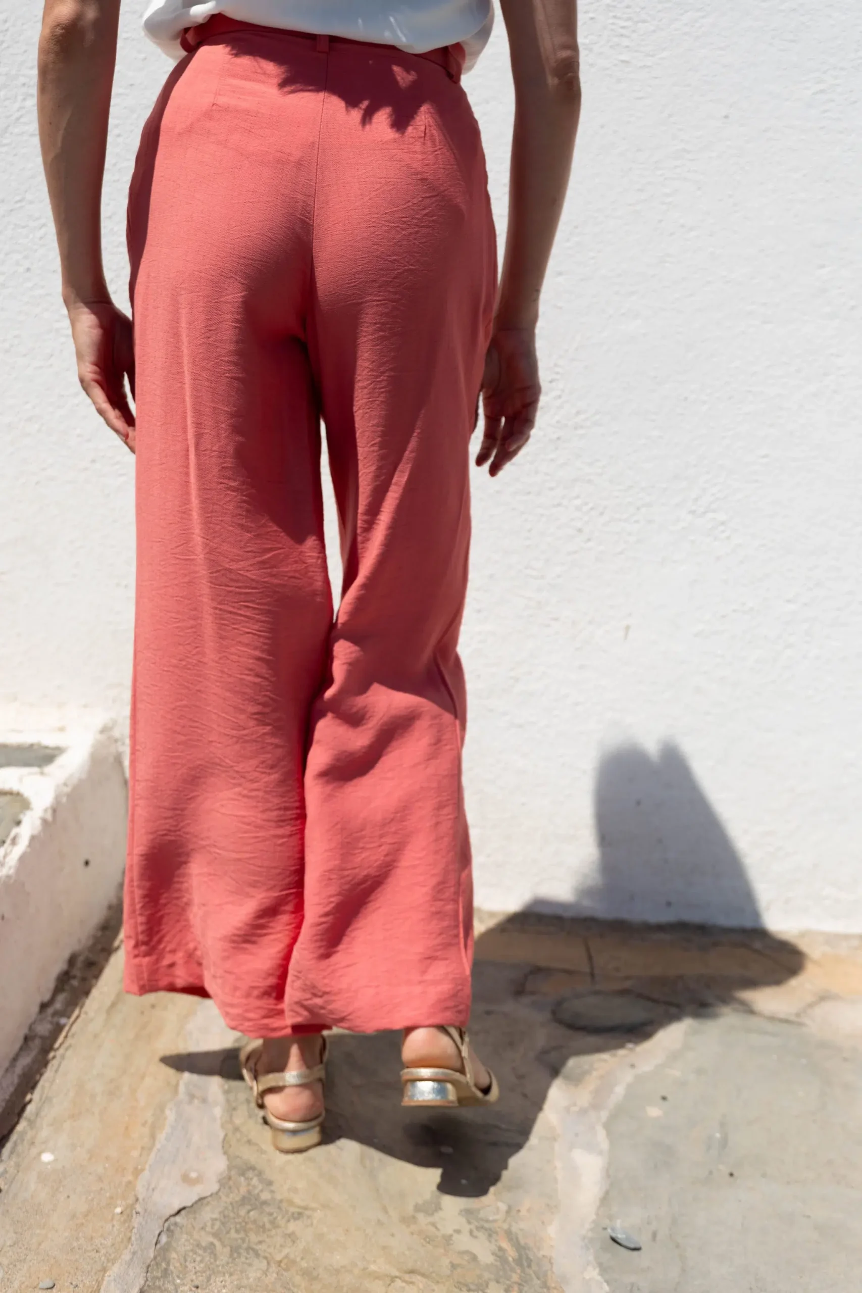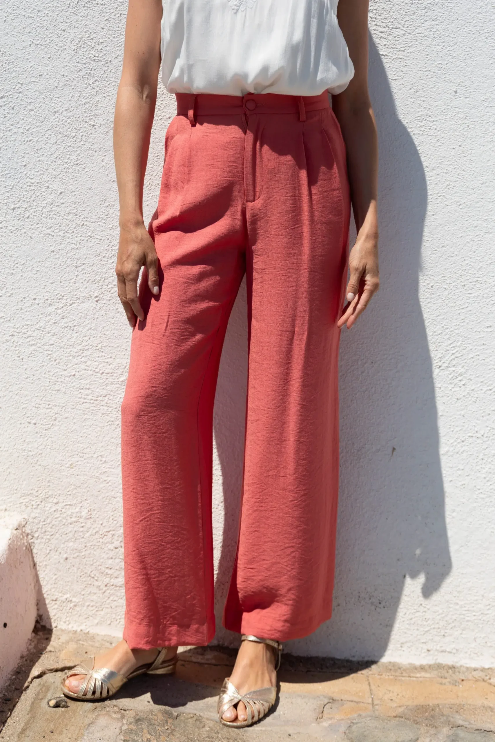 – Pantalon tailleur fluide – Taille haute – Deux poches avant – Passants pour ceinture – Fermeture par zip et bouton recouvert – Couleur : rose terracotta