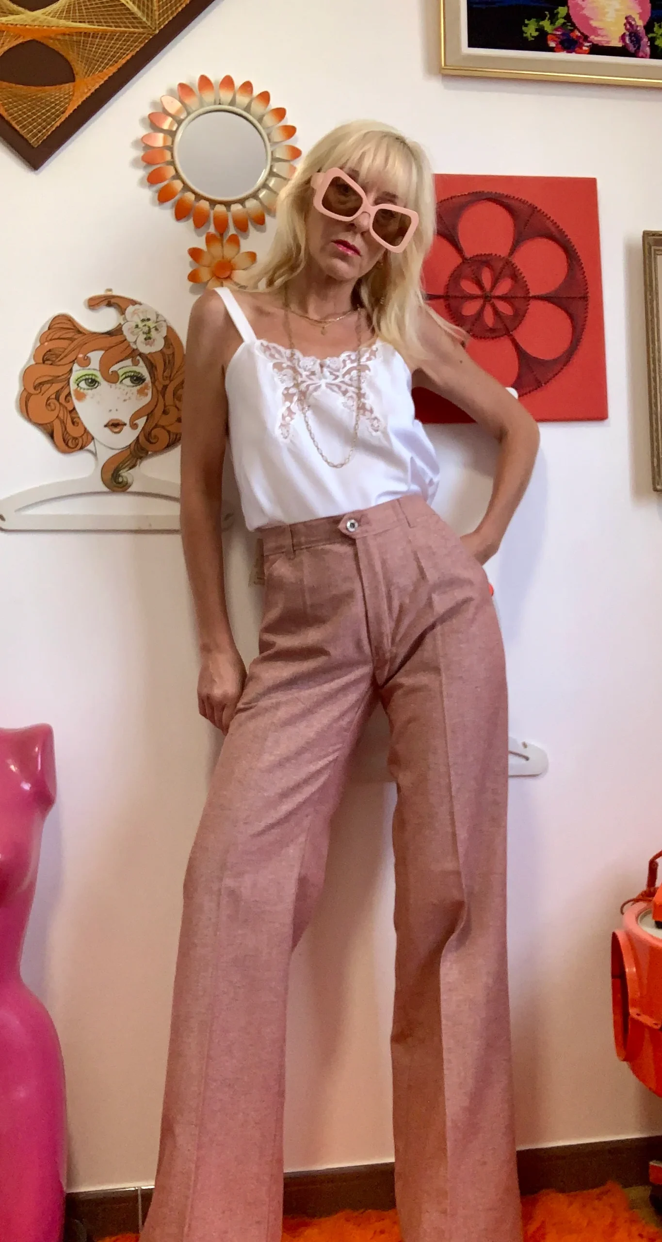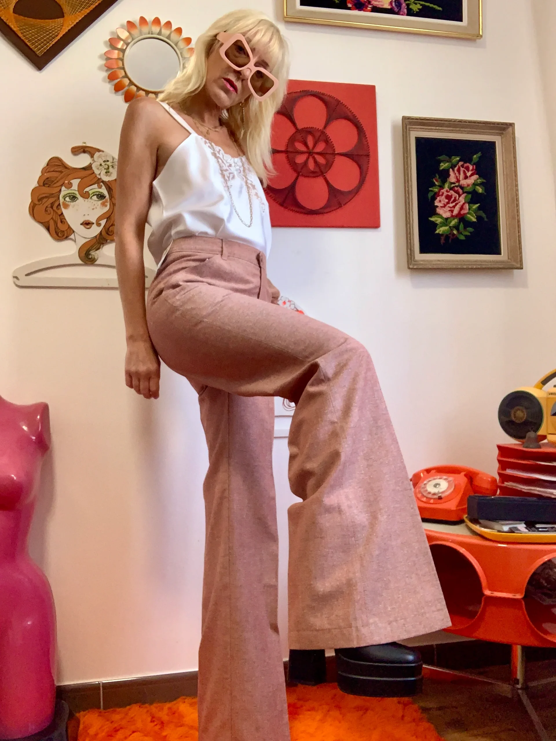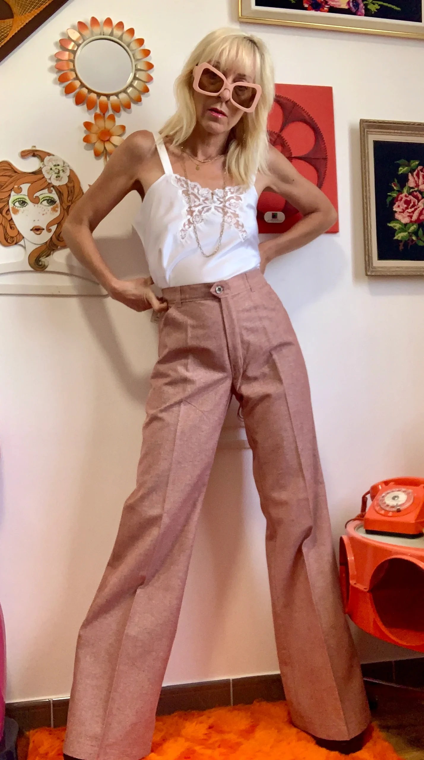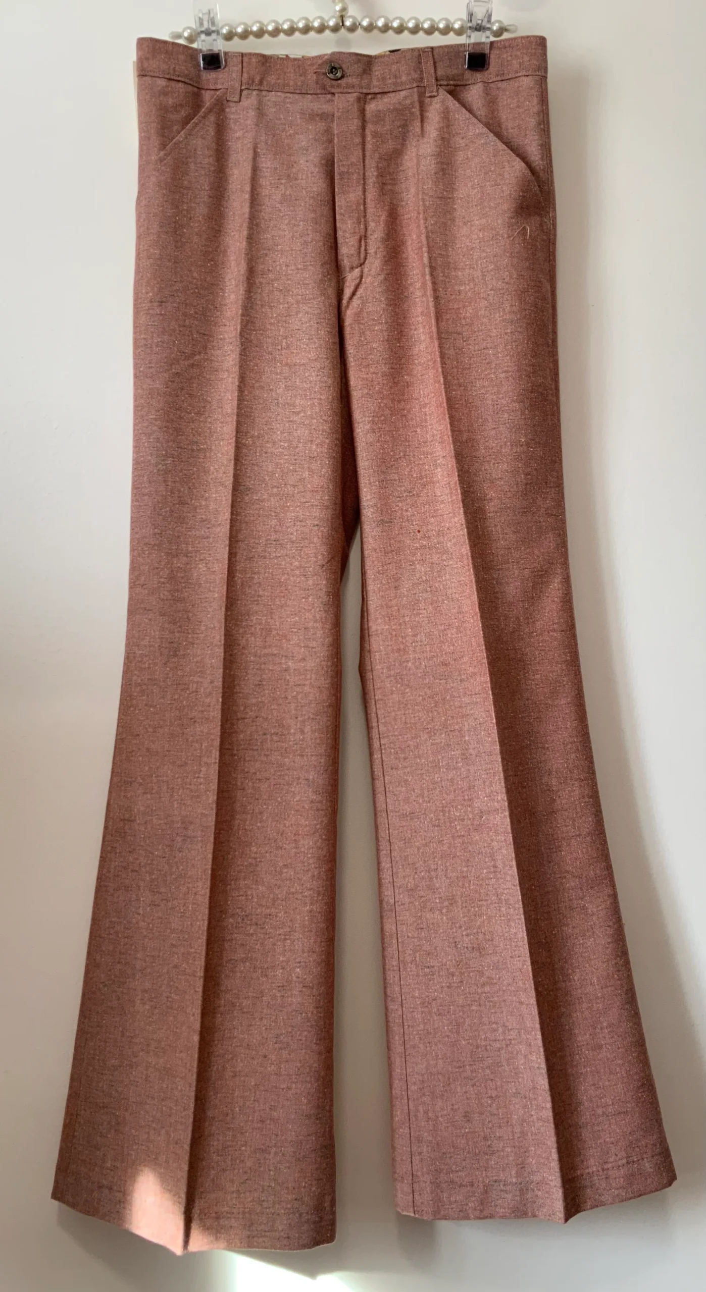 Superbe Pantalon Authentique Pattes D’elephant Flare Tergal Rouge chiné de couleurs Vintage 1970 Deadstock issu stock rétro .