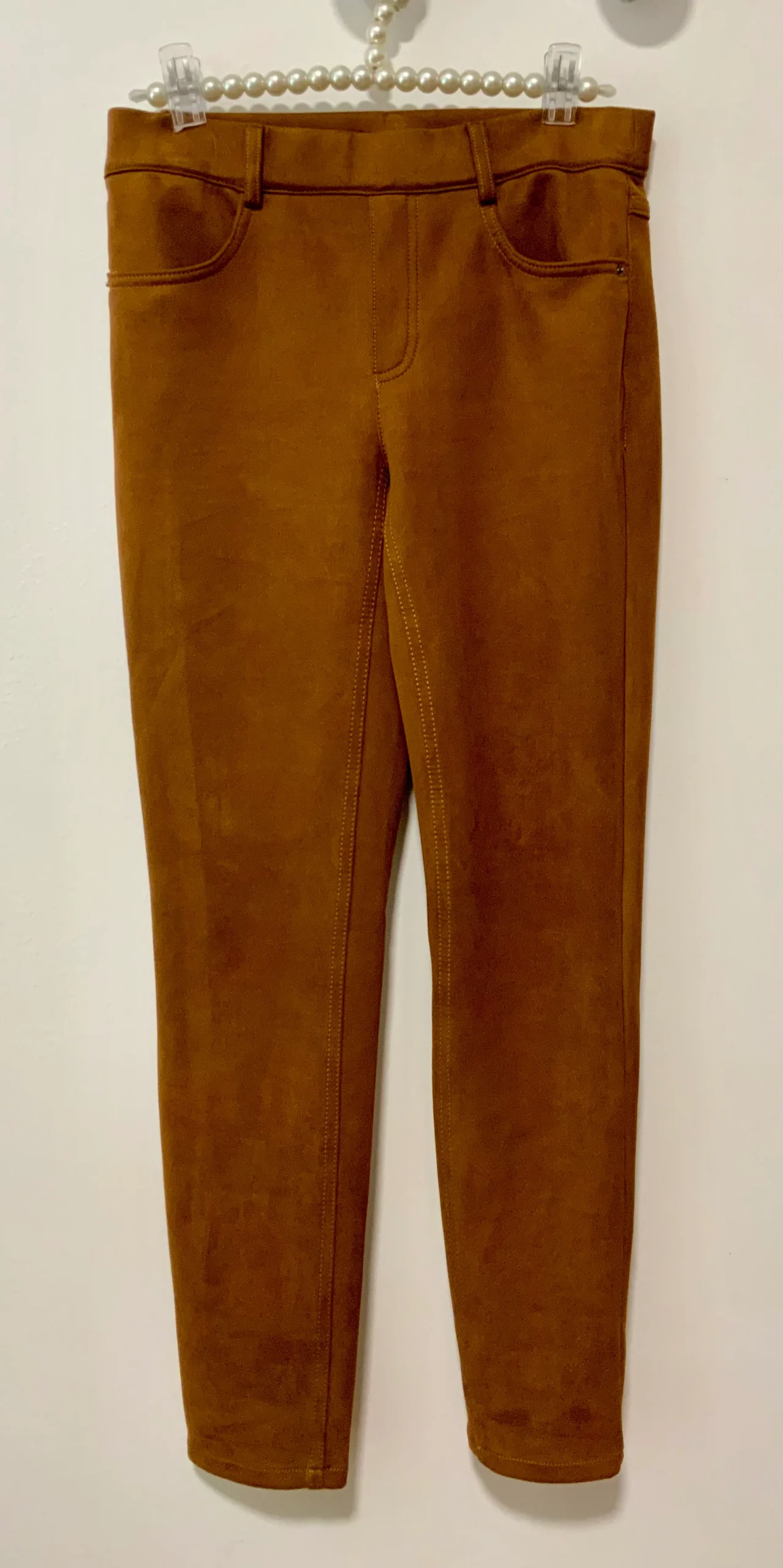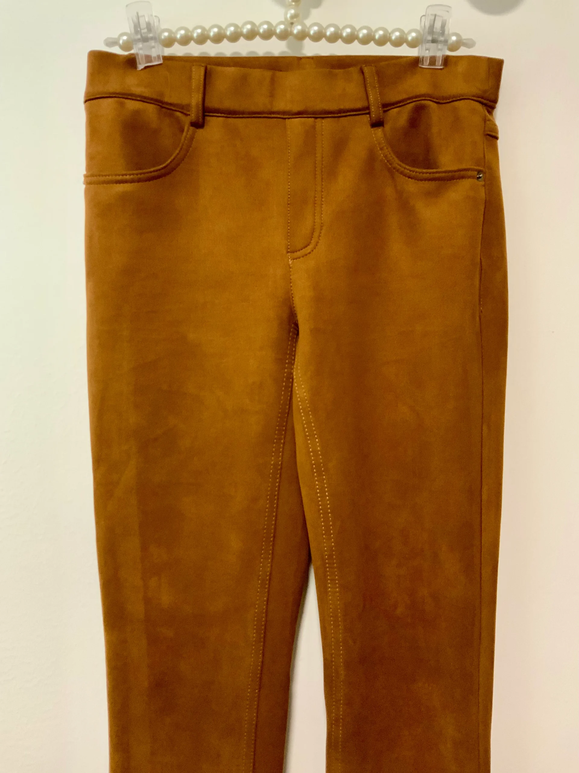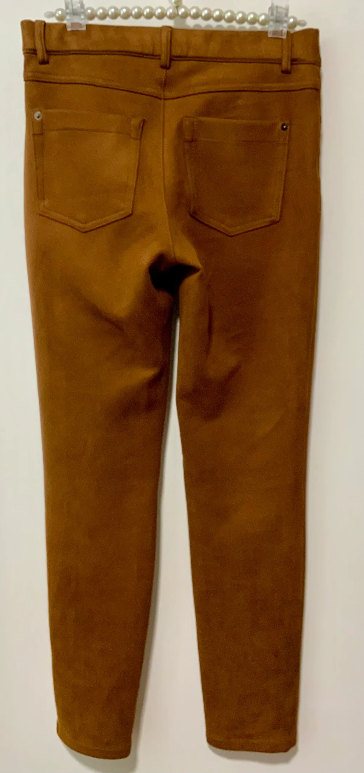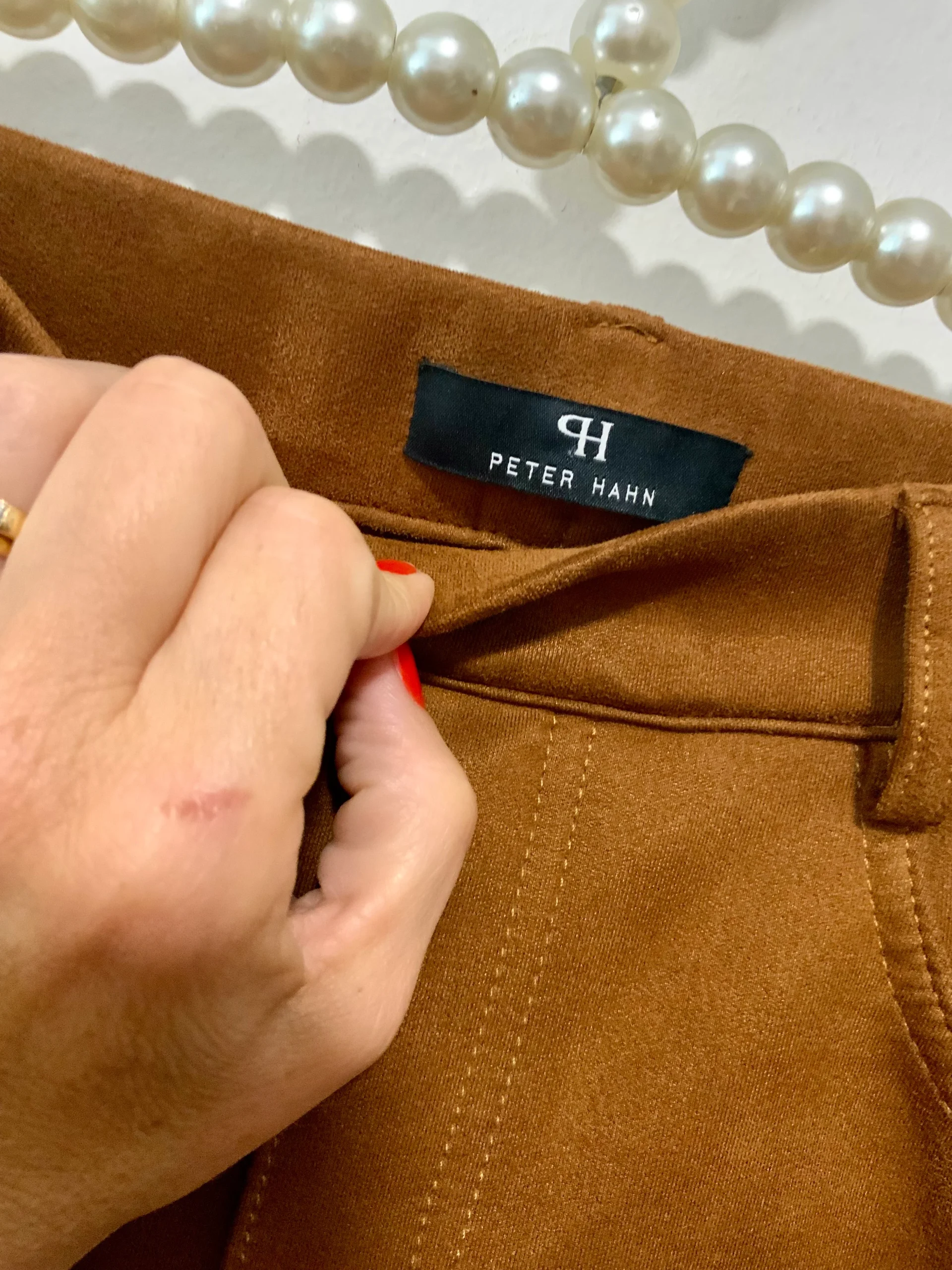 Pantalon droit en peau de pêche, suédine couleur camel de Peter Hahn France.
