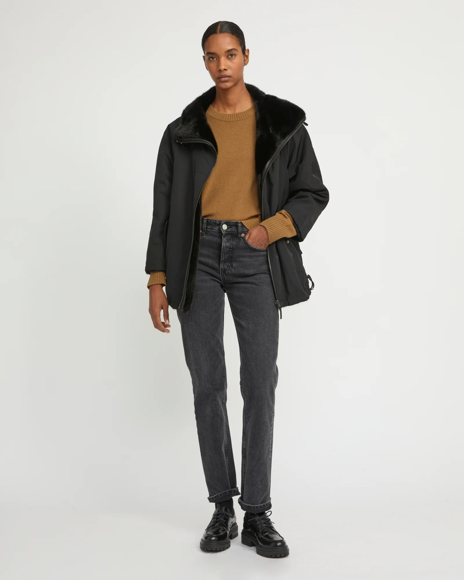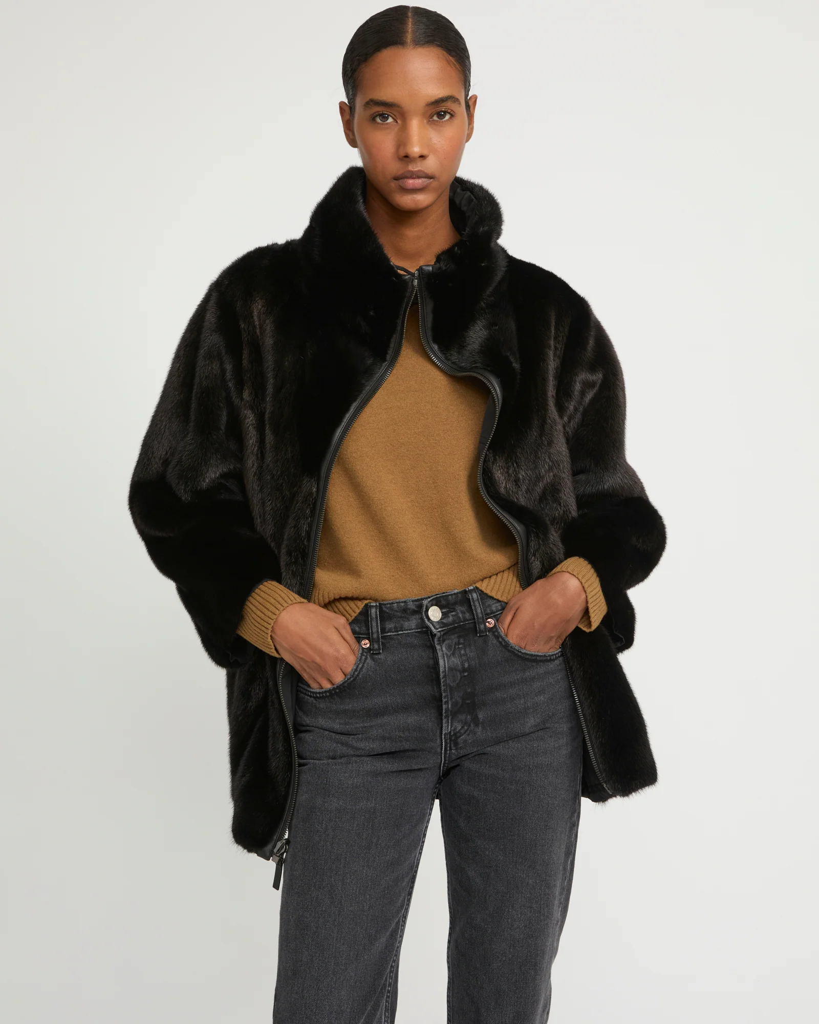 – Une face fourrure de vison long poil avec poches fentes
