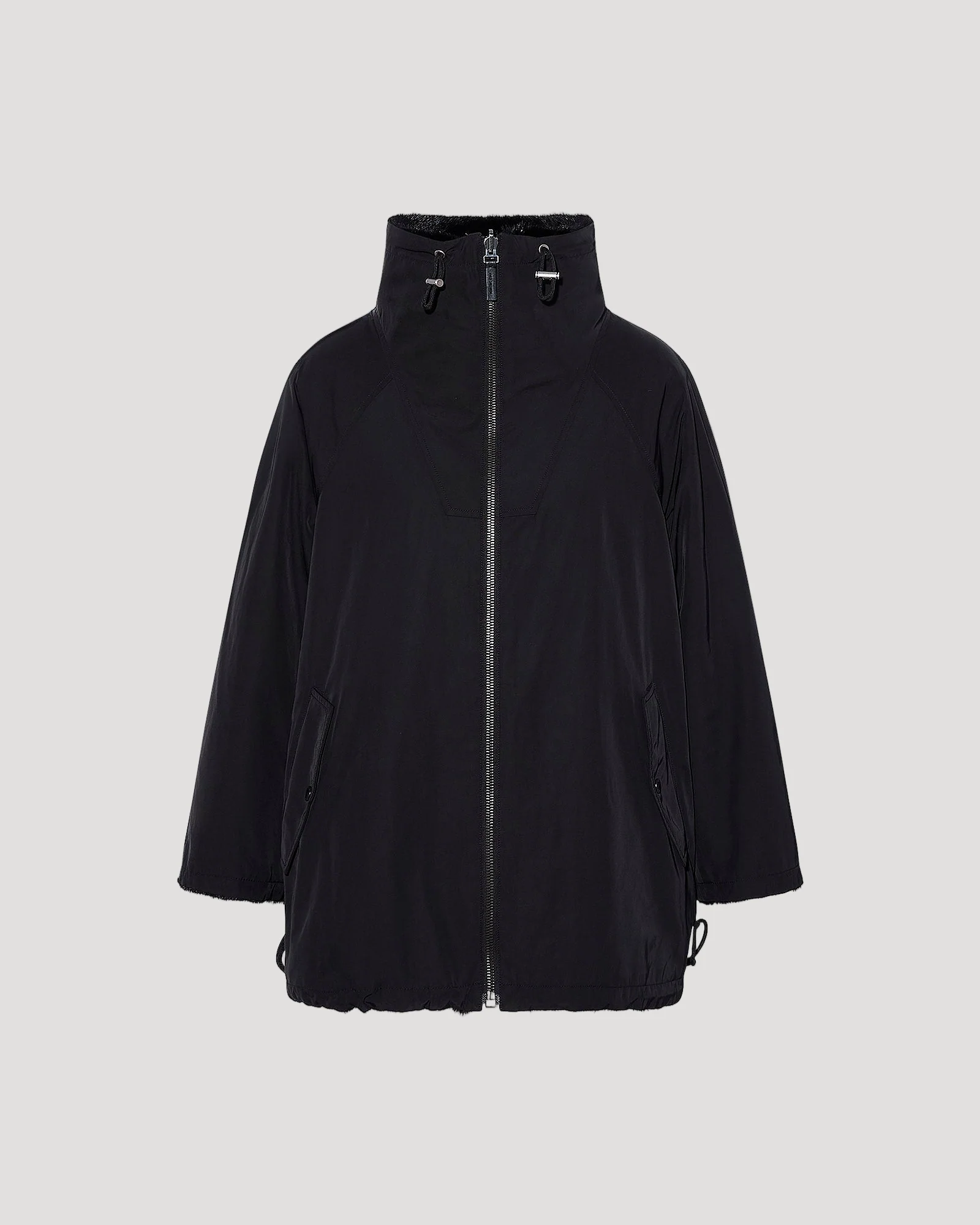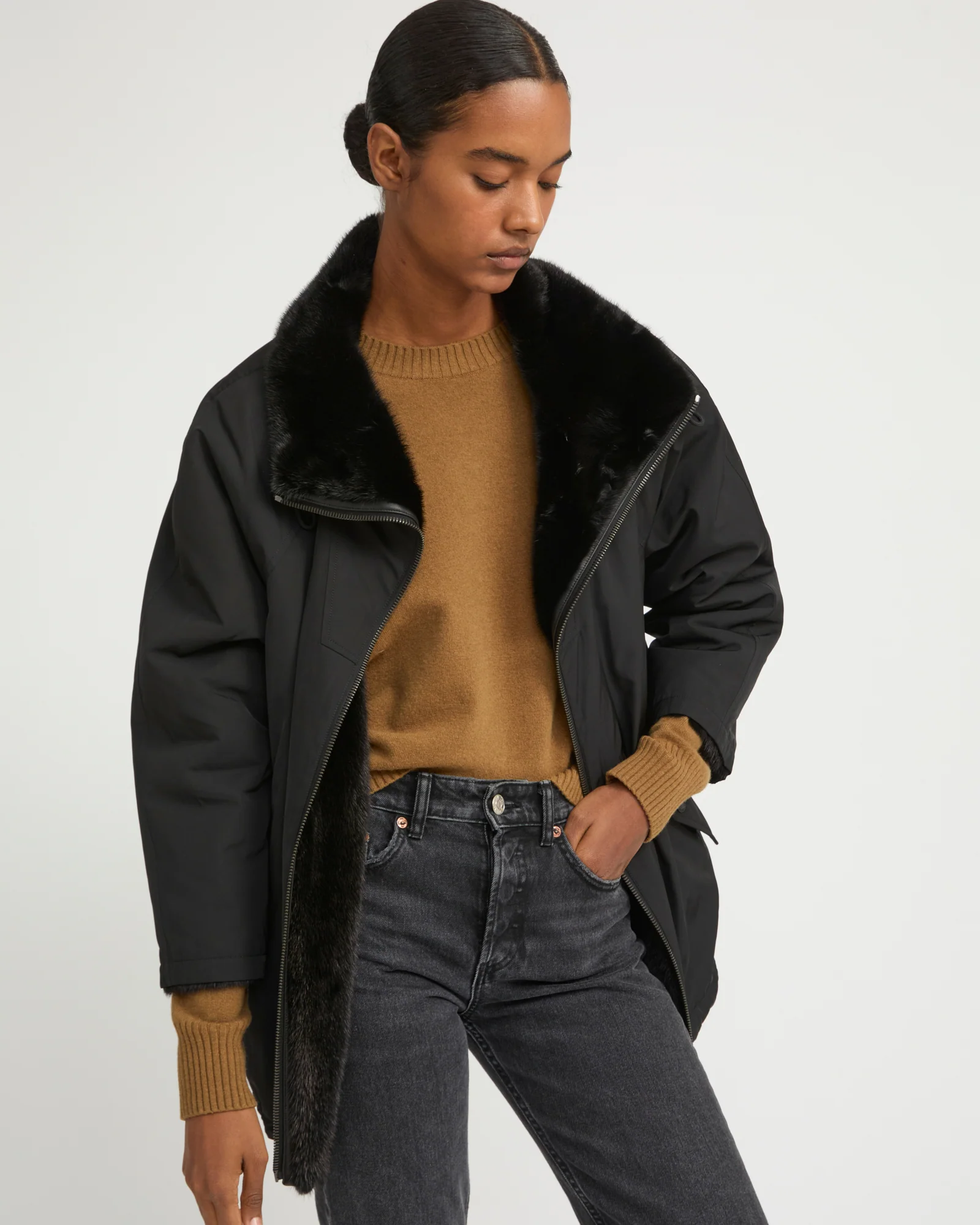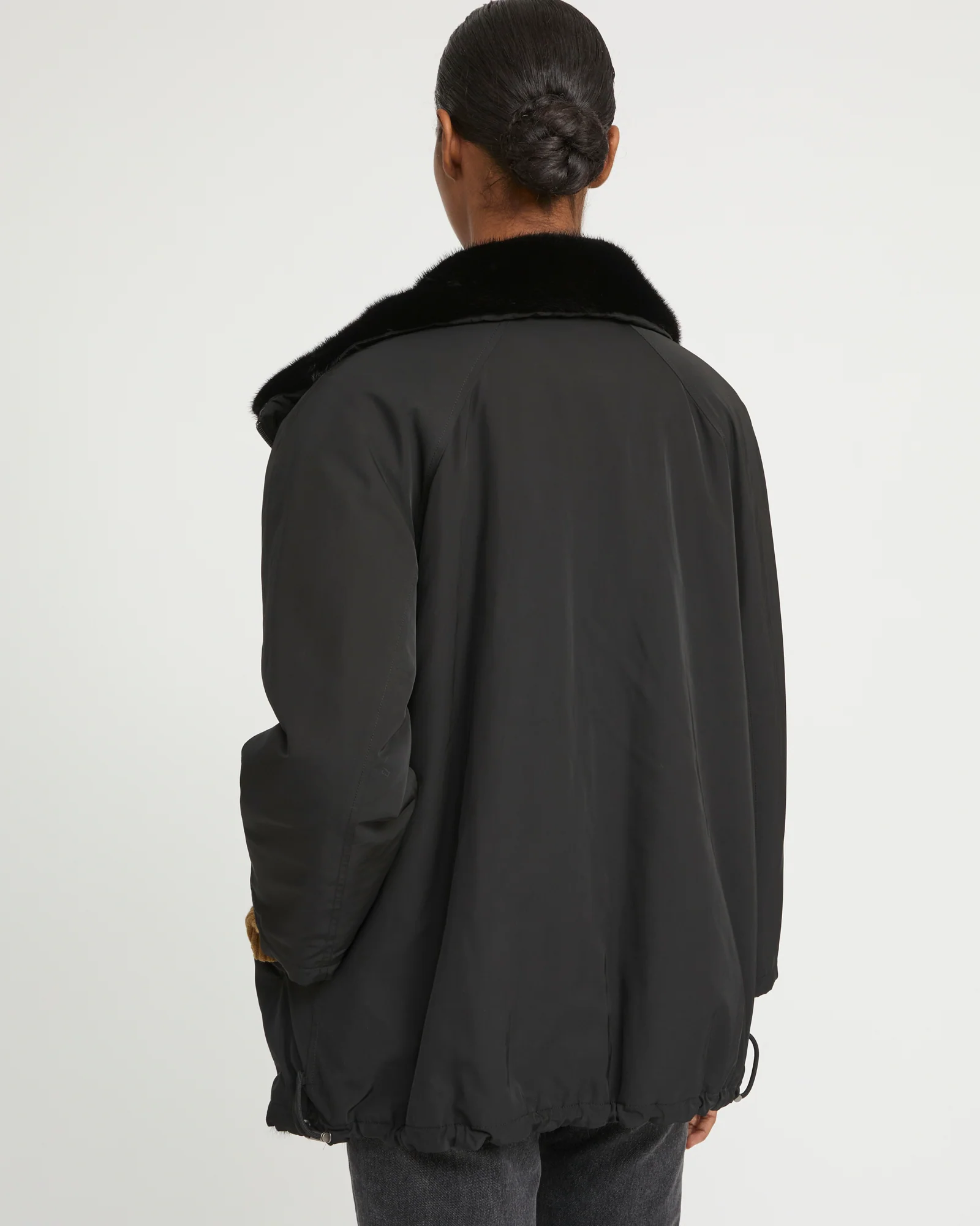 Lignes épurées et esprit sportswear pour cette parka au col montant, testée jusqu’à une température extérieure de -10°C. Réversible, elle associe une face en tissu technique et une face en fourrure de vison long poil douce et résistante. La face tissu propose des poches à pression tandis que la face fourrure comporte deux poches fentes.