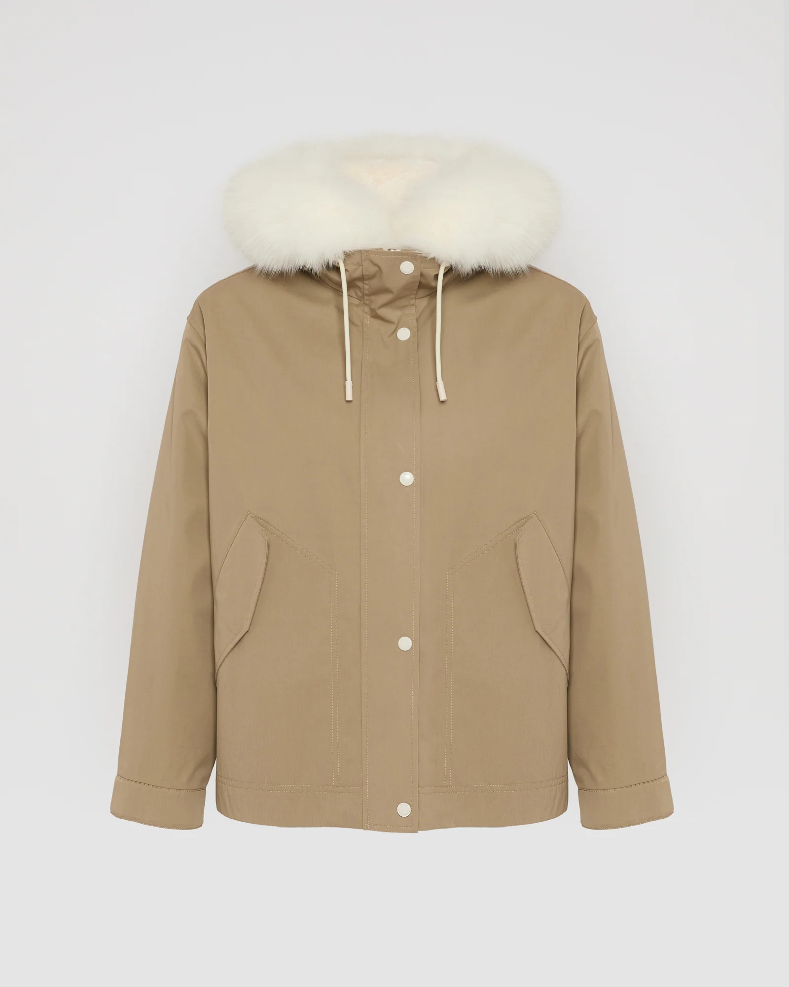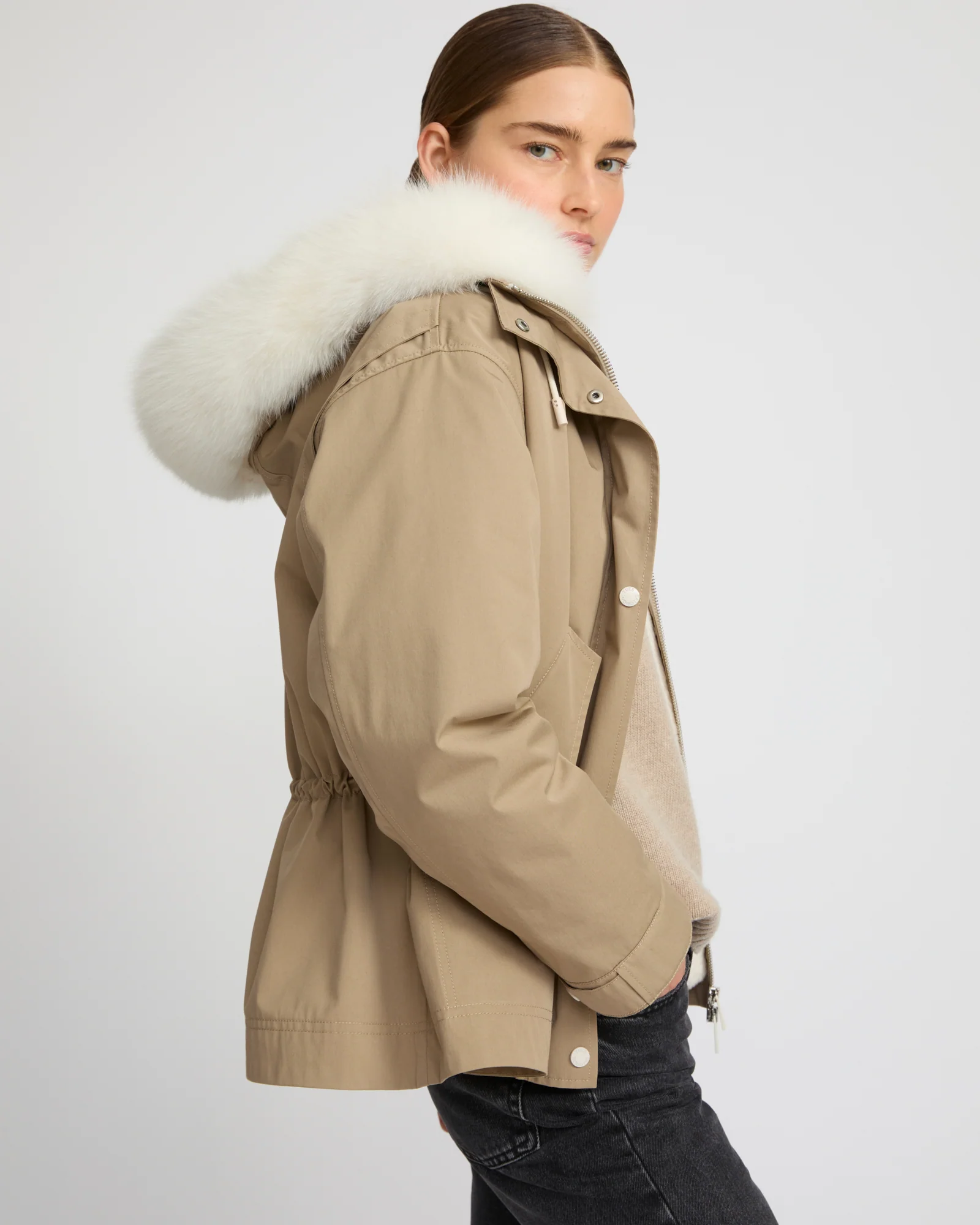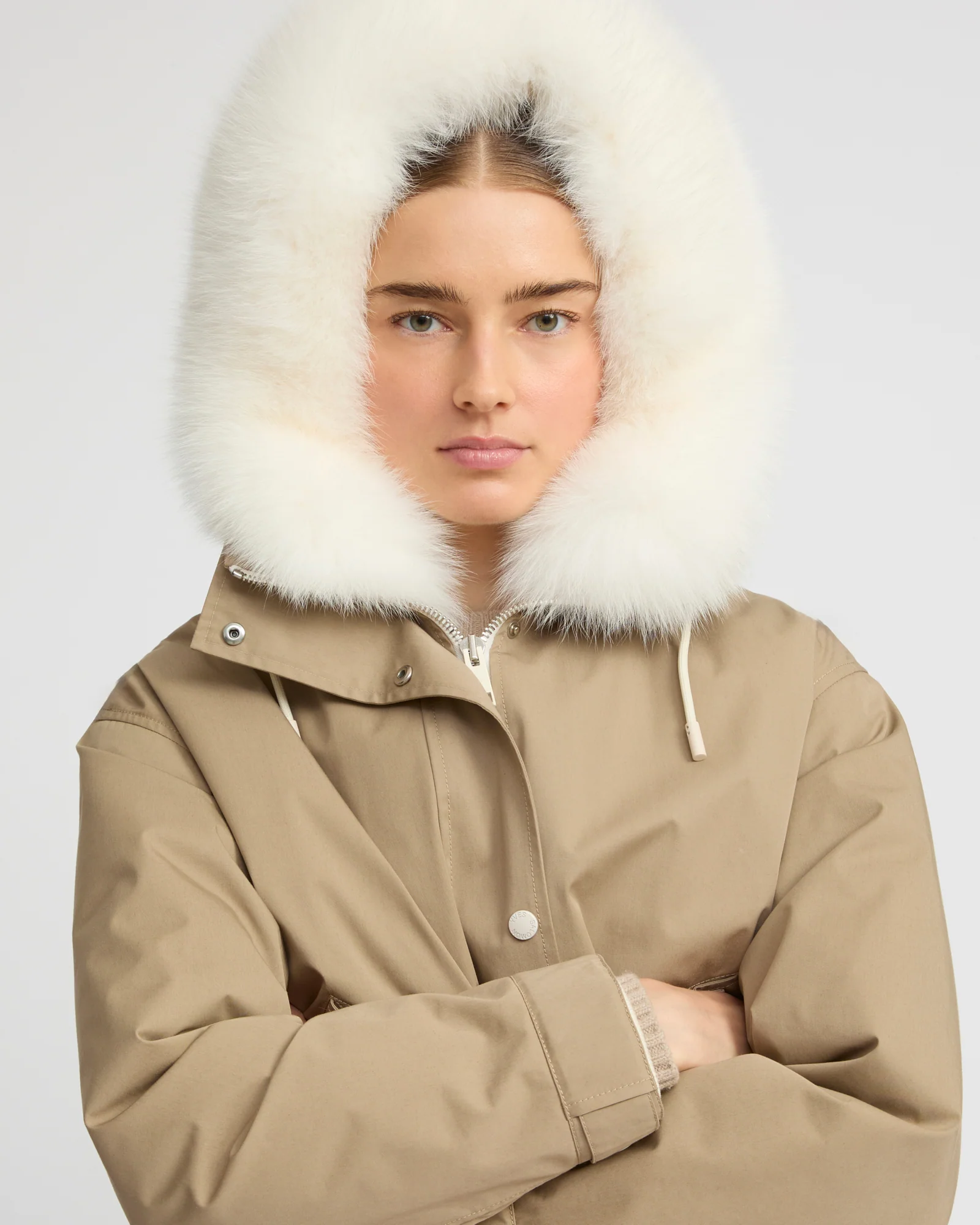Une forme courte et « boxy » pour cette parka, qui peut aussi se porter resserrée à la taille. La veste a été testée jusqu’à -10°C pour garantir une protection parfaite contre le froid, et sa matière en coton imperméable résiste aux intempéries. Un tour de capuche amovible en fourrure de renard aux poils longs, et une doublure corps en fourrure de lapin rasé, également amovible, proposent des options supplémentaires pour le style et la chaleur.