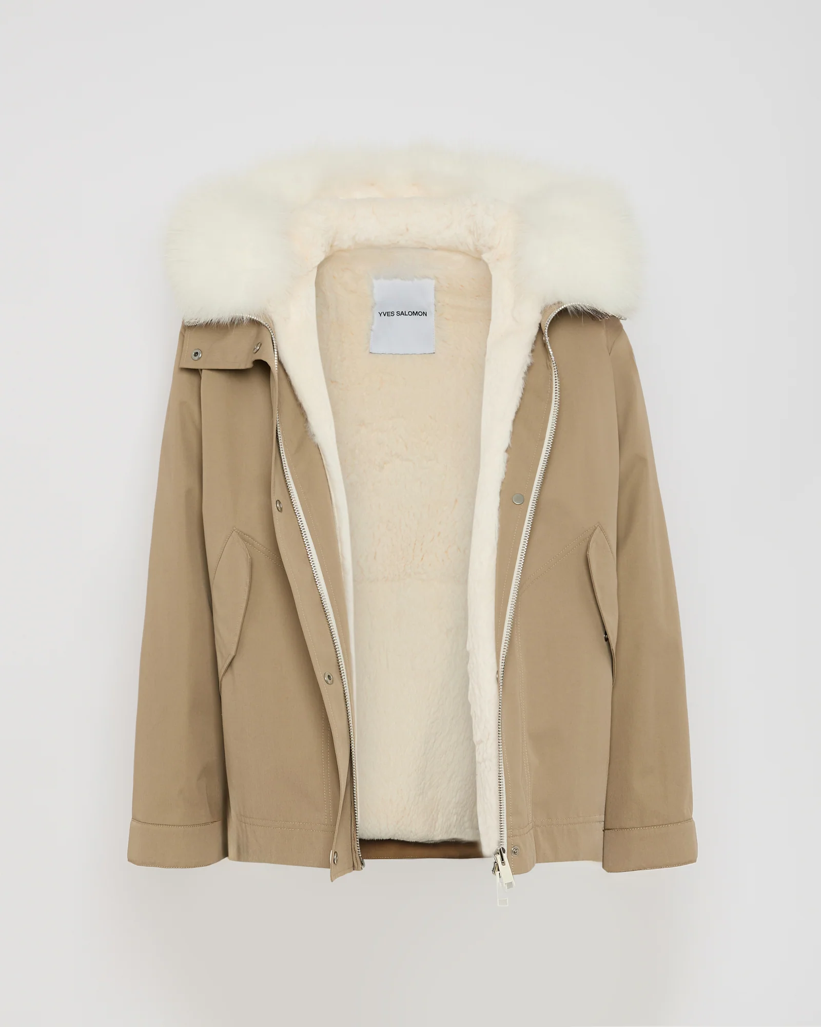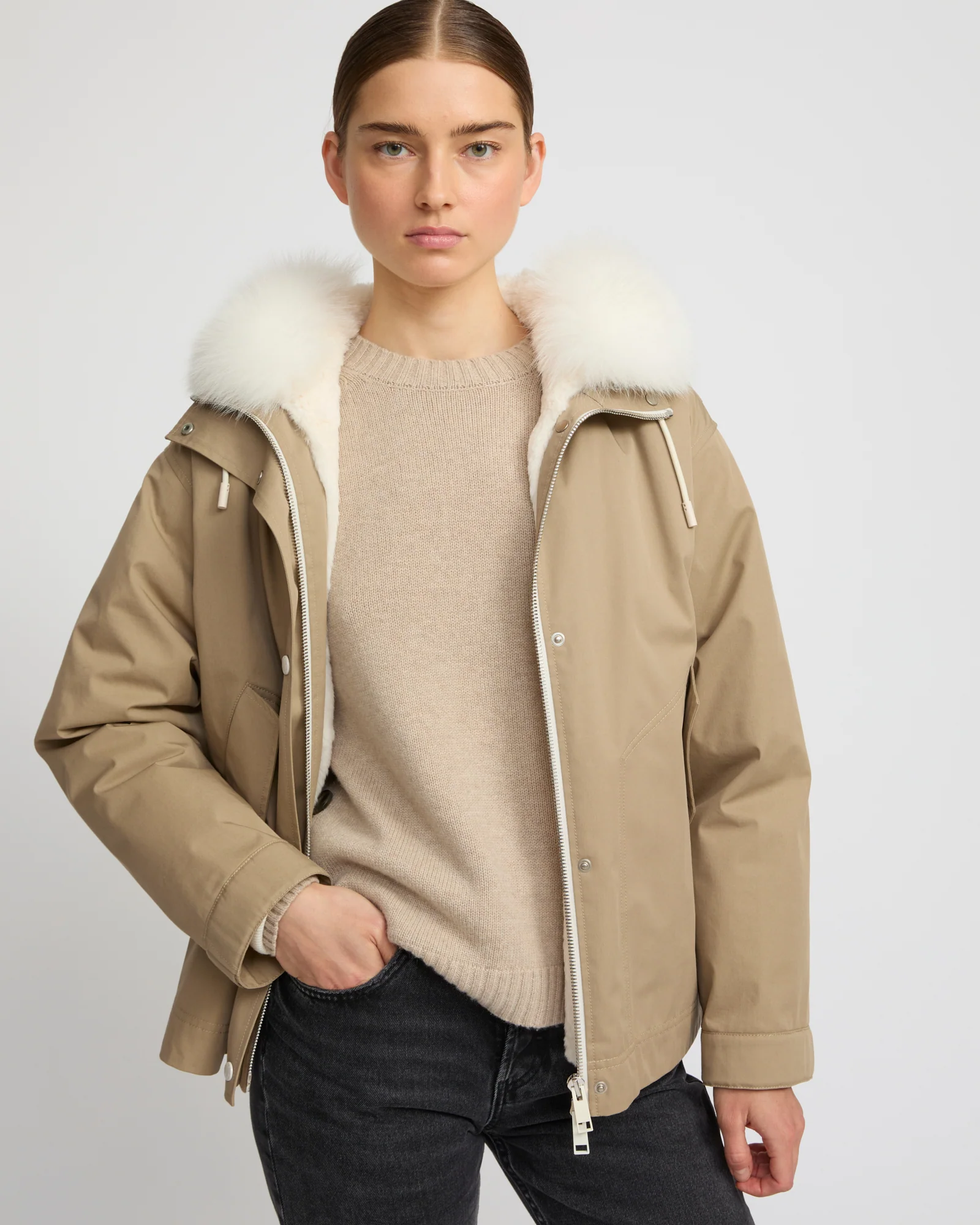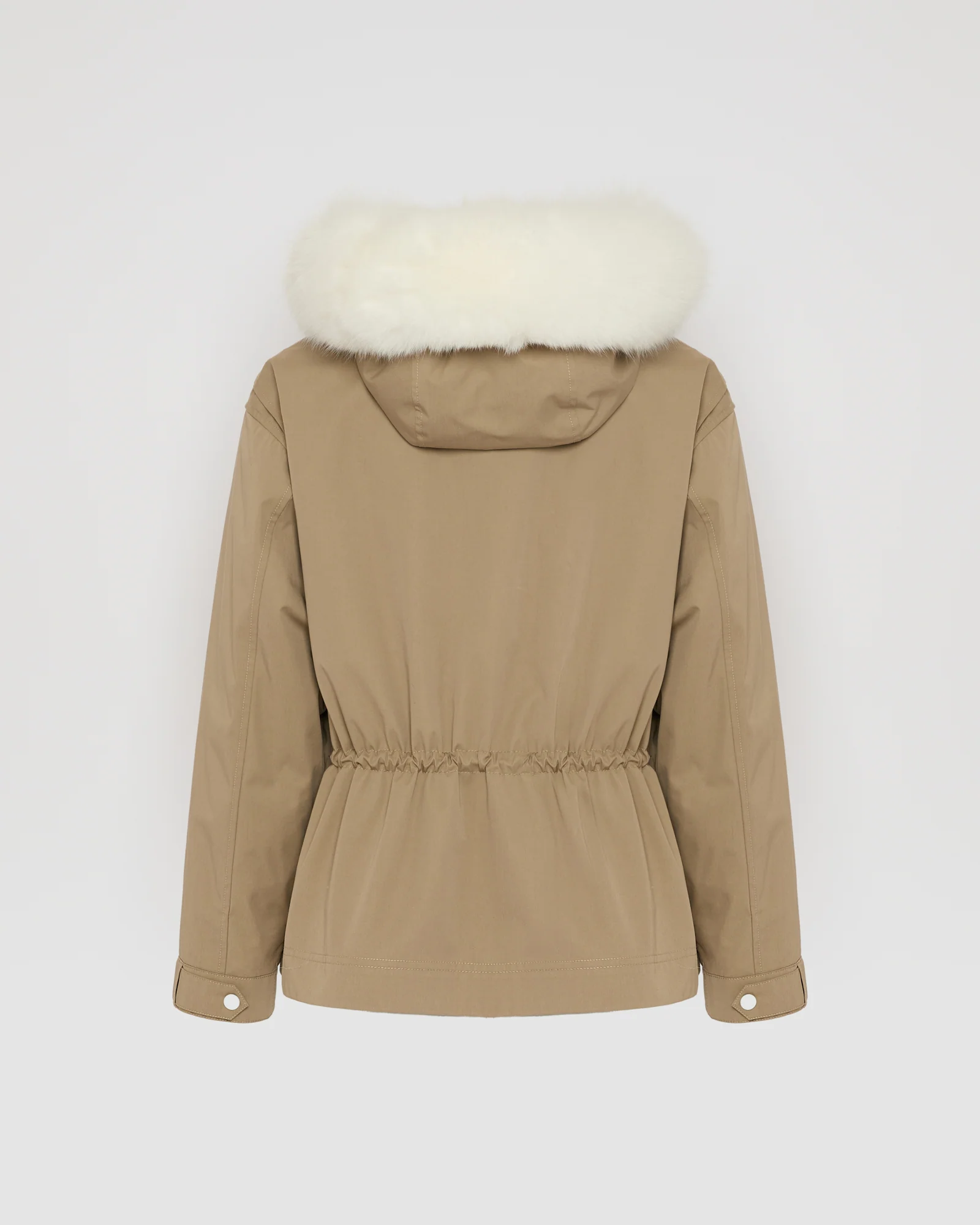 Une forme courte et « boxy » pour cette parka, qui peut aussi se porter resserrée à la taille. La veste a été testée jusqu’à -10°C pour garantir une protection parfaite contre le froid, et sa matière en coton imperméable résiste aux intempéries. Un tour de capuche amovible en fourrure de renard aux poils longs, et une doublure corps en fourrure de lapin rasé, également amovible, proposent des options supplémentaires pour le style et la chaleur.