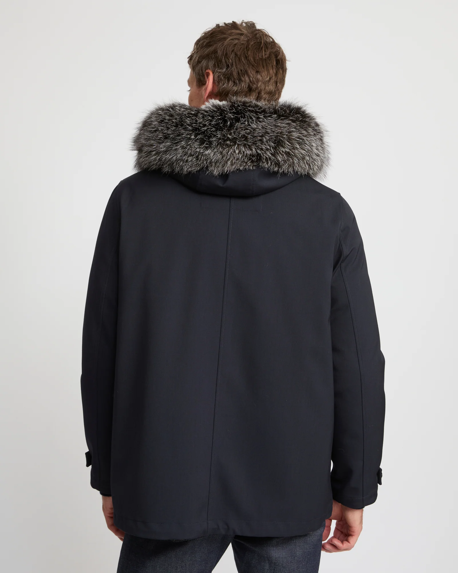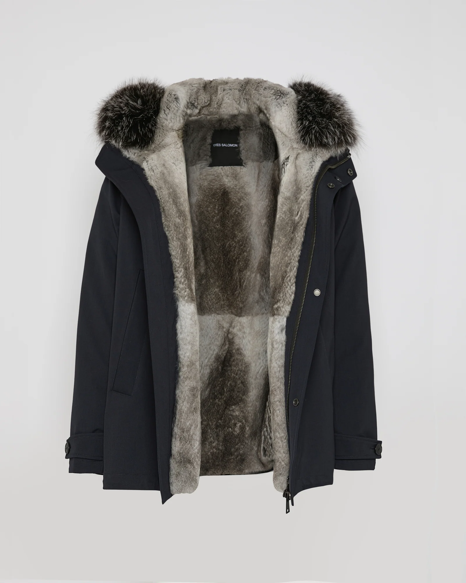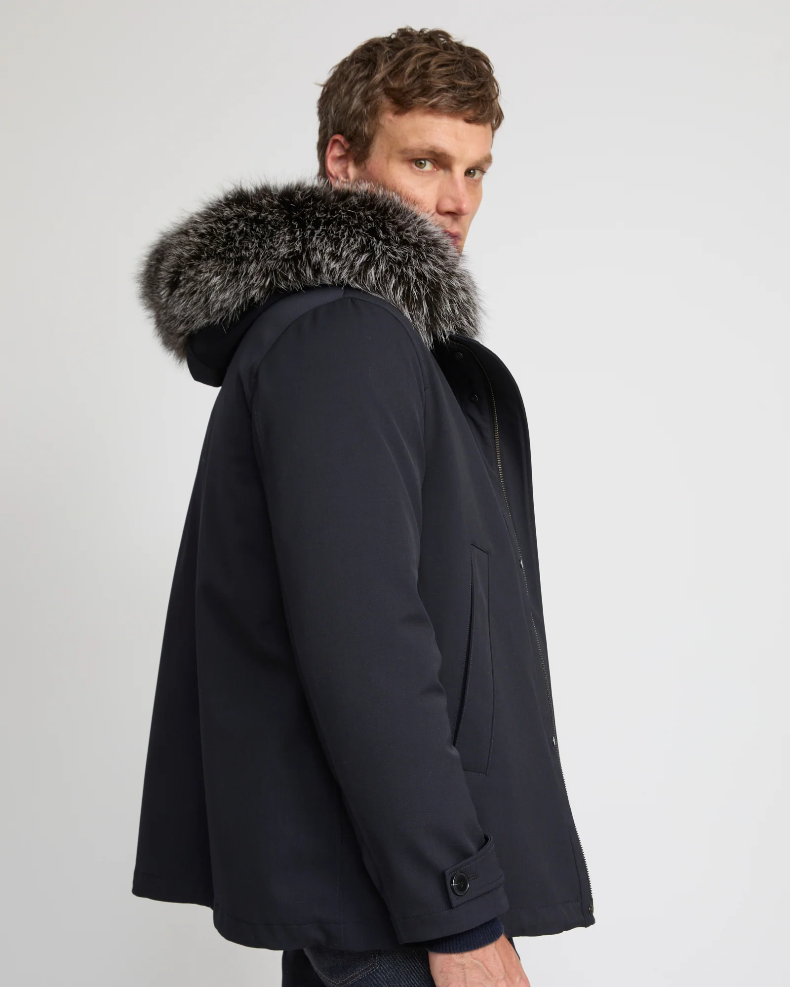 Versatilité, chaleur et élégance pour une parka courte aux formes classiques, travaillée dans un lainage technique résistant au temps comme aux intempéries. Une première doublure en duvet de haute qualité s’ajoute à une doublure supplémentaire amovible en lapin éjarré.