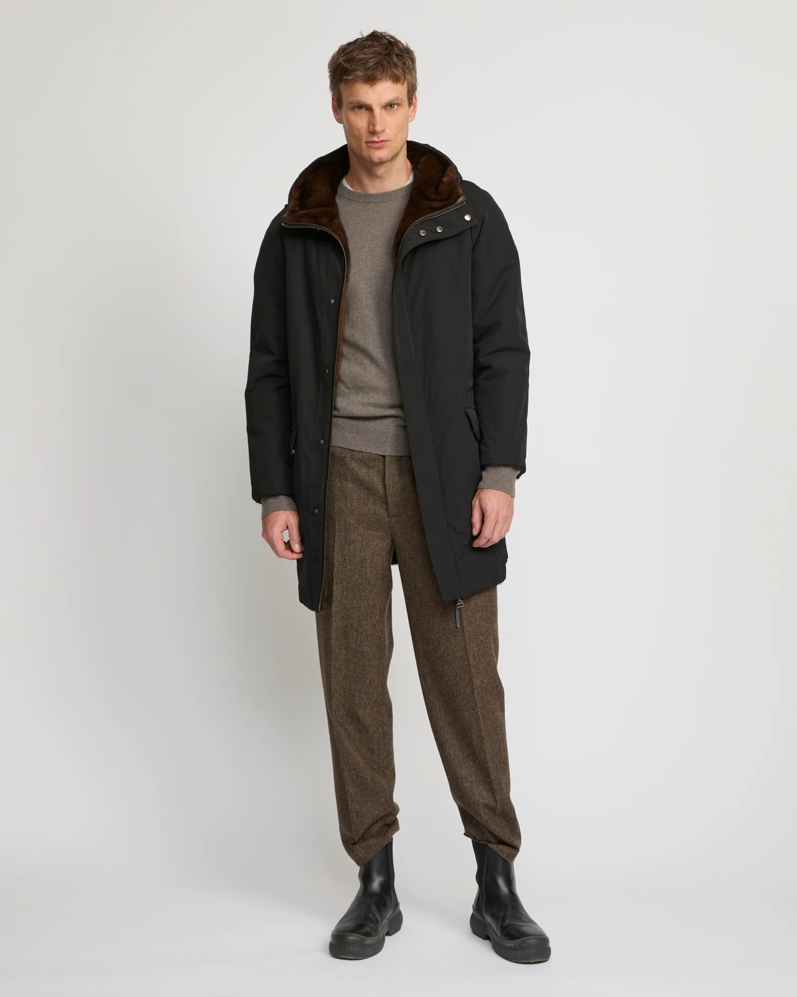 Une élégante parka longue qui associe face en twill technique déperlant et une face en fourrure de vison long poil douce et résistante.