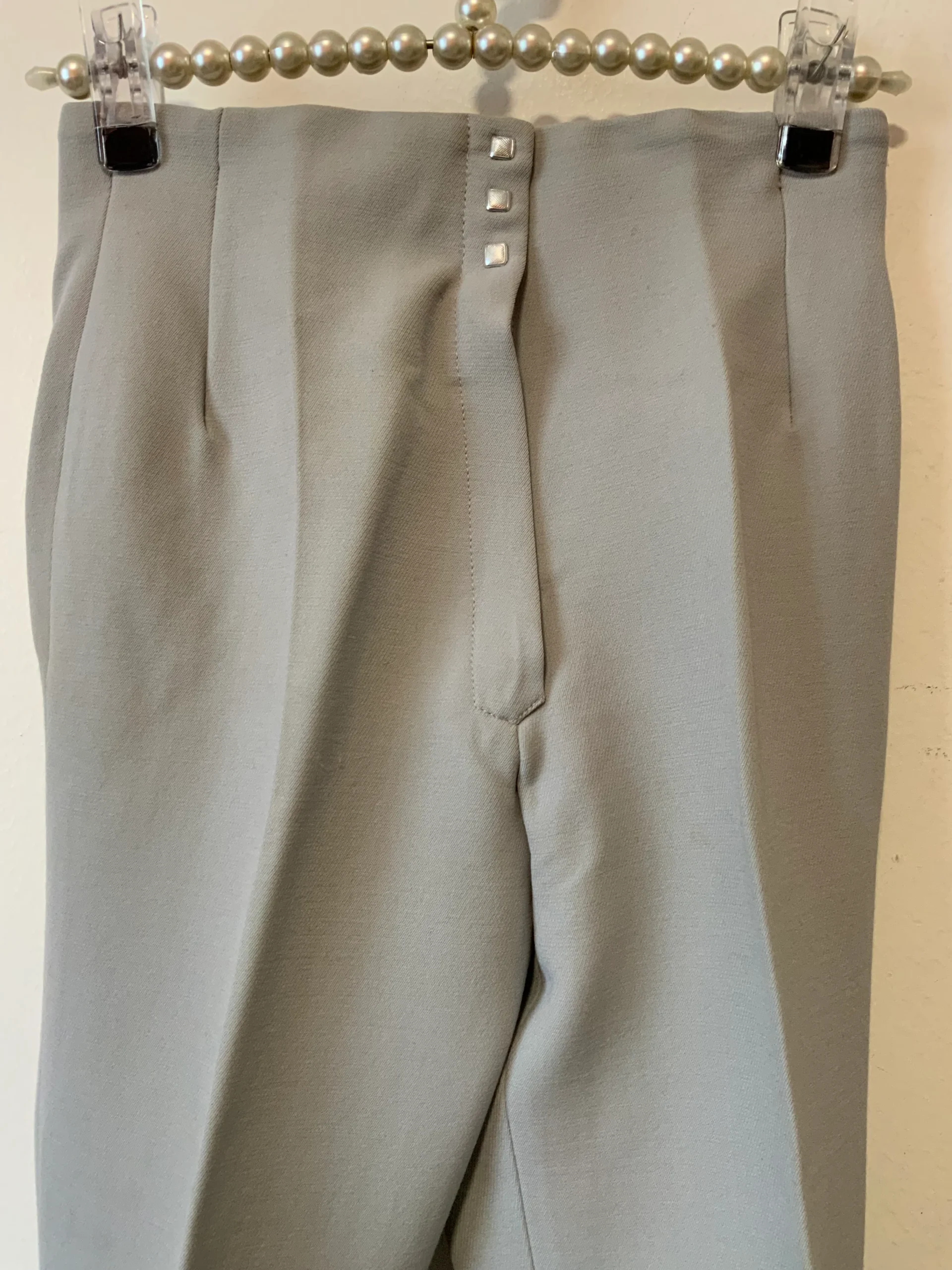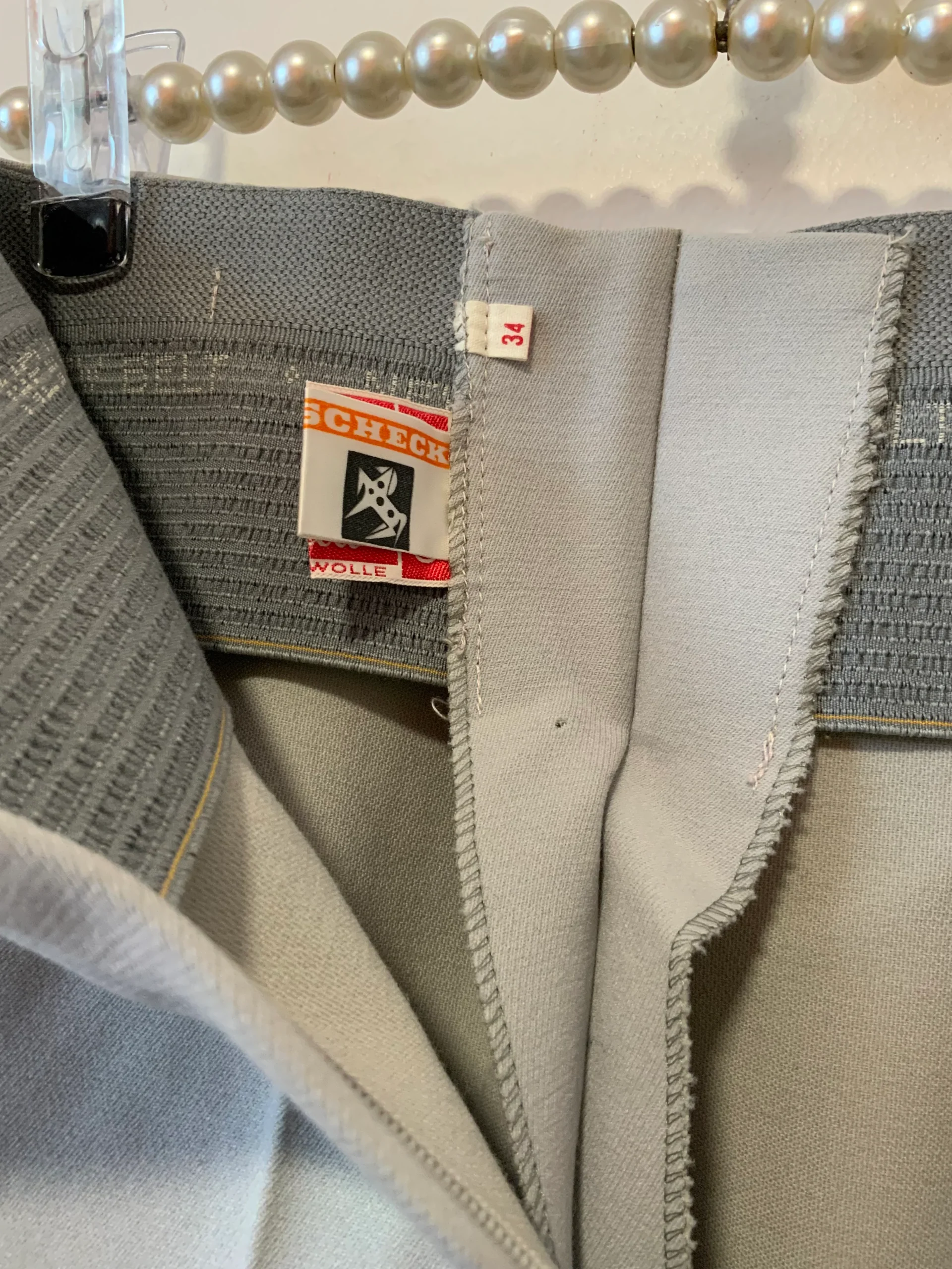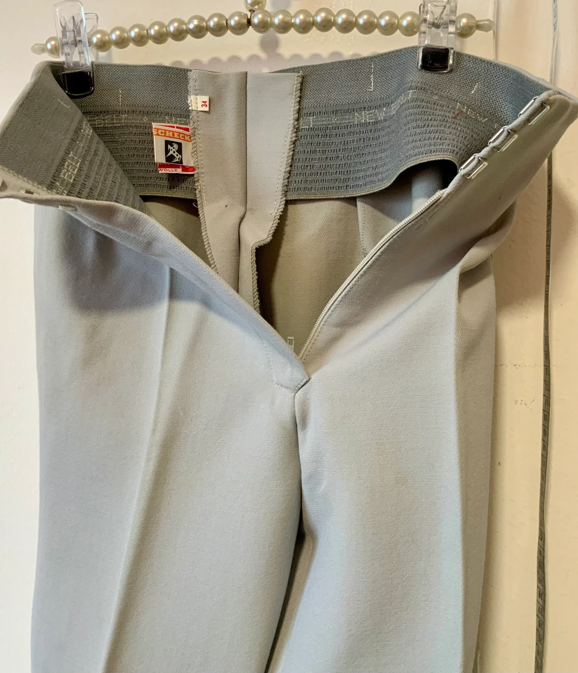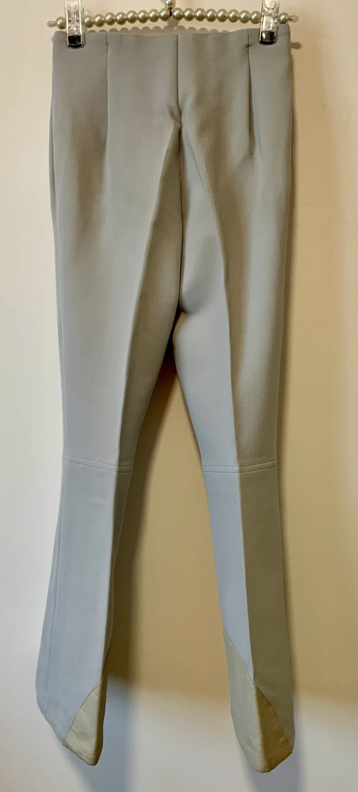 Rare et très beau pantalon pattes d’éléphant Helanca sport Vintage de couleur gris perle avec empiècements de cuir gris clair en bas – En lycra très épais avec empiècements pour pieds Fuseau et un tissu élastique protégeant tout comme un pantalon de ski – AUTHENTIQUE PANTALON FLARE SEVENTIES.