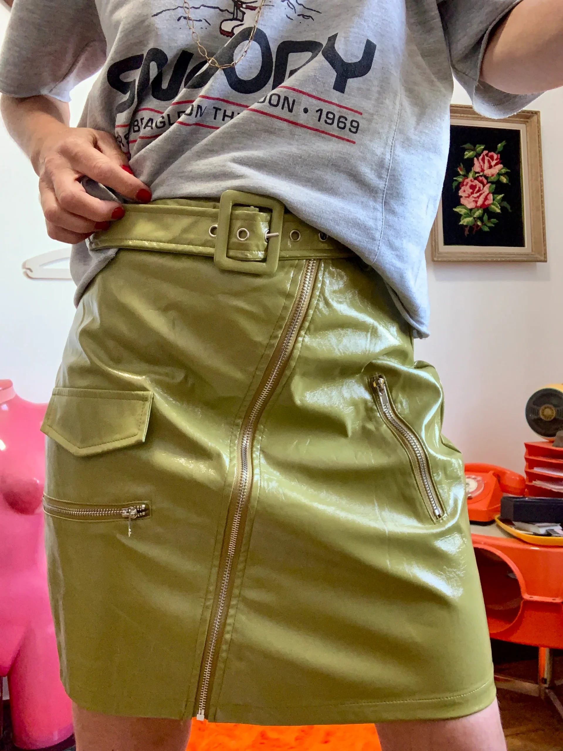 Ravissante Jupe en vinyle vert de chez Boohoo – En excellent état – Ceinture et Zip complet.