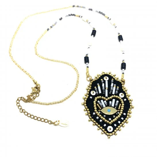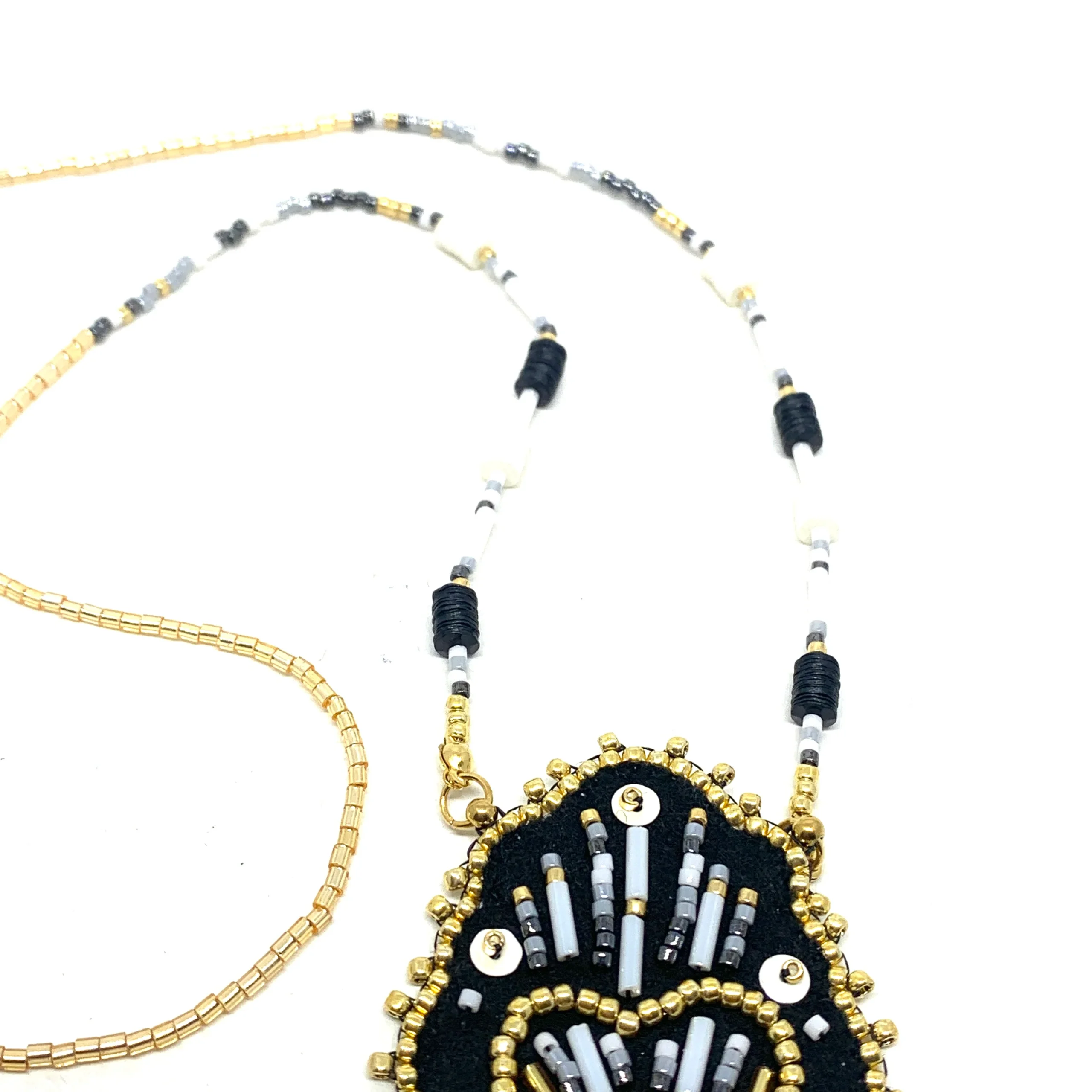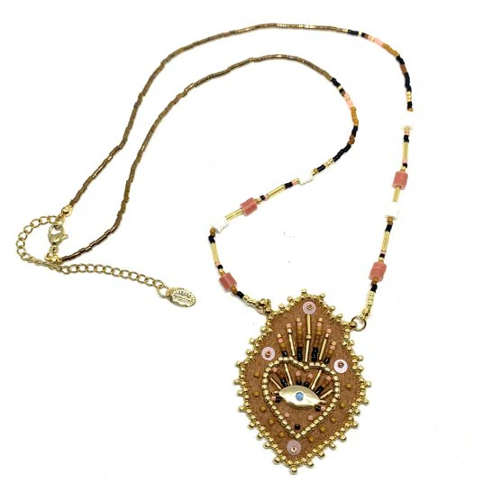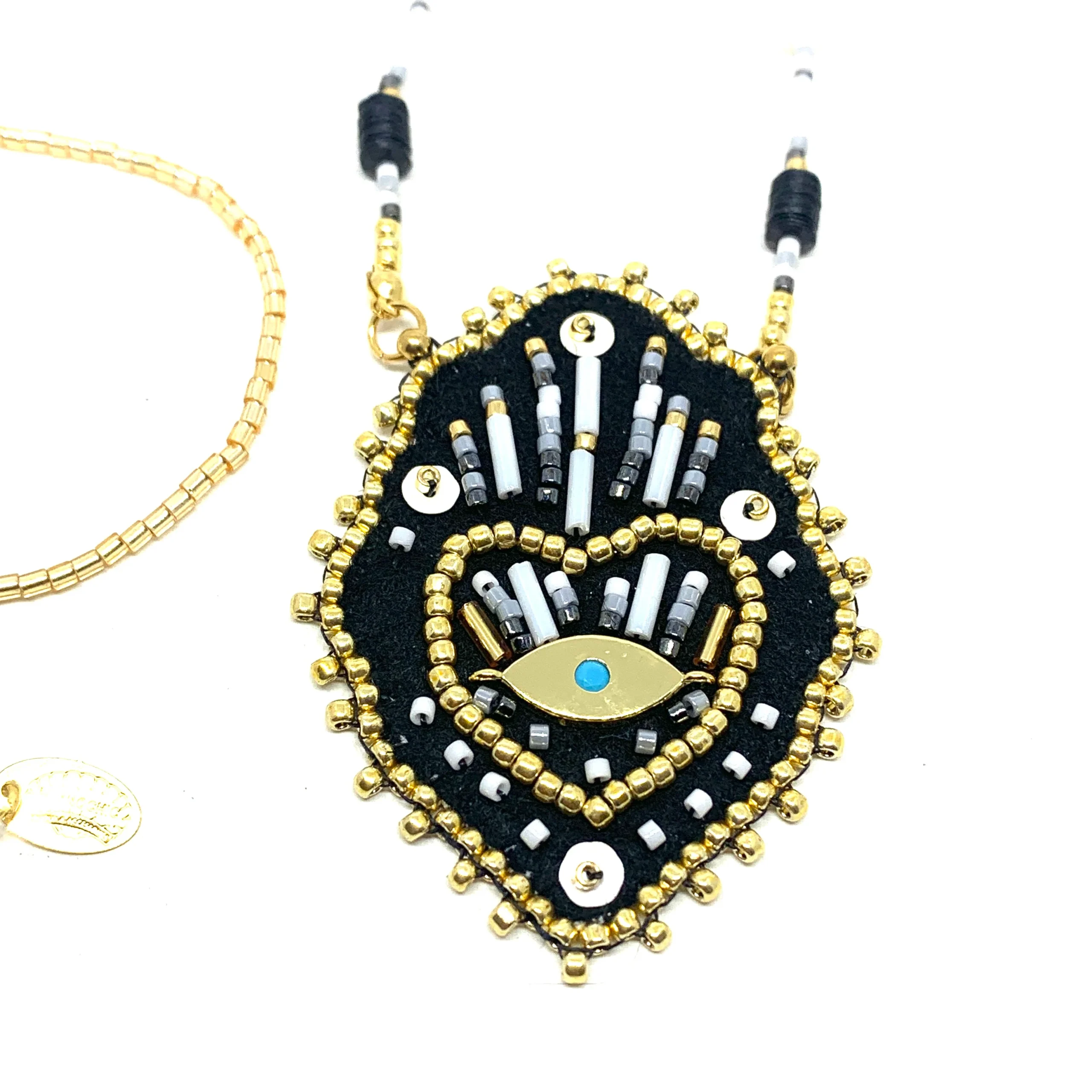 Sautoir en perles de Miyuki et pendentif en feutre serti de perles et symboles
