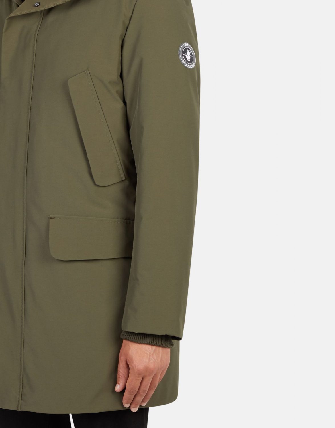 L’icône de la collection Arctic: une longue parka avec une capuche ajustable et amovible, des poignets tricotés et un bouton pression et une double fermeture zippée. Il est parfait pour s’abriter du froid, du vent et de l’humidité à la fois au sommet d’une montagne et dans les rues de la ville.