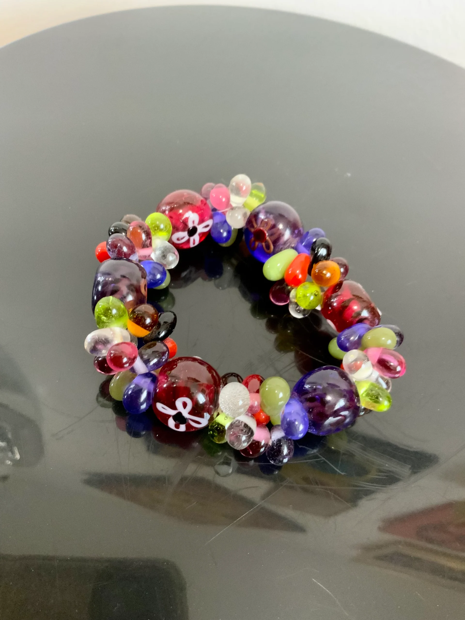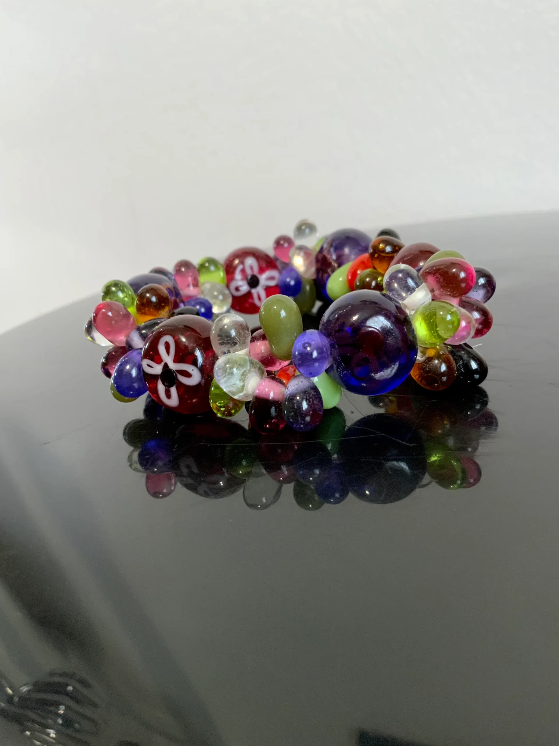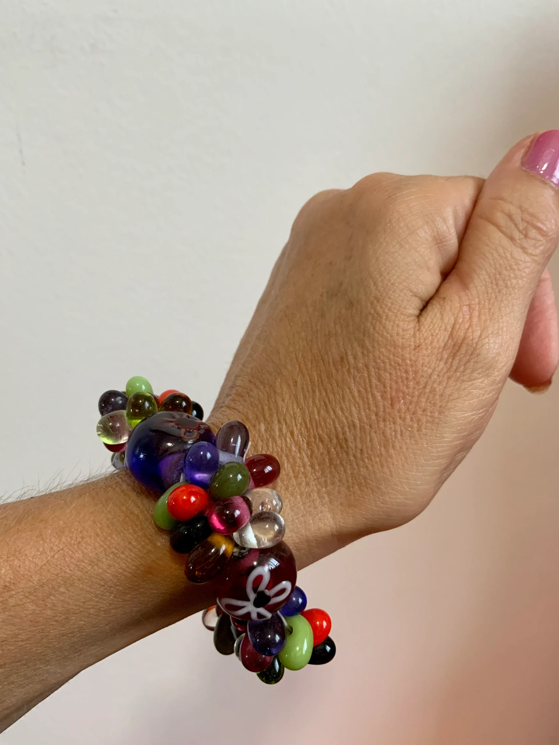 Excellent état, Bracelet élastique – De multiples couleurs opaques ou transparentes, certaines perles sont peintes avec motifs fleurs – Ses couleurs sont magiques et l’accumulation de perles donne un effet gros et transparent magnifique, belle qualité.