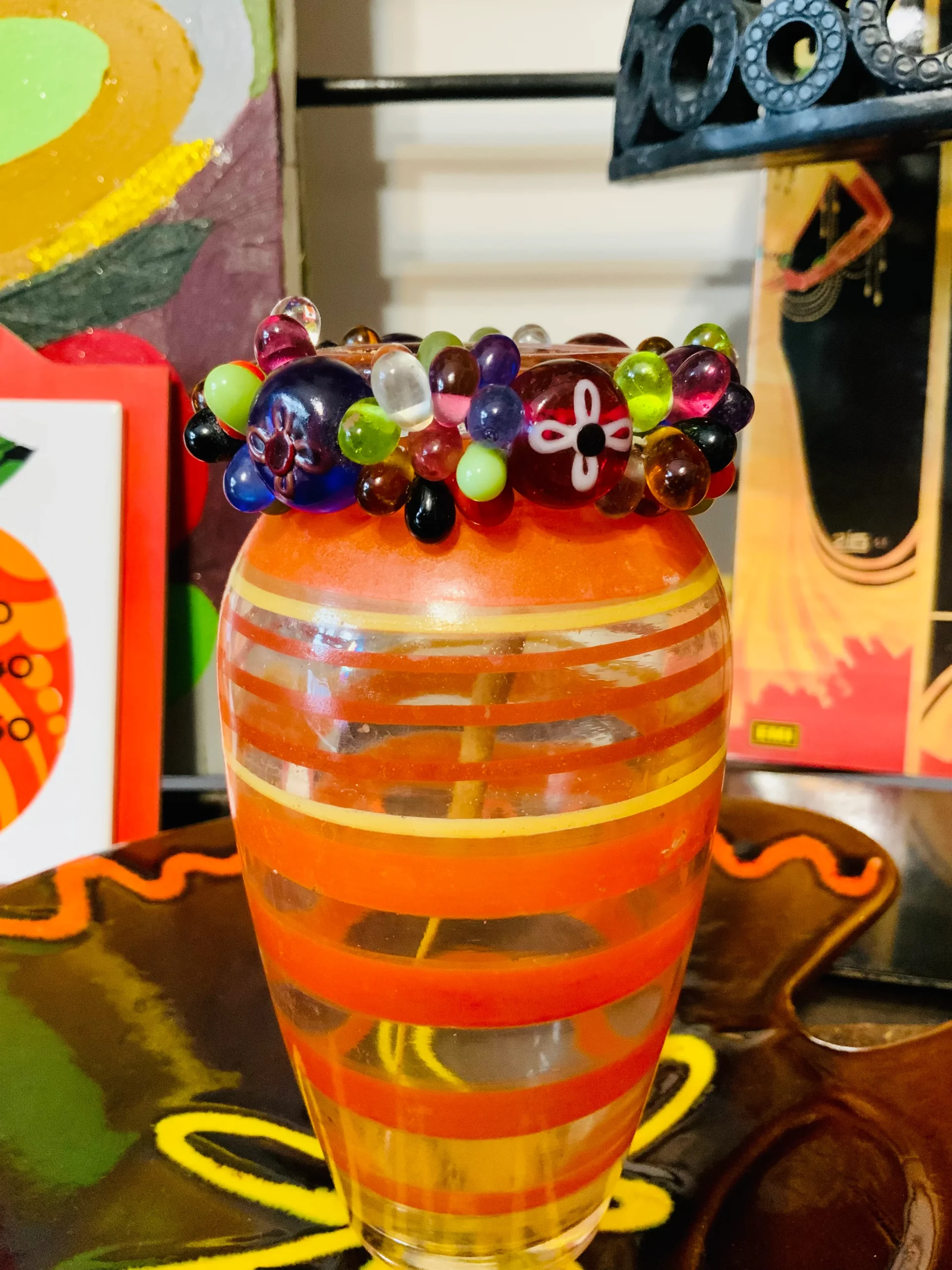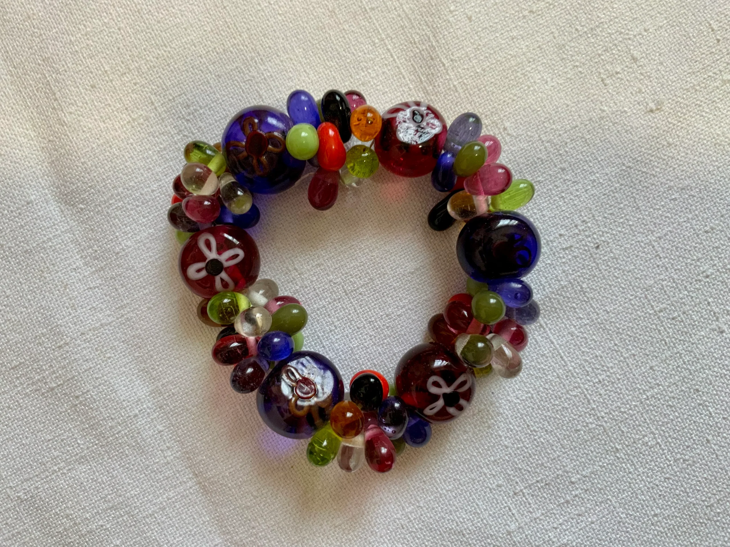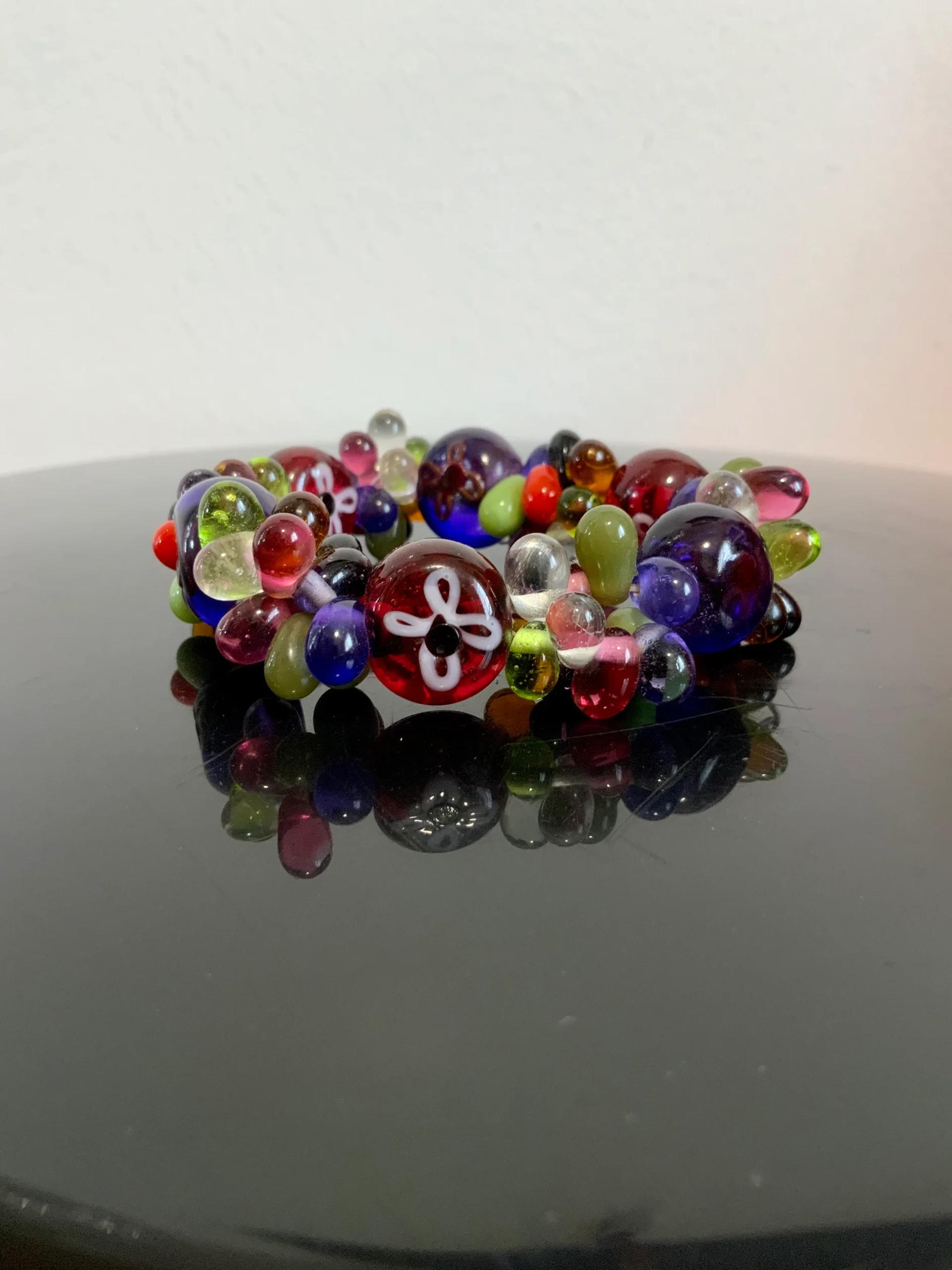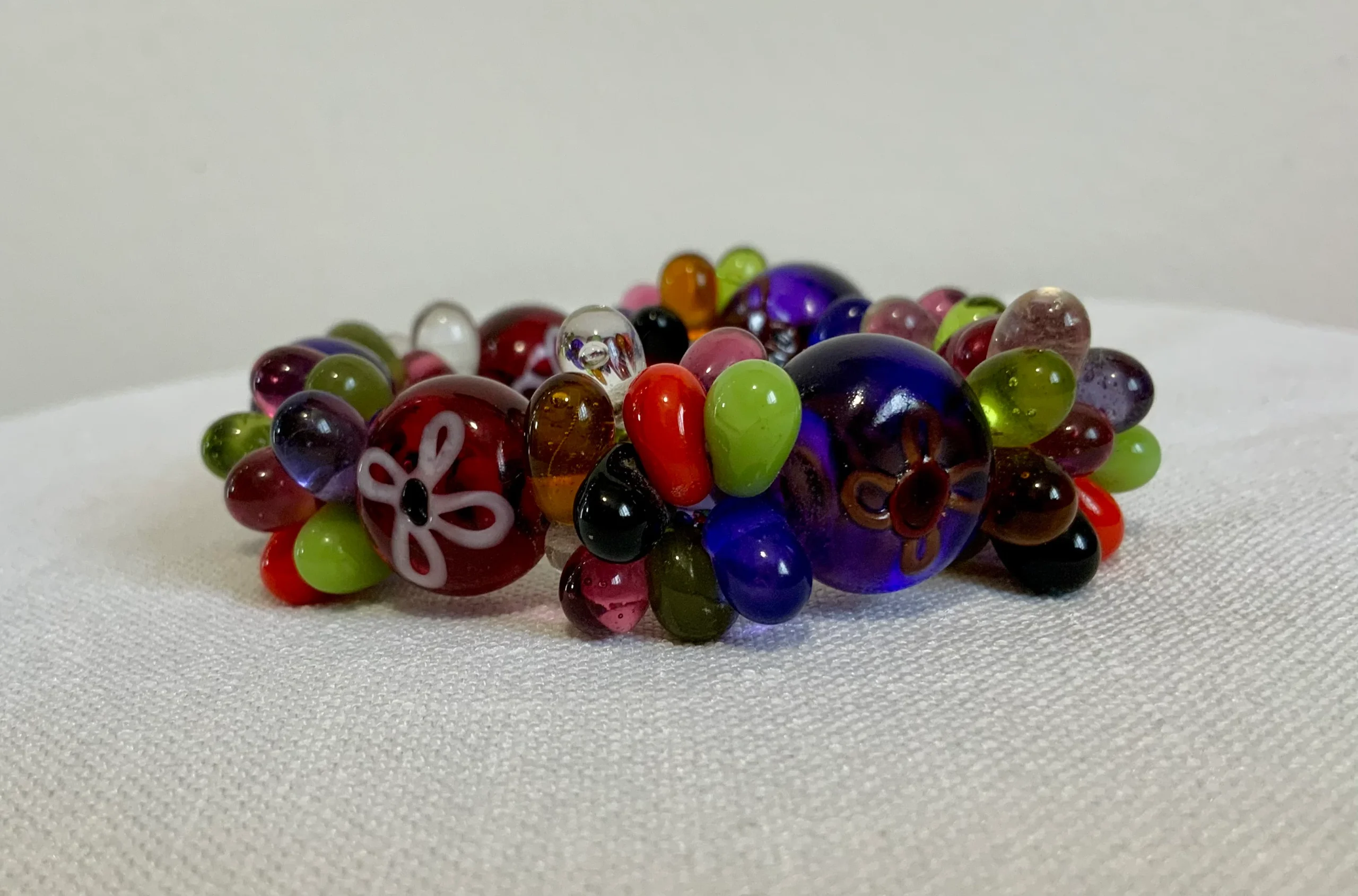 Excellent état, Bracelet élastique – De multiples couleurs opaques ou transparentes, certaines perles sont peintes avec motifs fleurs – Ses couleurs sont magiques et l’accumulation de perles donne un effet gros et transparent magnifique, belle qualité.