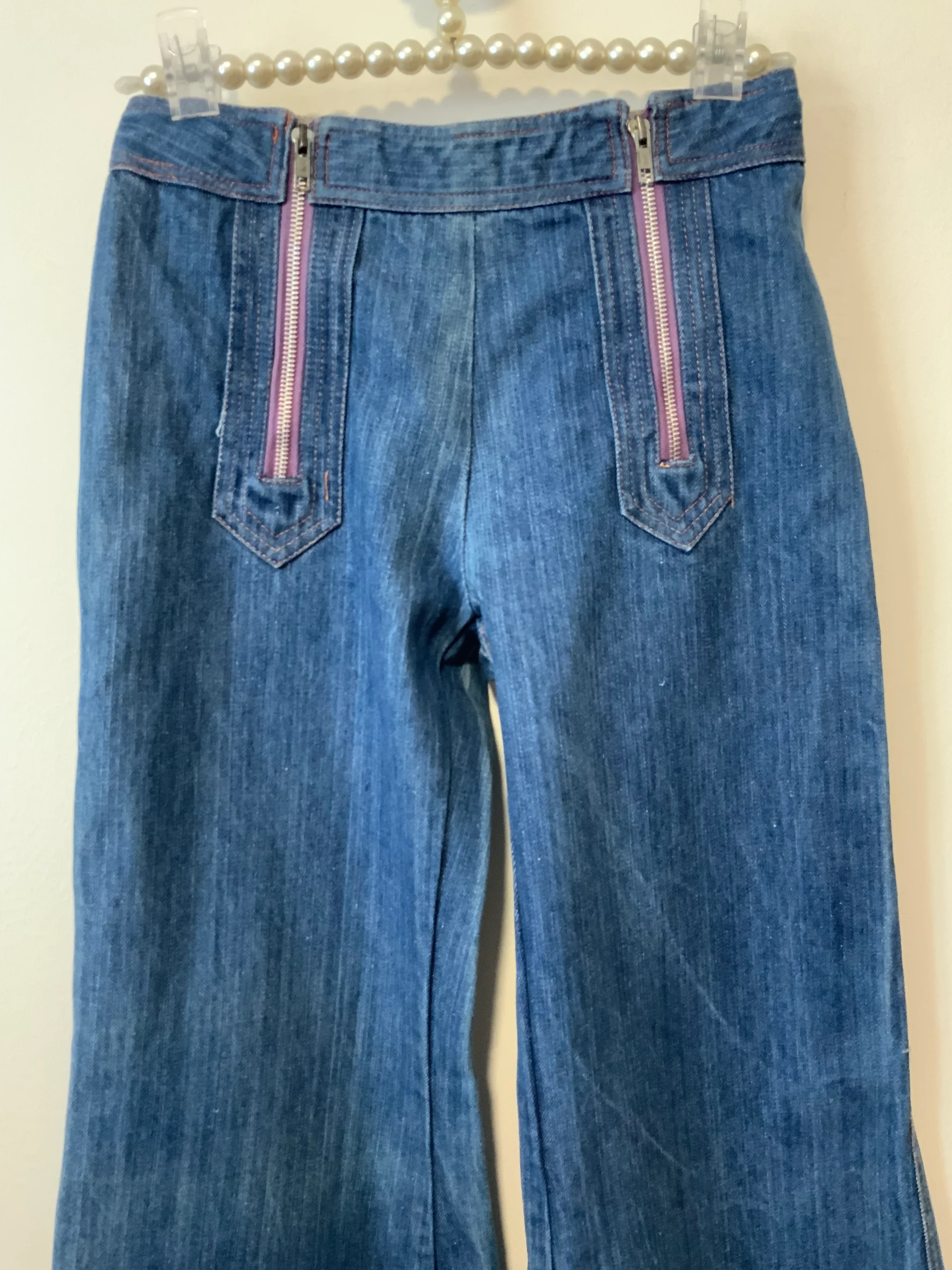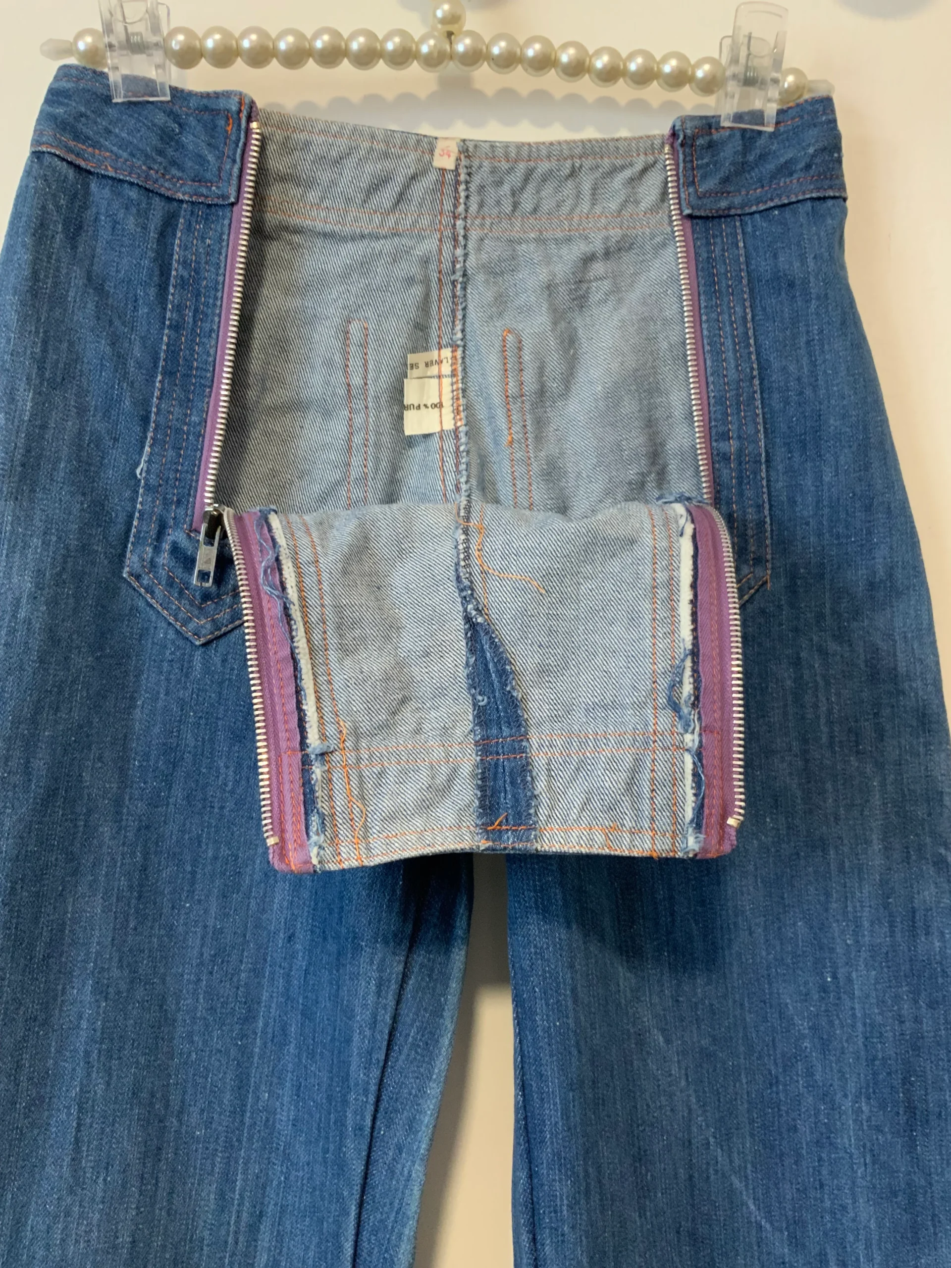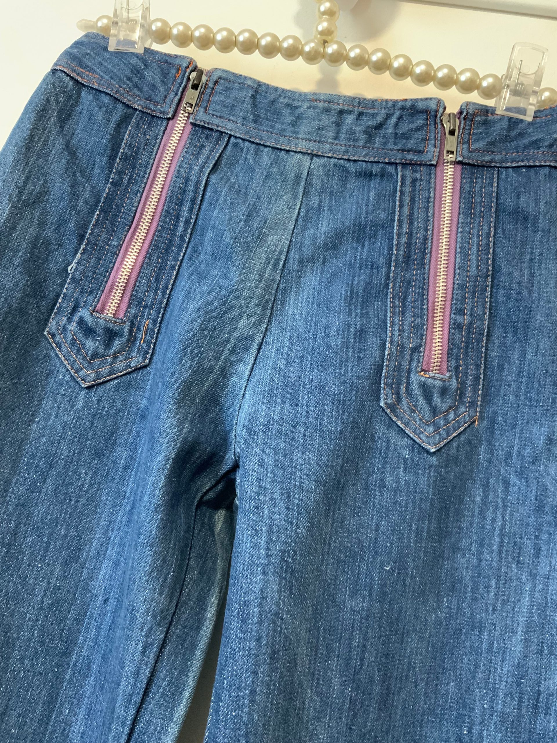 Bleu moyen – Il n’a plus ses étiquettes mais il s’agit du modèle de Jean Elvis de l’année 1975-100% en pure coton avec grands zips mauves devant et surpiqûres oranges.