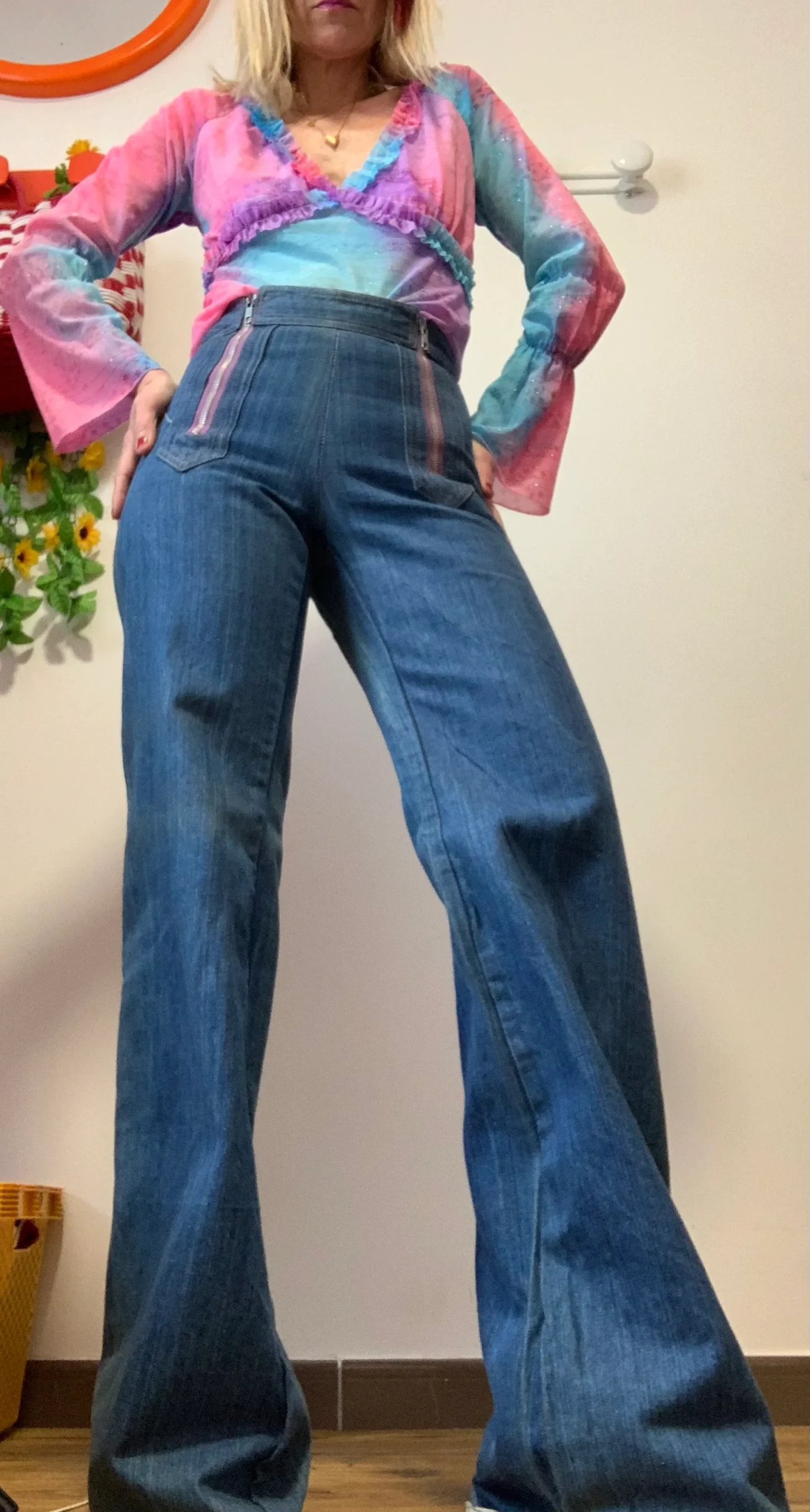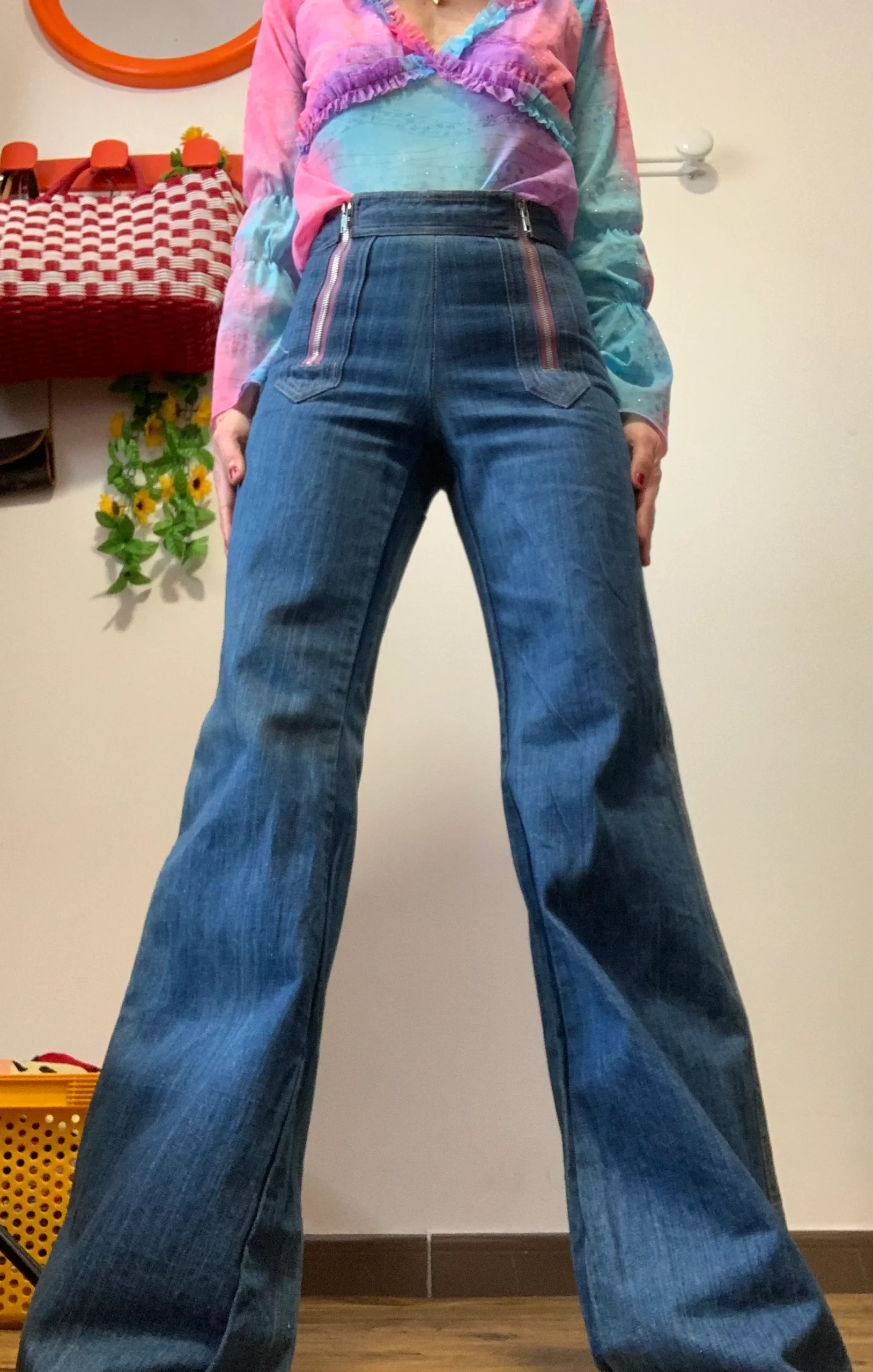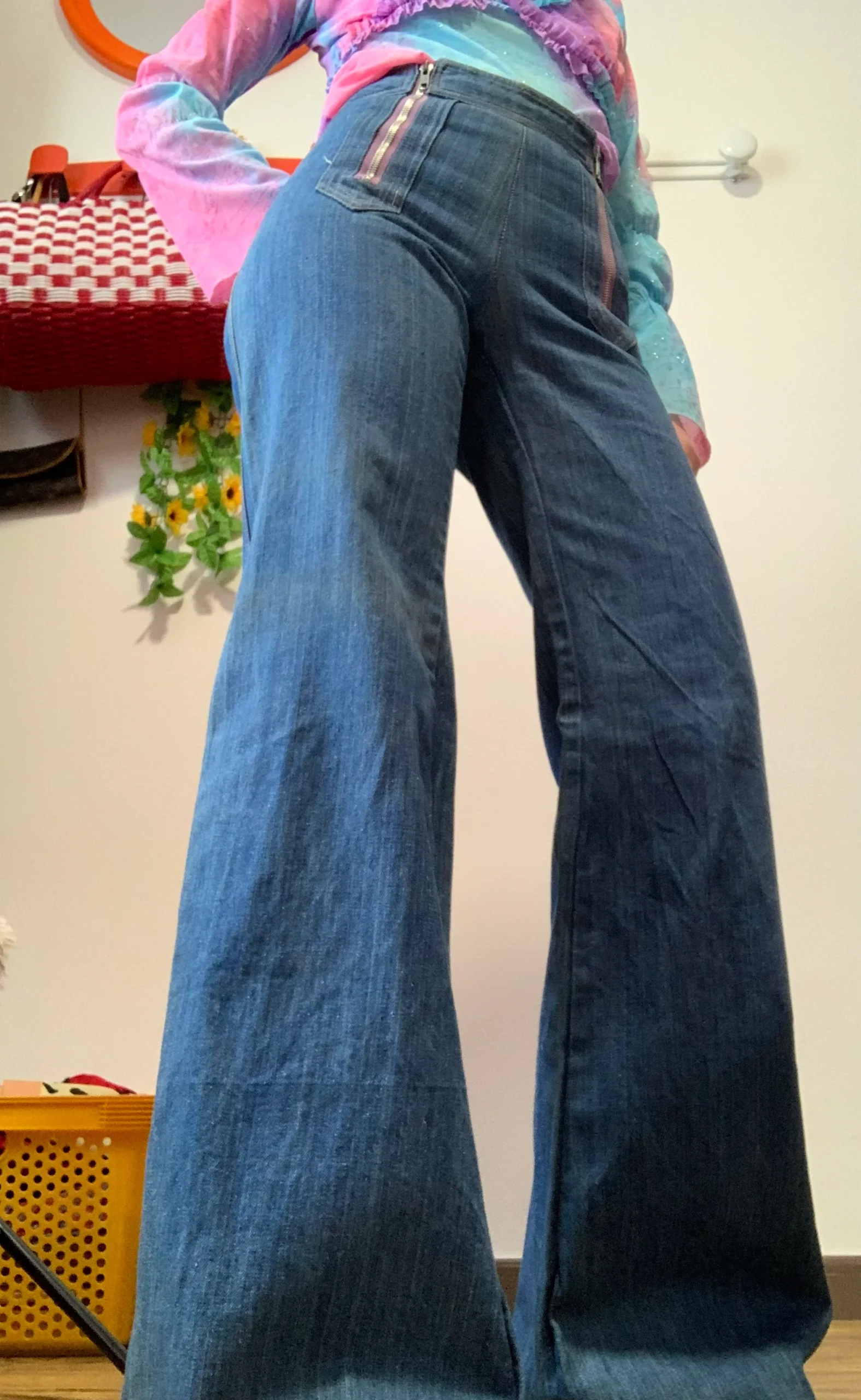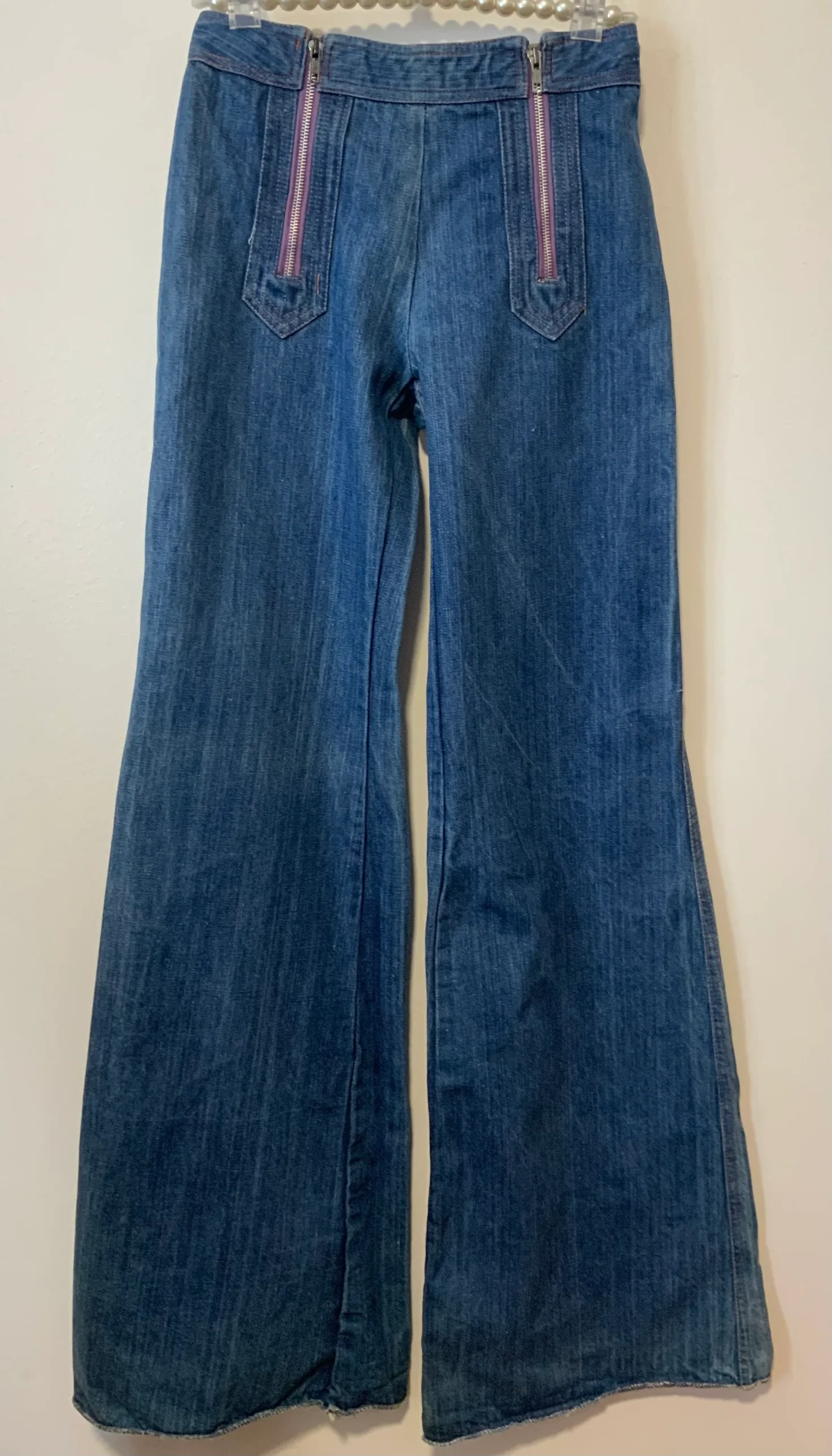 Bleu moyen – Il n’a plus ses étiquettes mais il s’agit du modèle de Jean Elvis de l’année 1975-100% en pure coton avec grands zips mauves devant et surpiqûres oranges.