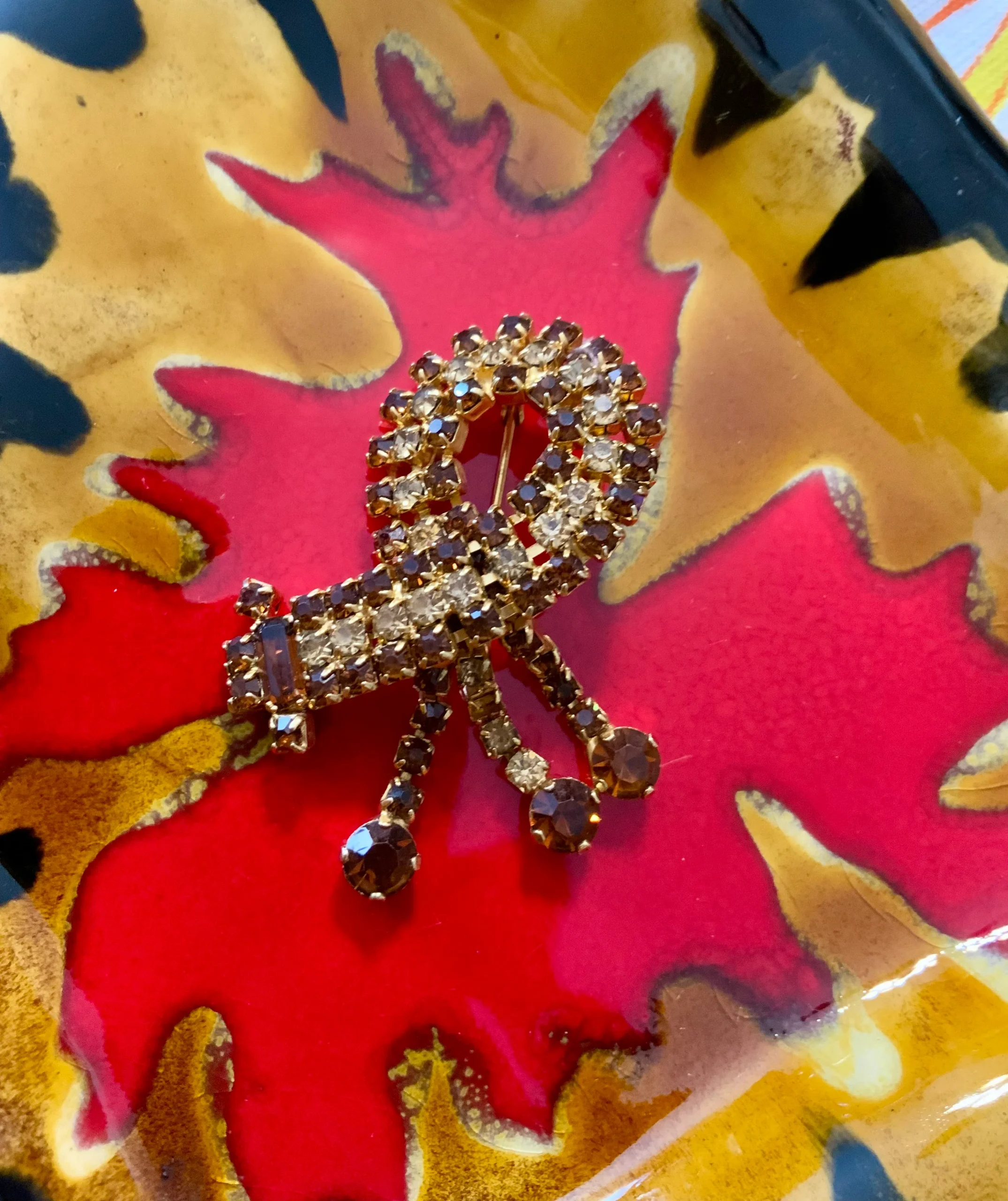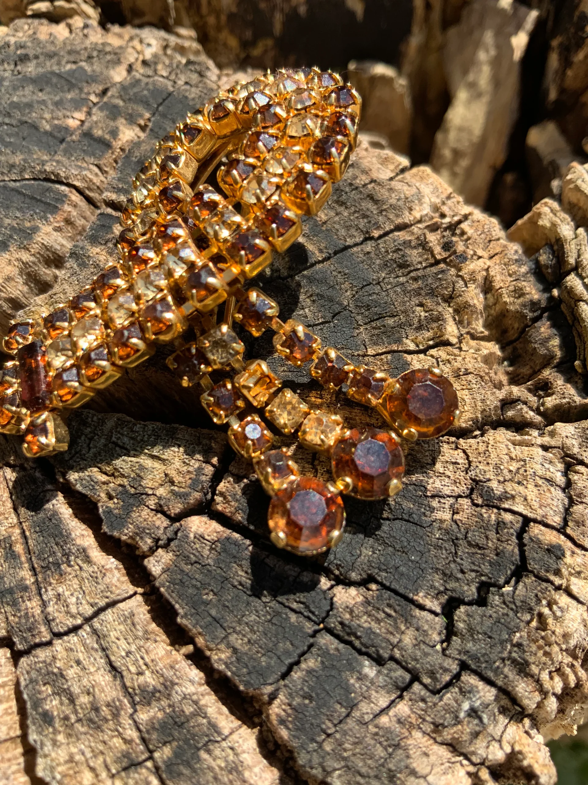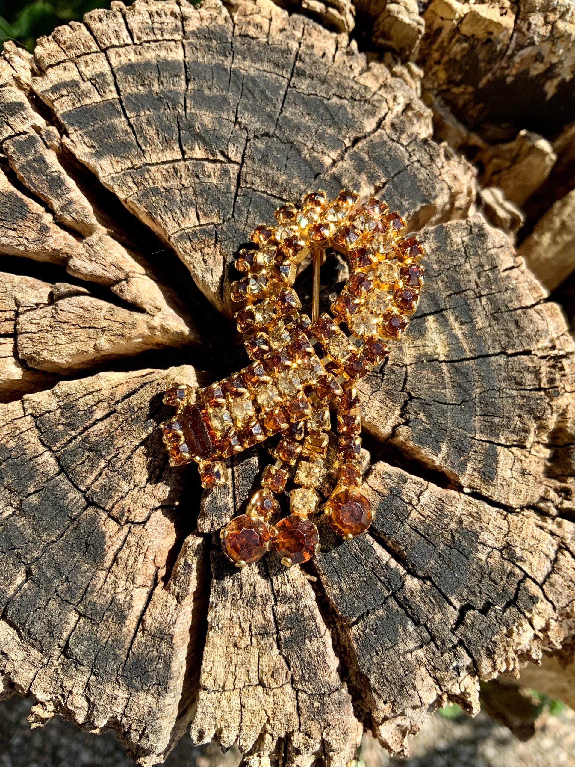 Tres belle broche ancienne Vintage en métal doré et pierres beiges et marrons clairs.