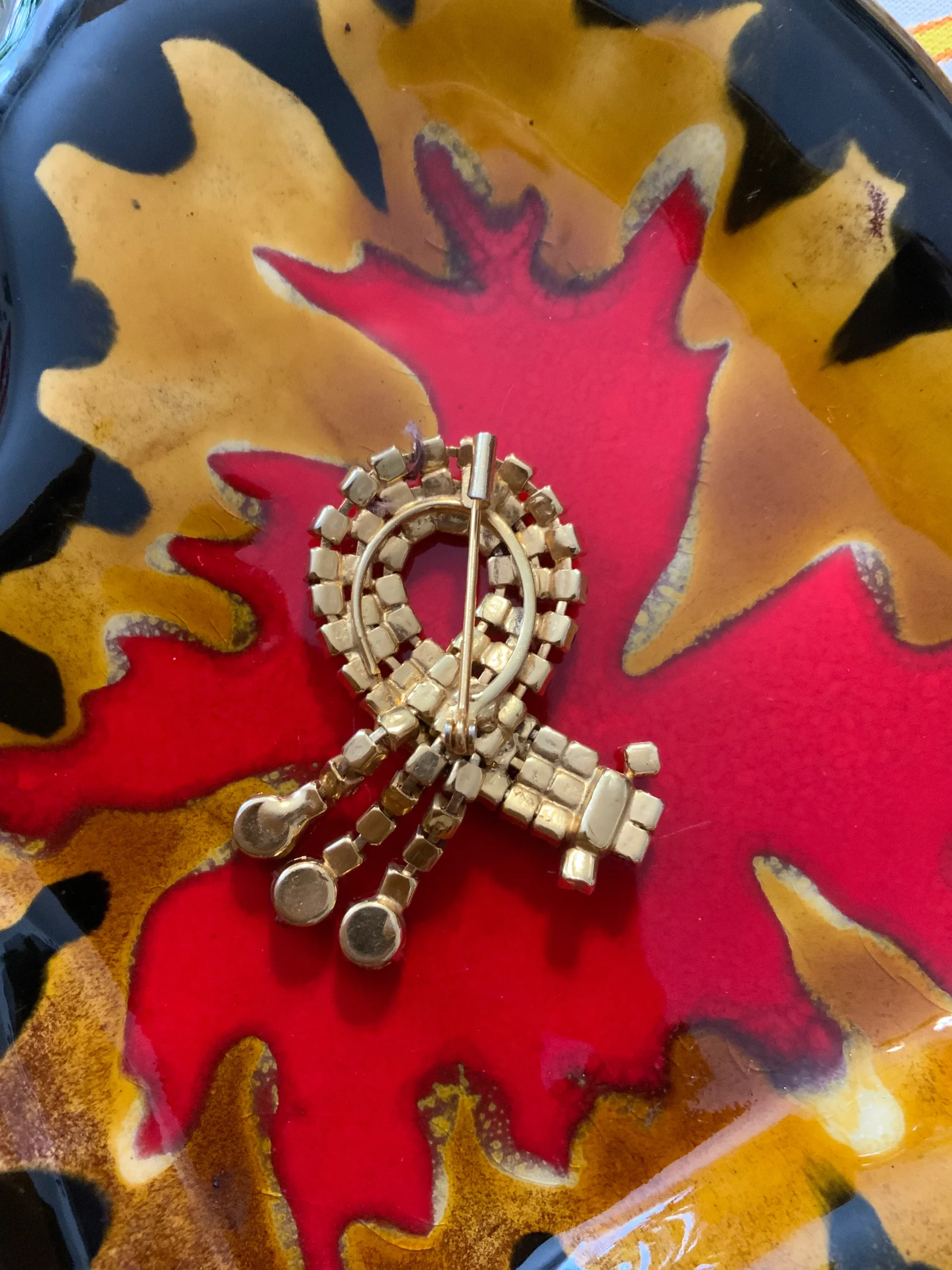 Manque juste une pierre sur 1 des pendants, son prix en est fonction, cela ne se voit pas car c est tout en haut et les pendants bougent.