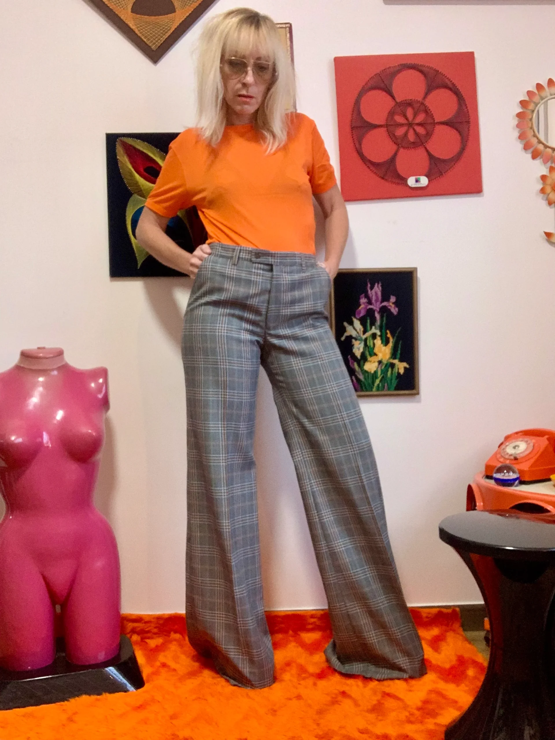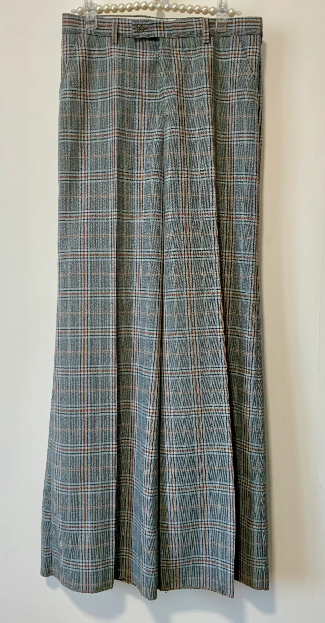 Pantalon flare 70’s à carreaux, taille haute, poches, issu d’un dead stock, comme neuf. Avec son étiquette- Etat neuf Pattes d’elephant 1970.