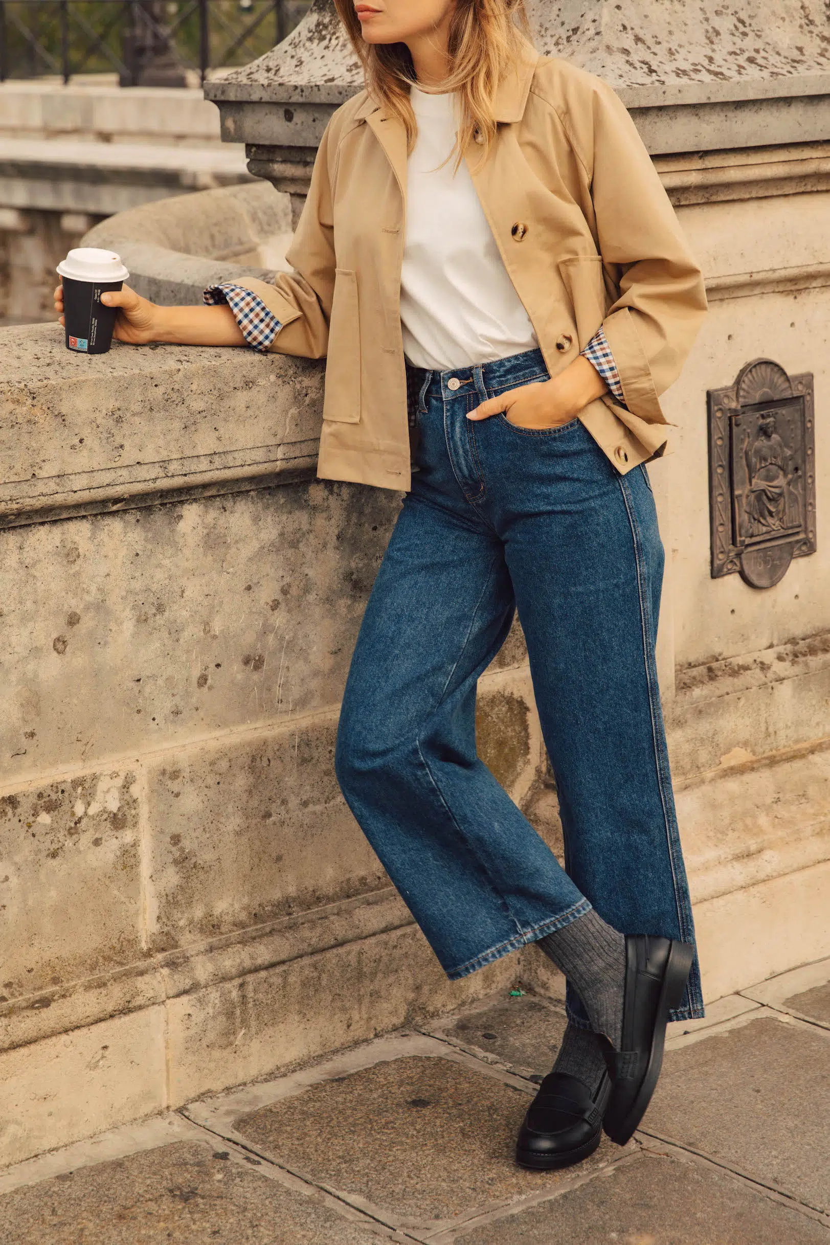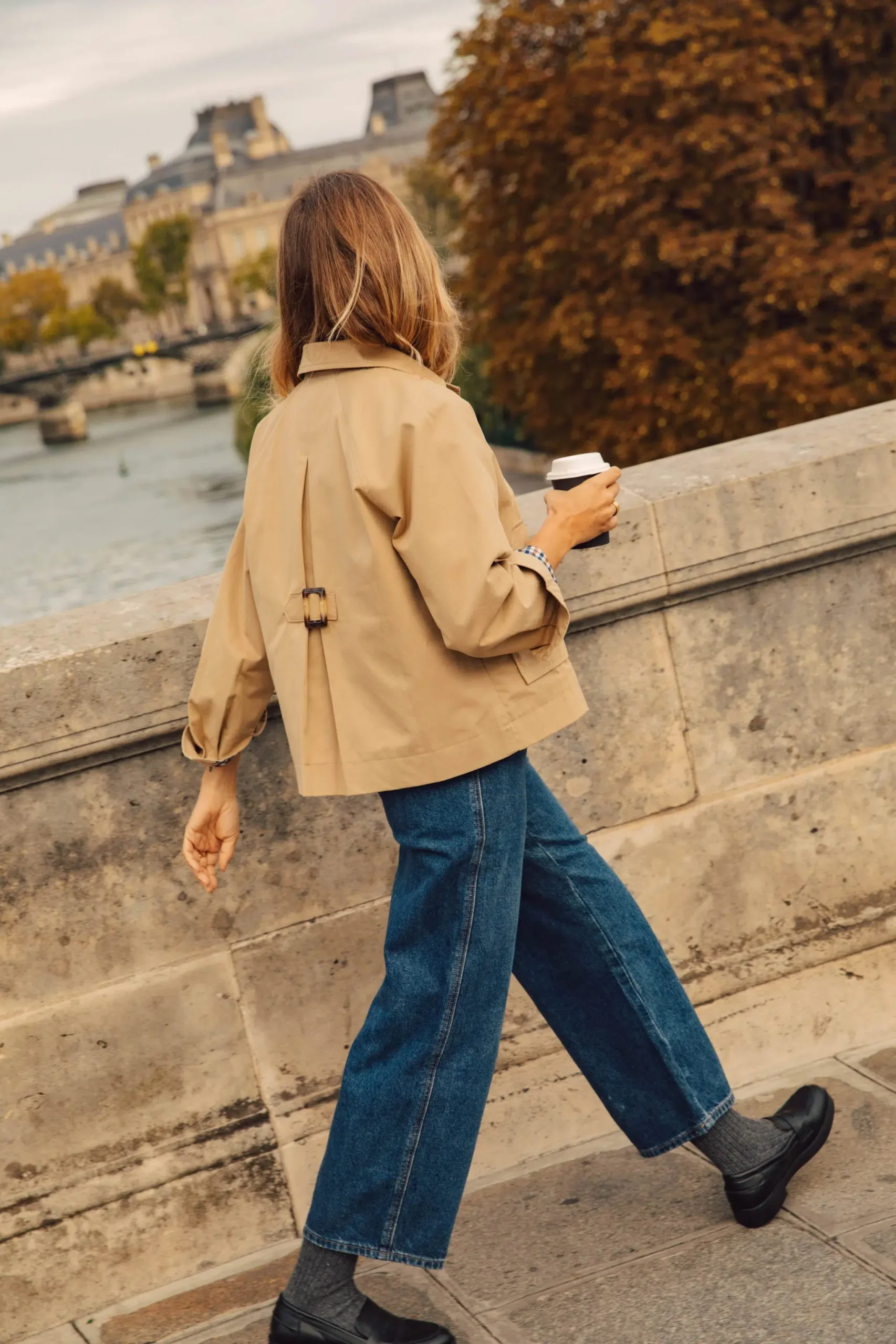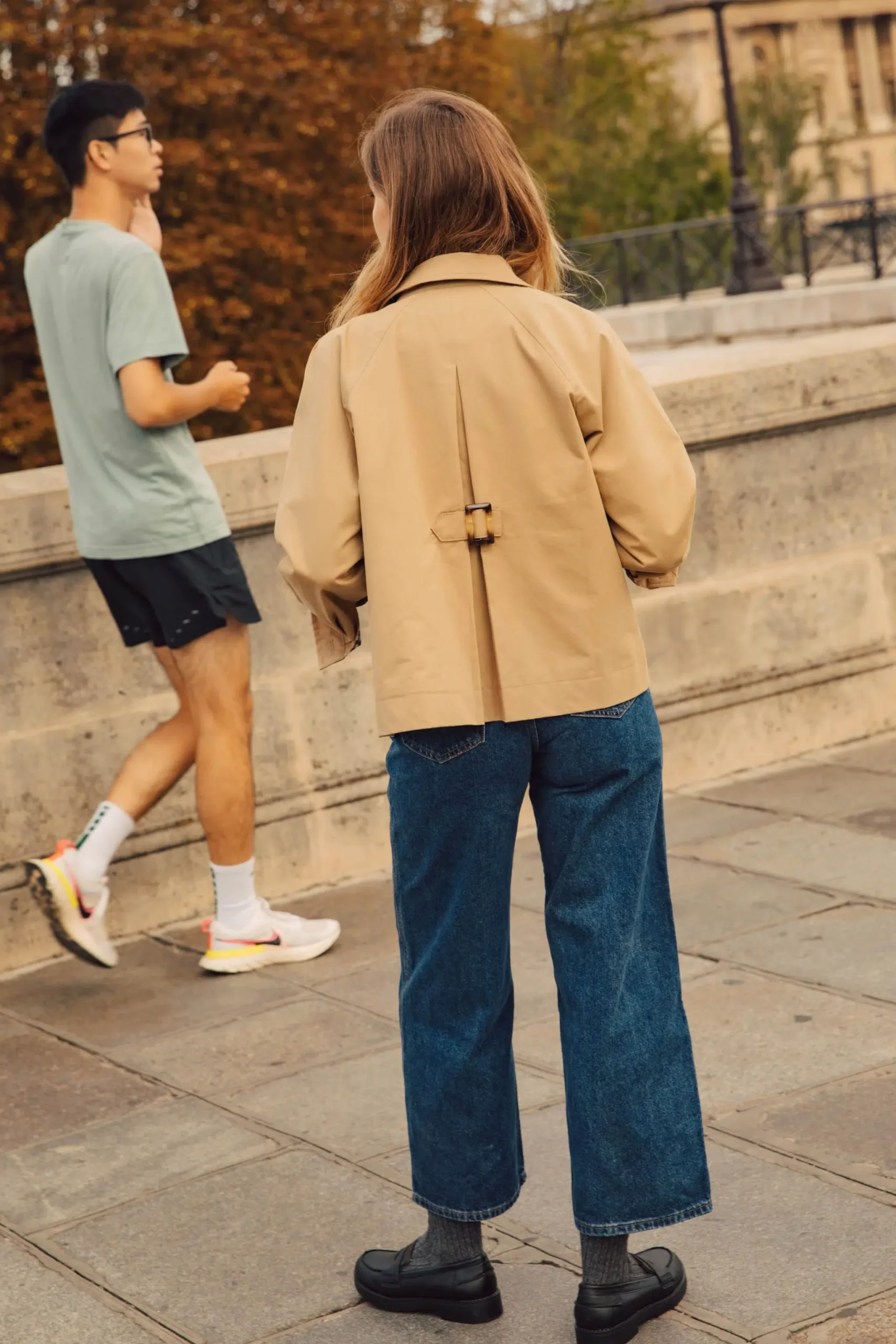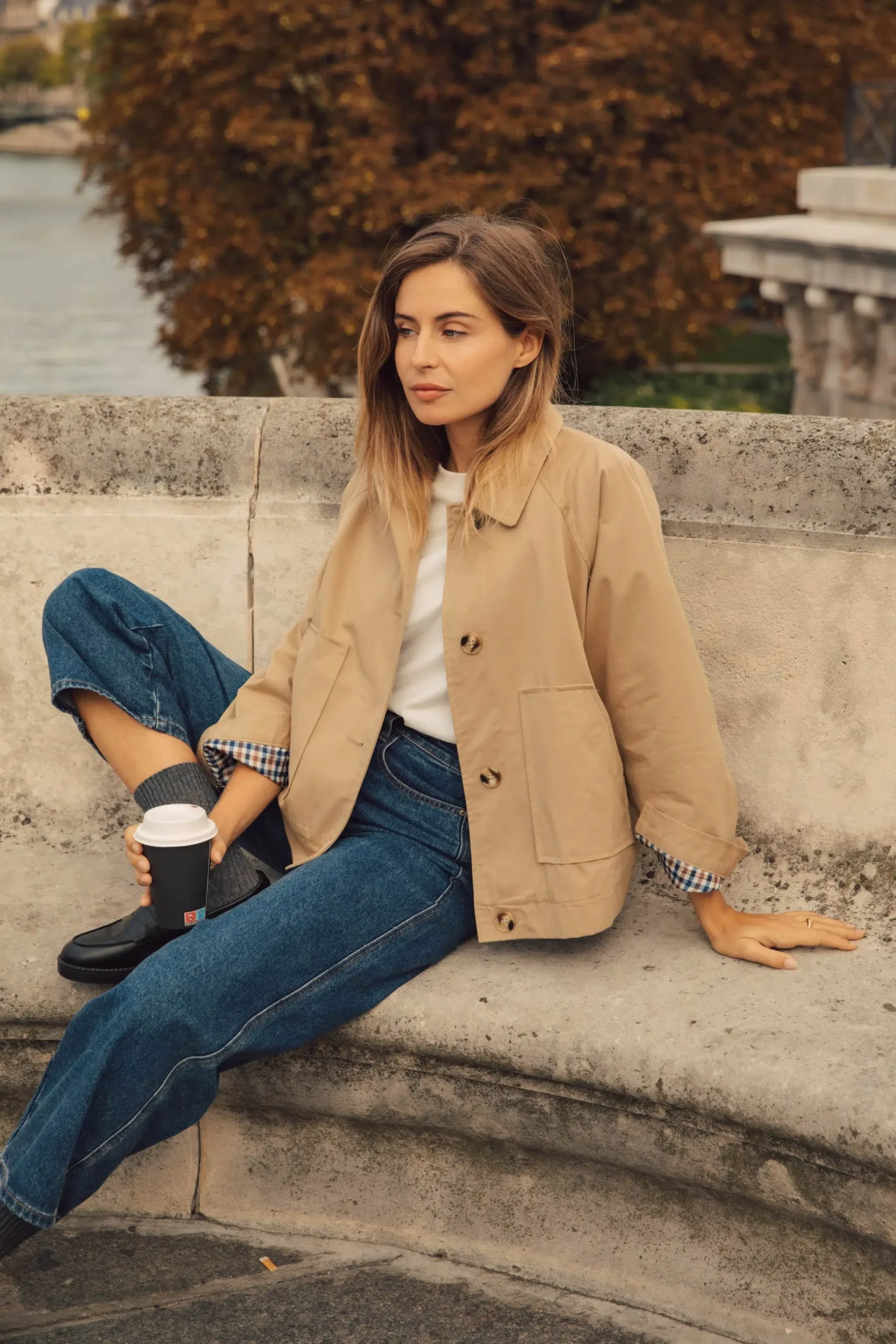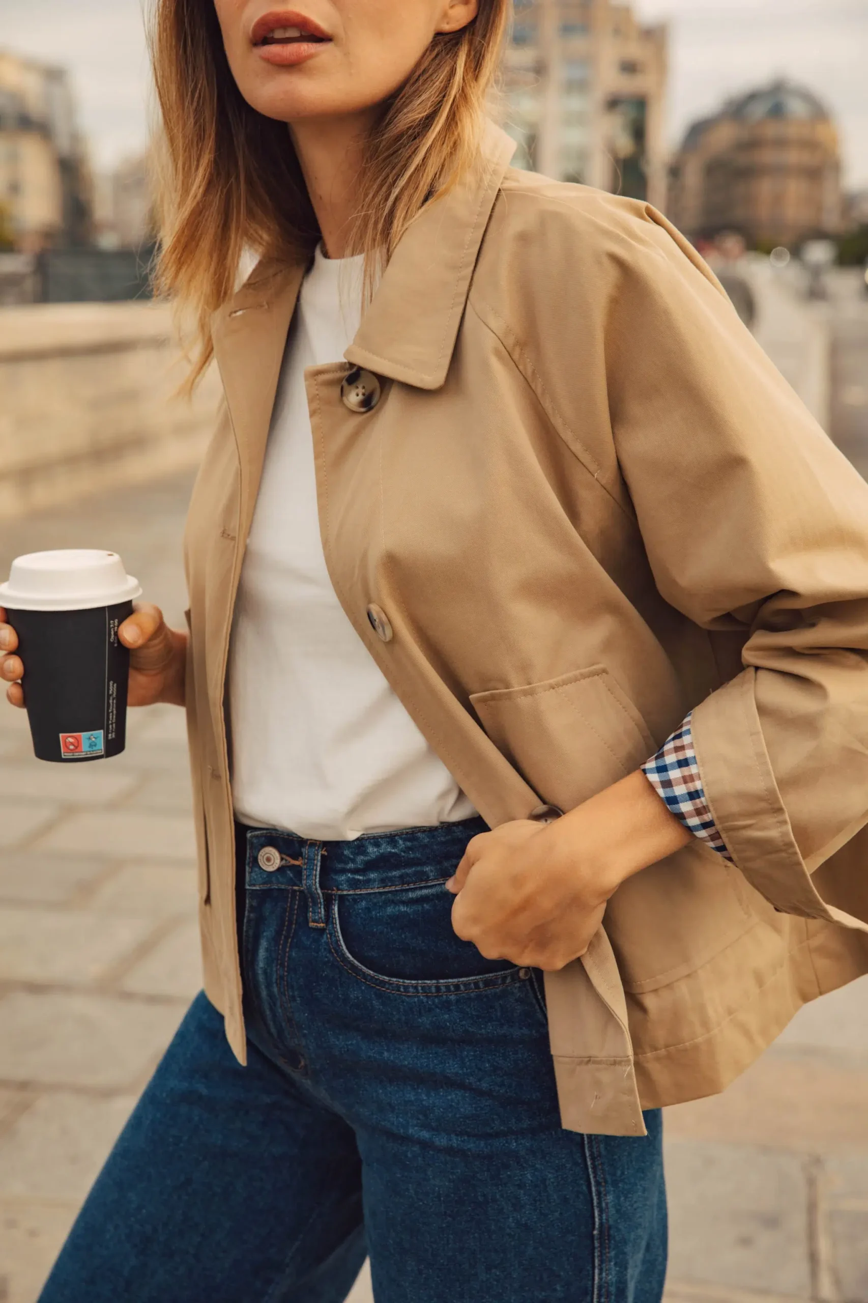 [vc_row][vc_column][vc_column_text css=””]- Trench court – Fermeture par boutons – Deux poches plaquées – Doublure vichy – Couleur : beige