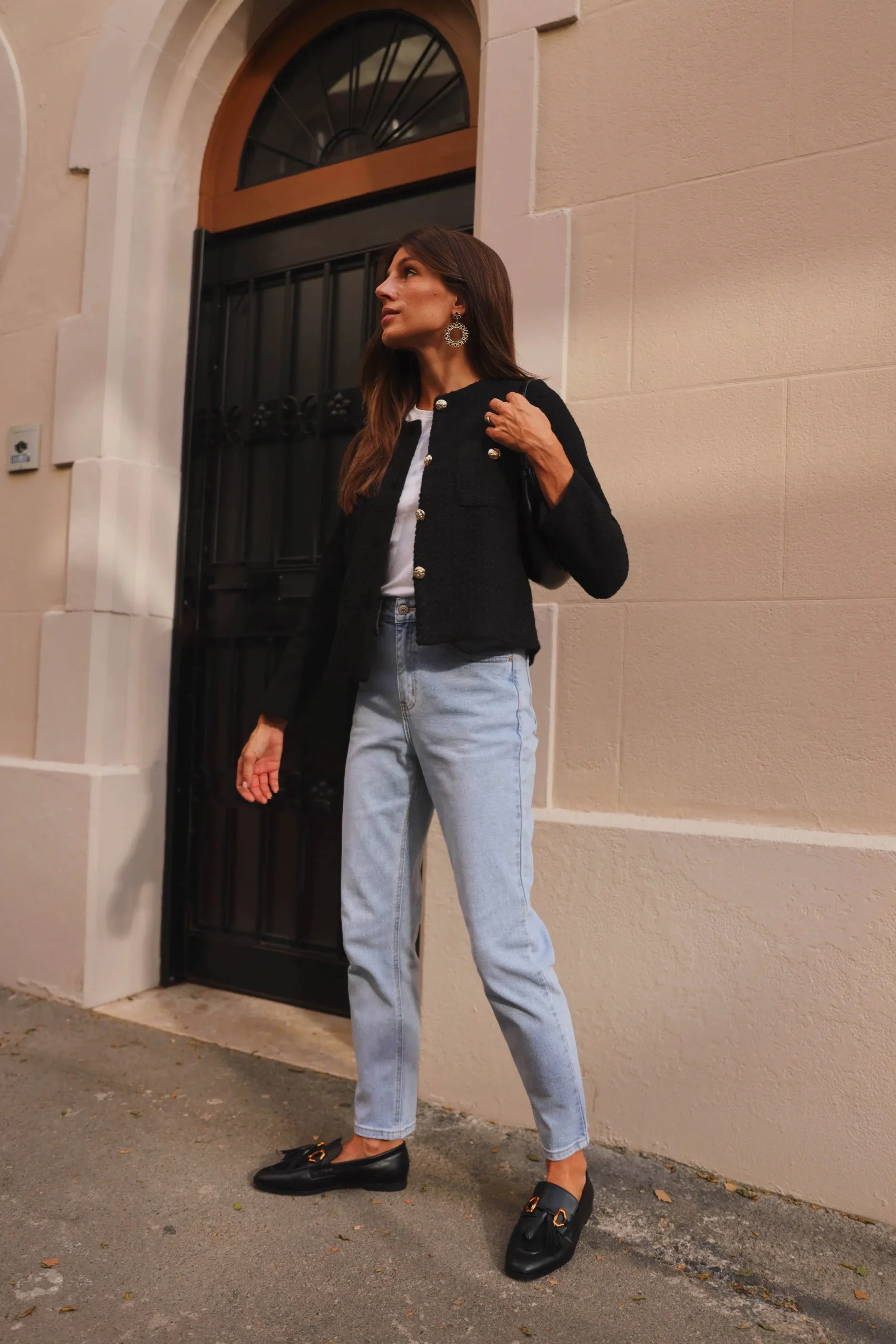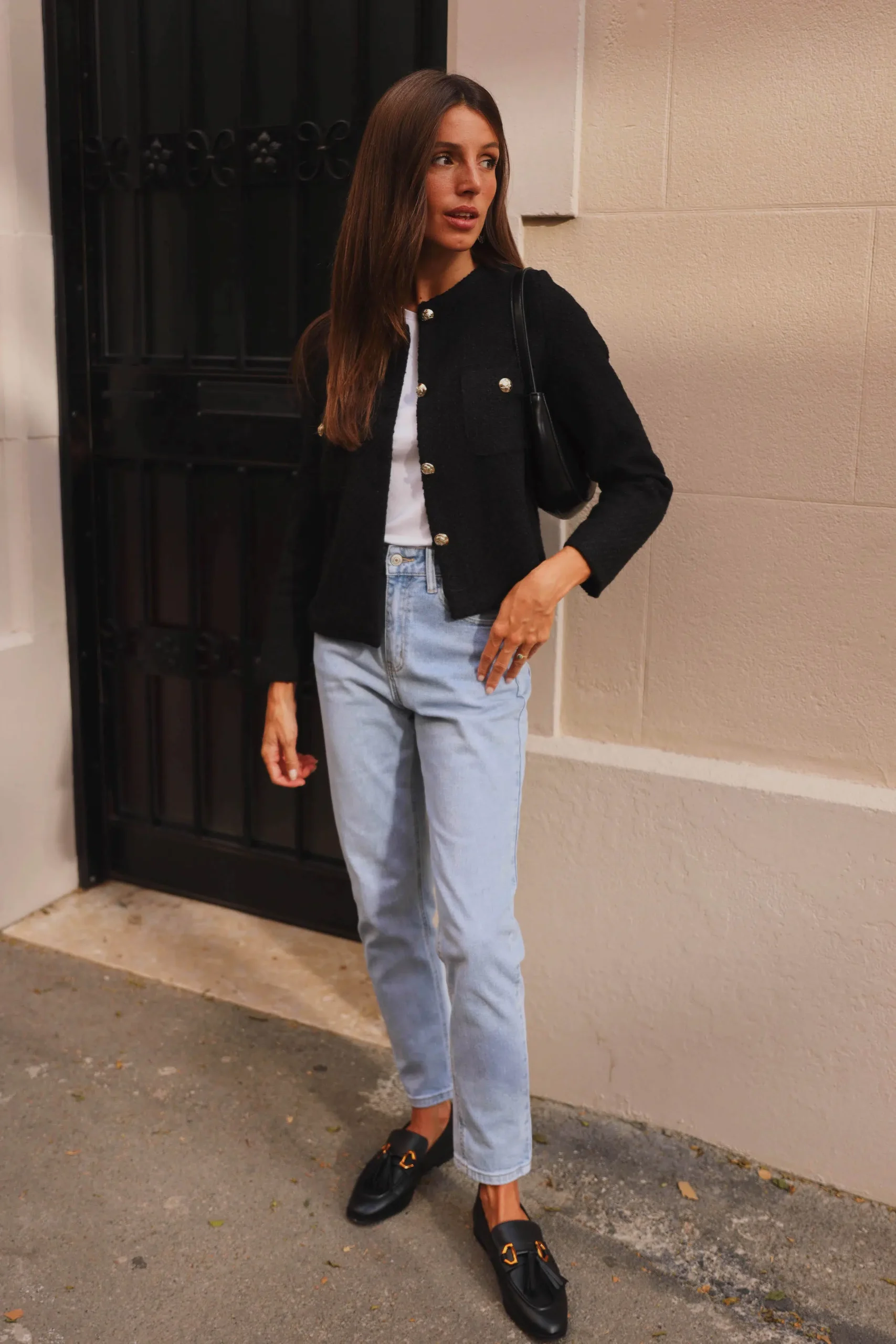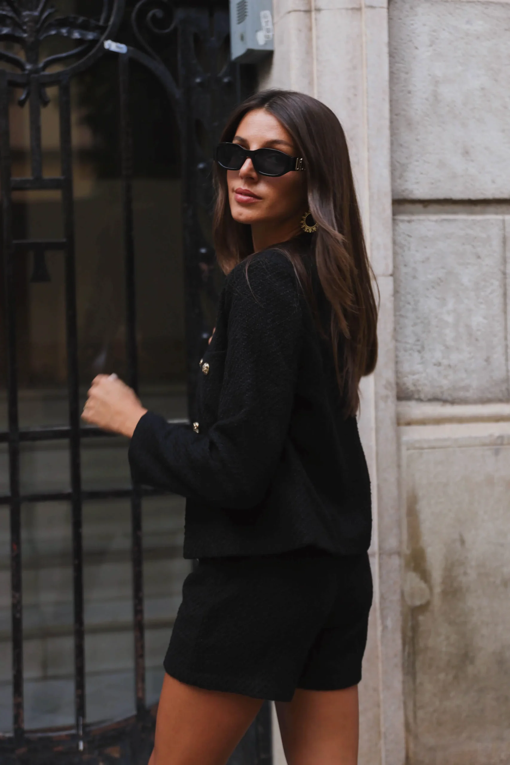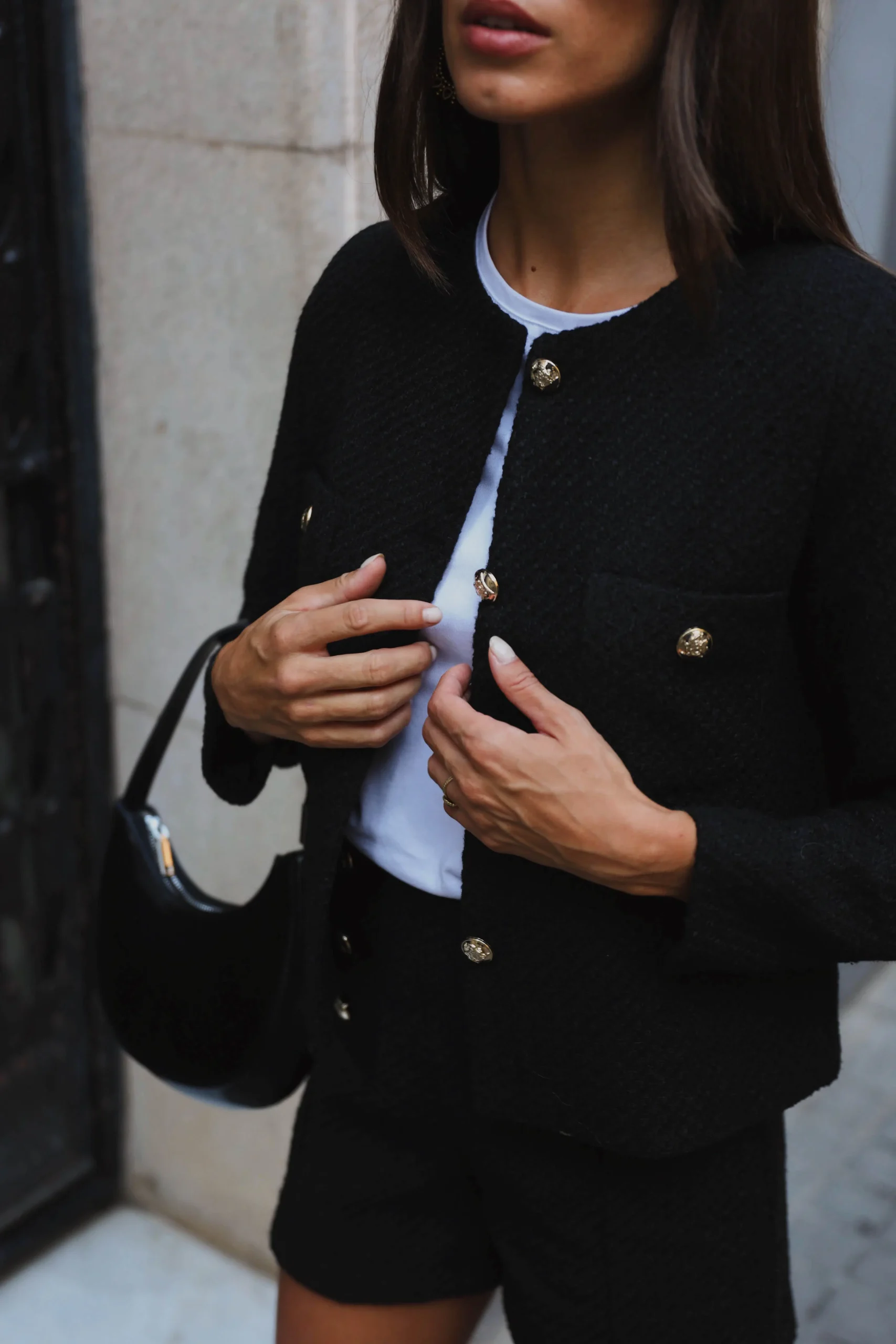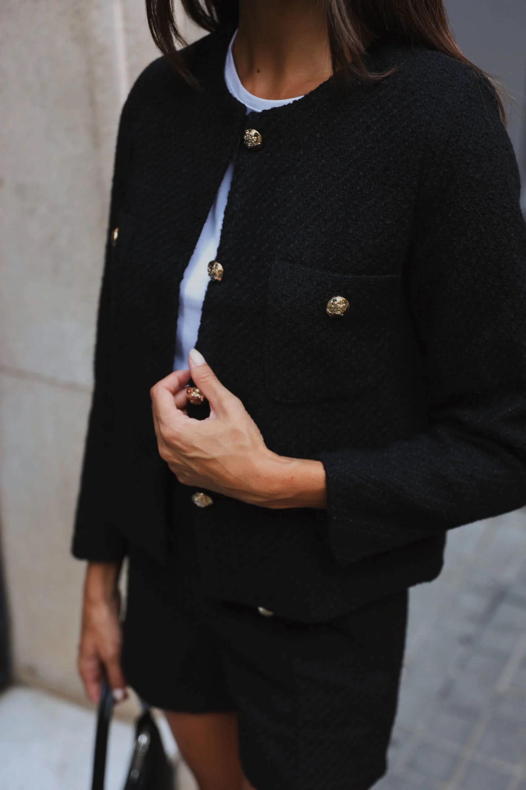 – Veste tweed – Fermeture par boutons dorés – Deux poches à l’avant – Doublée – Fines épaulettes