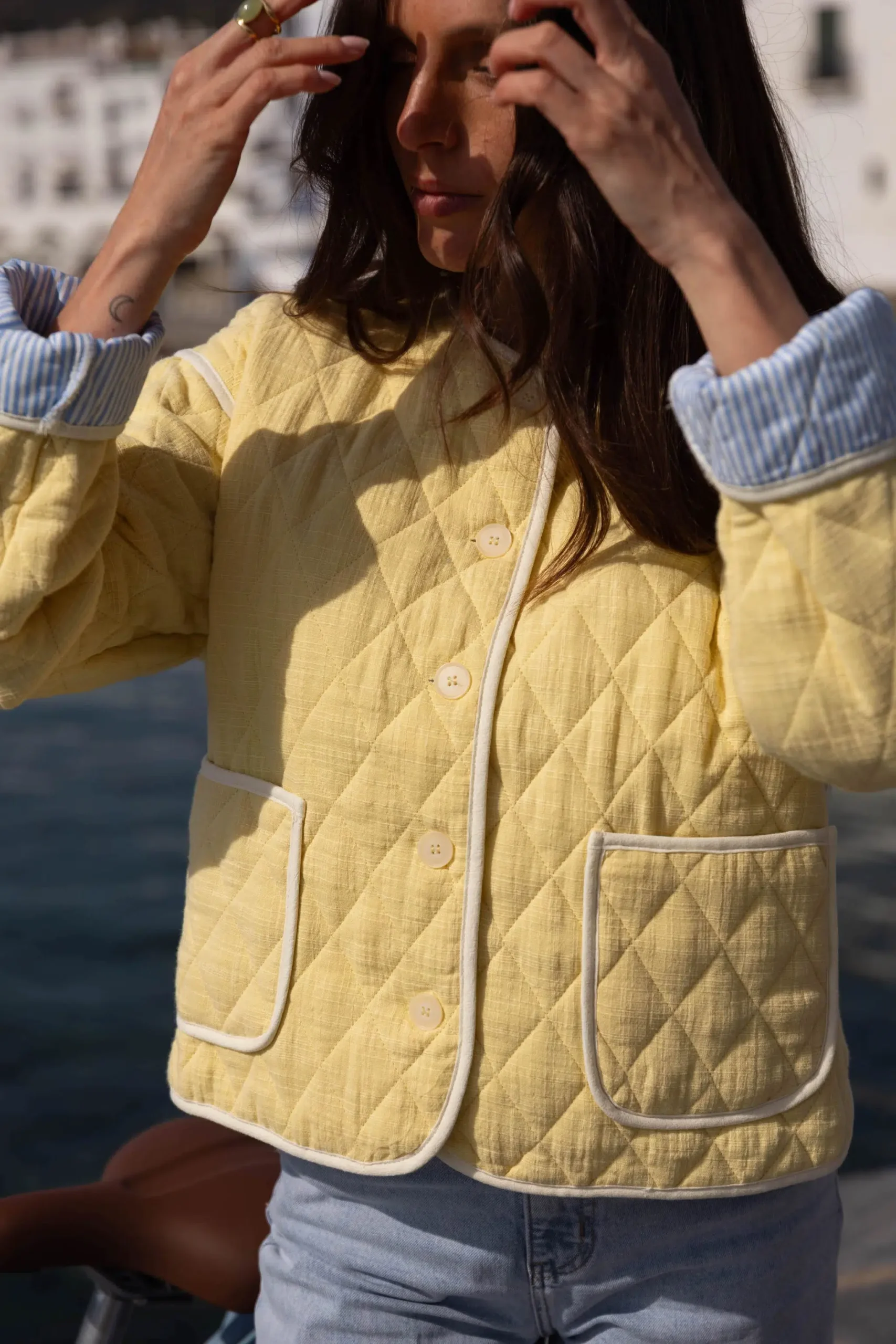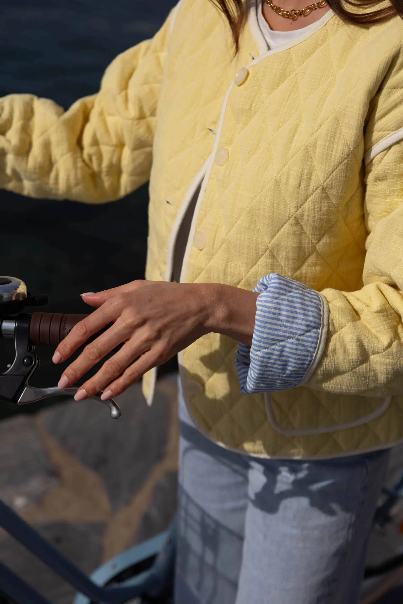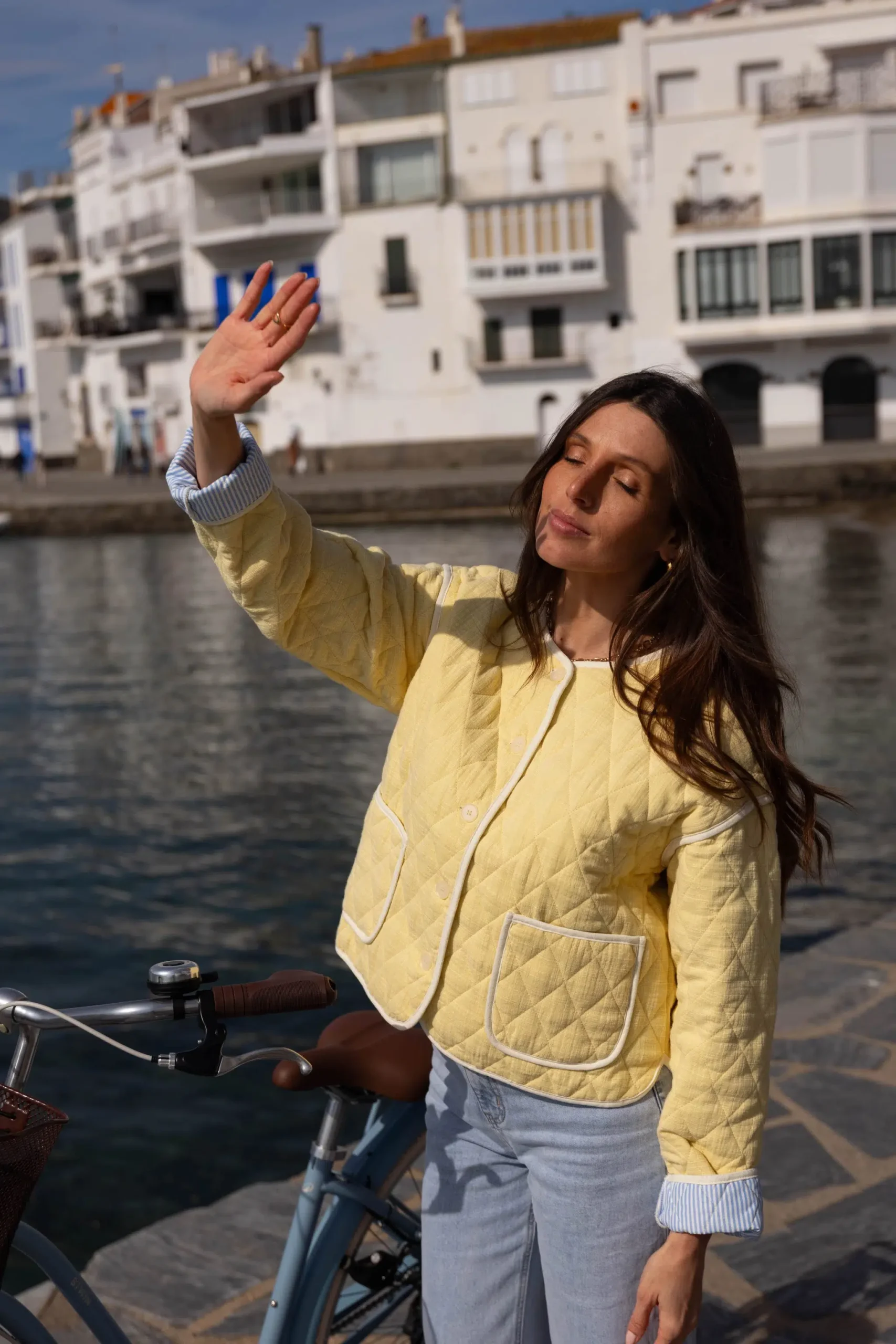 – Veste matelassée – Fermeture par boutons tout le long sur le devant – Deux poches plaquées devant – Intérieur rayé bleu et blanc – Couleur : jaune
