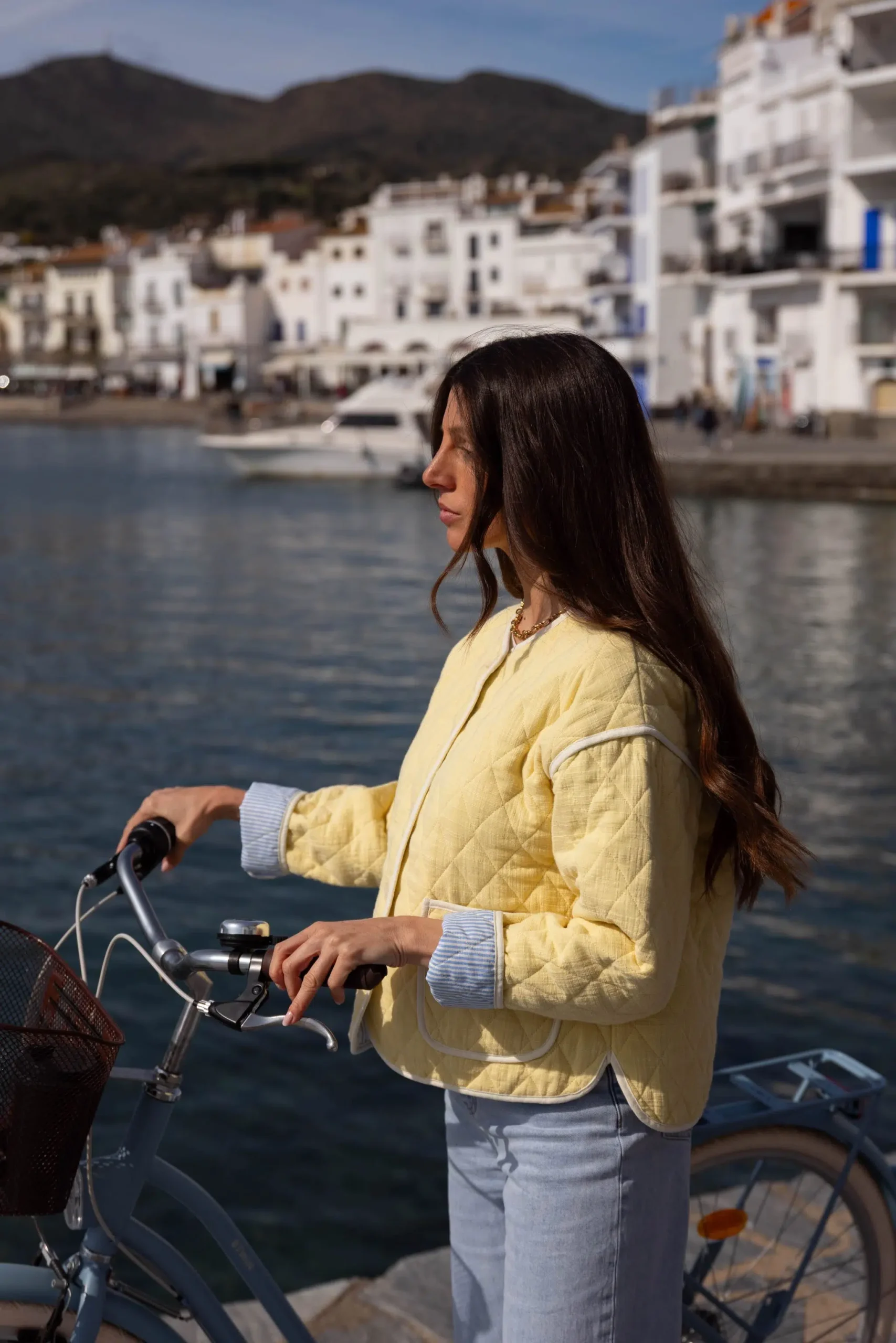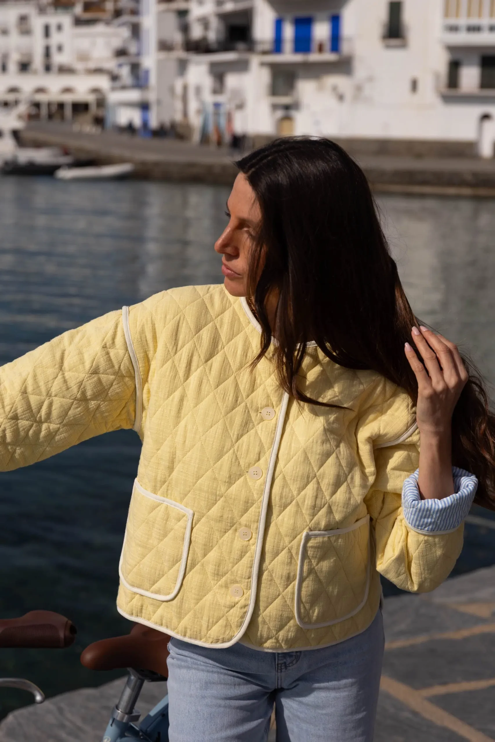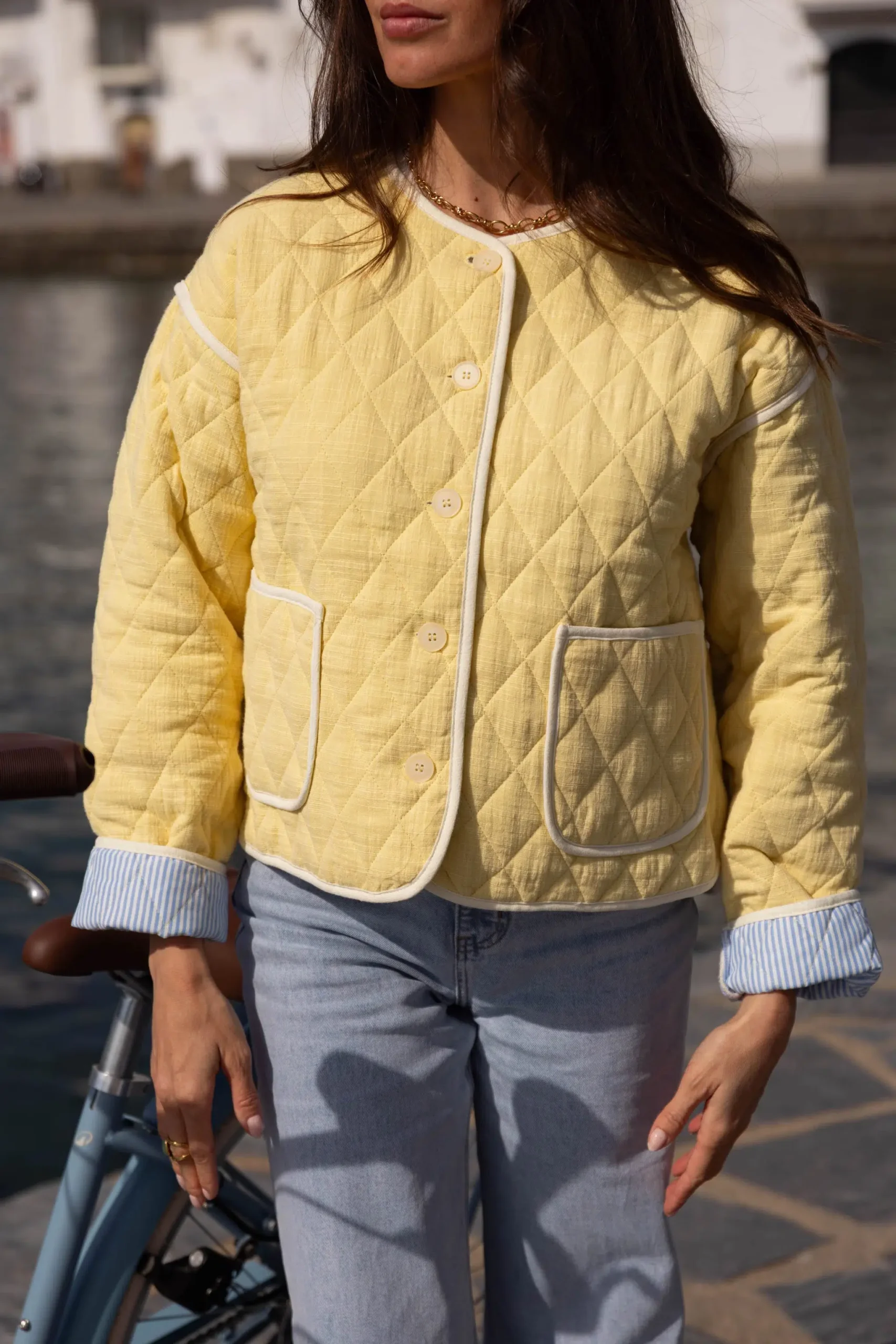 – Veste matelassée – Fermeture par boutons tout le long sur le devant – Deux poches plaquées devant – Intérieur rayé bleu et blanc – Couleur : jaune