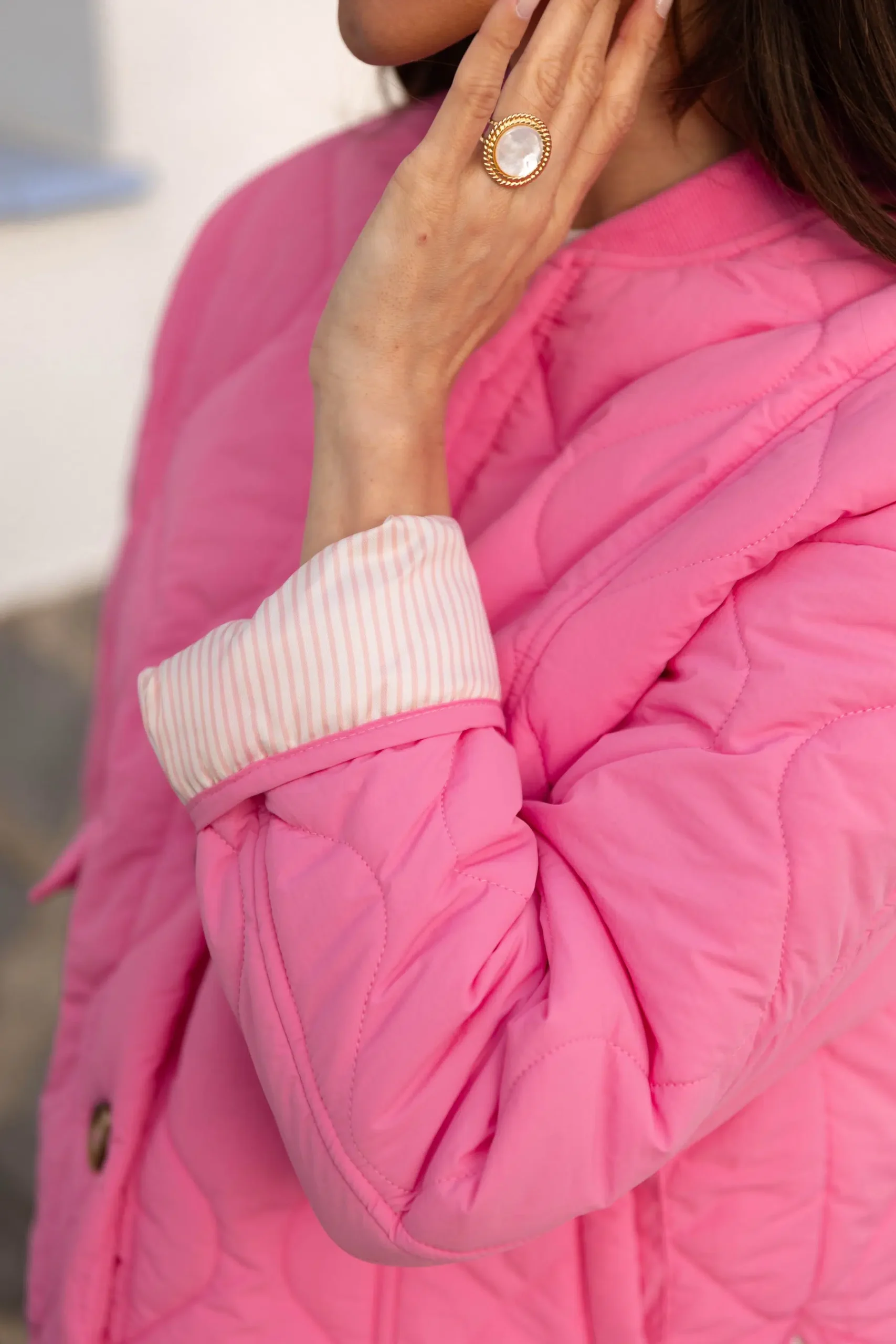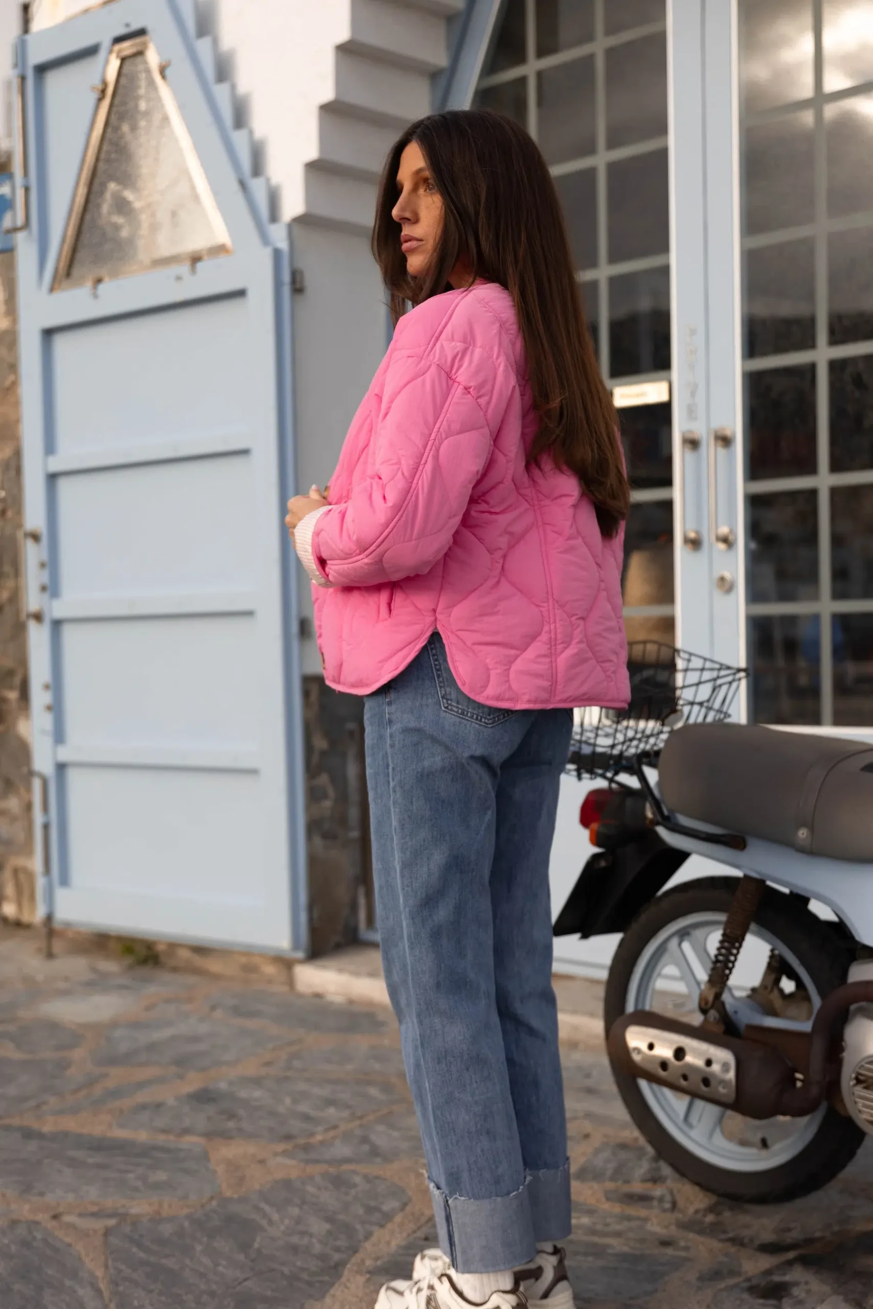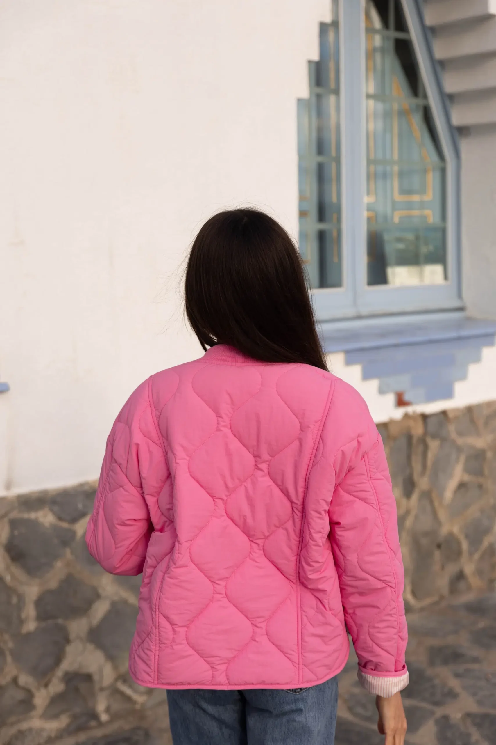 – Blouson matelassé – Fermeture par boutons sur le devant – Deux poches à l’avant – Doublure imprimé blanc et rose – Couleur : rose