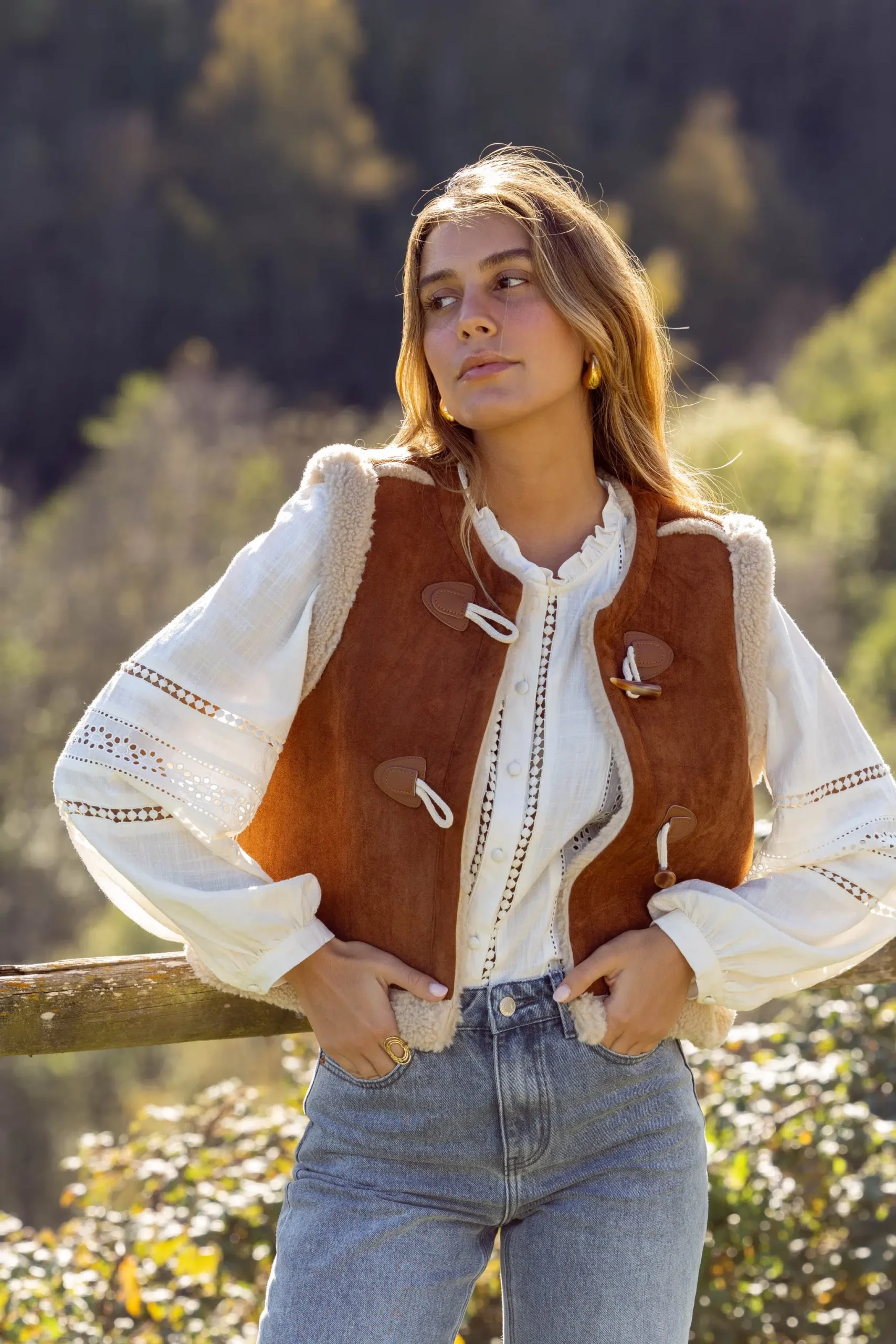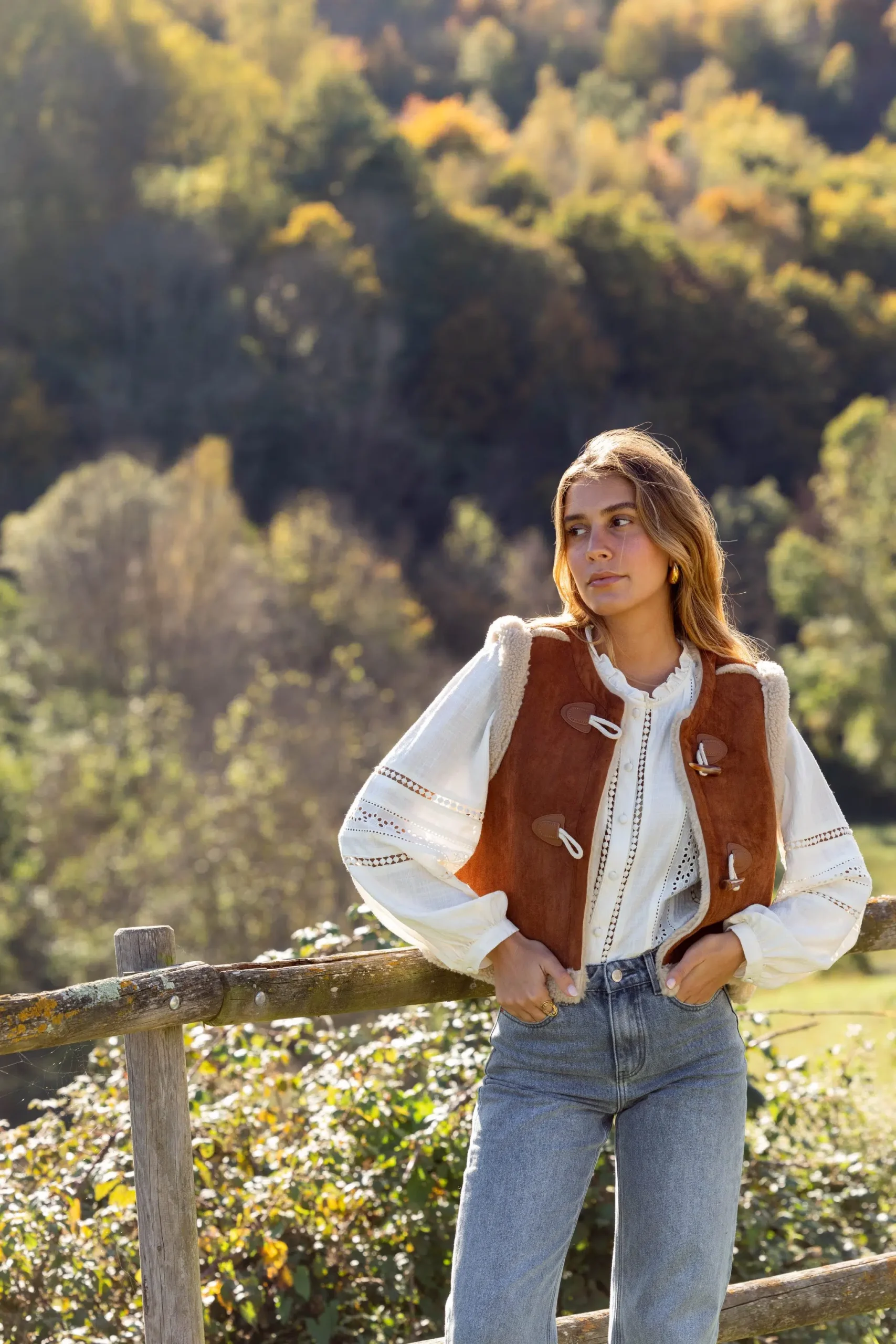 – Gilet sans manche – Fermeture par boutons – Intérieur effet mouton – Couleur : camel et beige